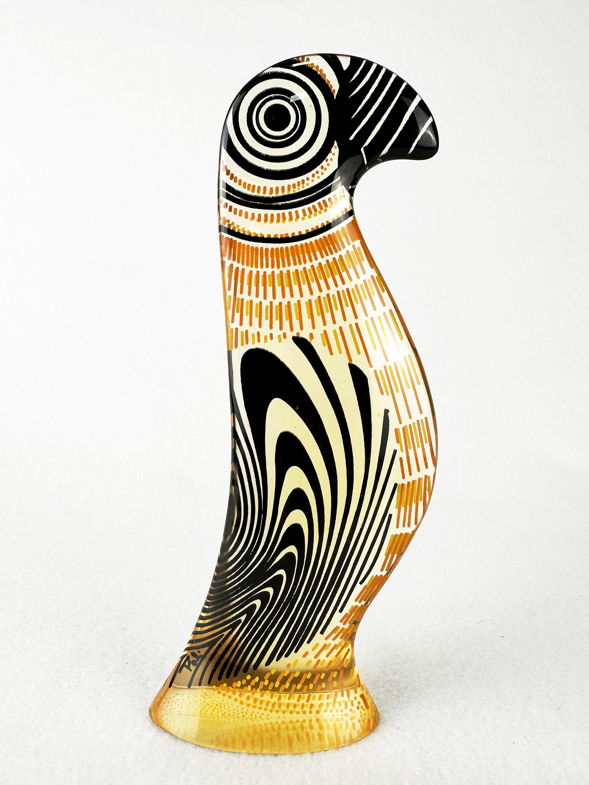 PALATNIK "CORUJA" Escultura-Arte Cinética -Med: 11 x 7 cm -Assinada "Pal" -Escultura produzida em resina de poliéster com filme colorido "preto e amarelo" na sua parte interna. Excelente estado de conservação, sem lascados ou bicados. Manufatura: Abraham Palatnik.