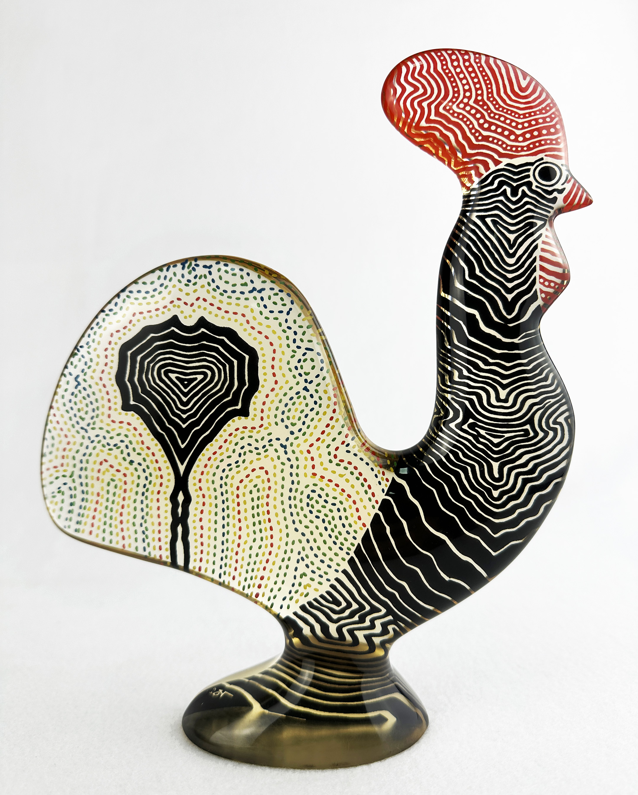 PALATNIK "UNICÓRNIO" Escultura-Arte Cinética -Assinada "Pal" -Med: 10 x 9 cm -Escultura produzida em resina de poliéster com filme colorido "preto e vermelho" na sua parte interna. Excelente estado de conservação, sem lascados ou bicados. Manufatura: Abraham Palatnik.