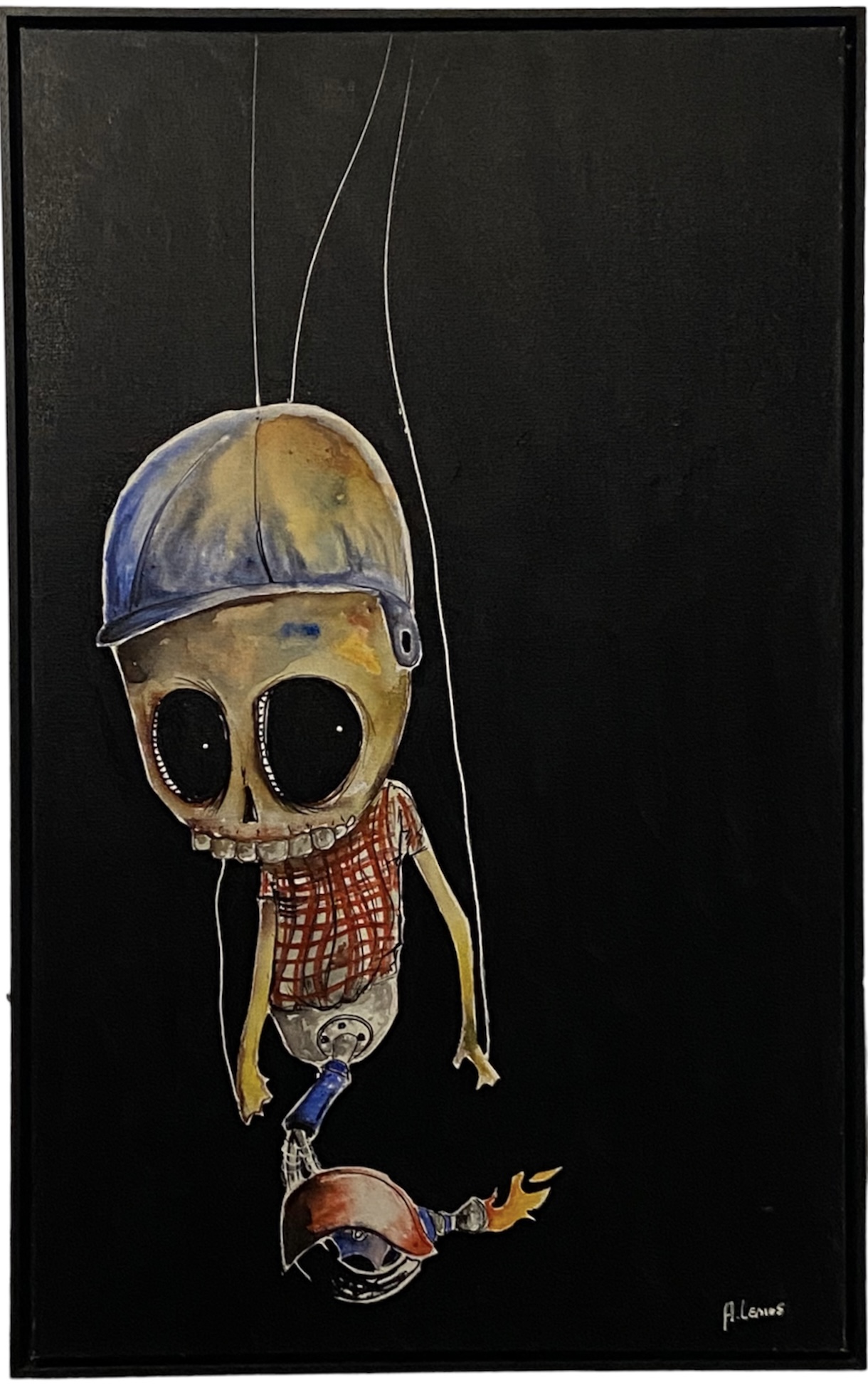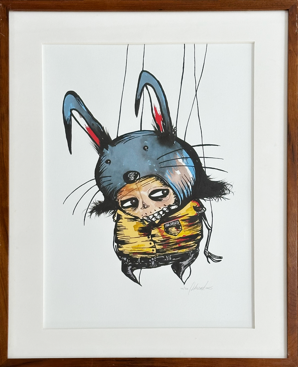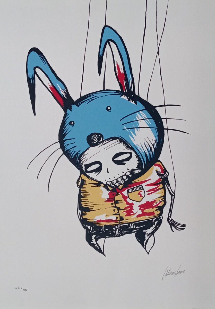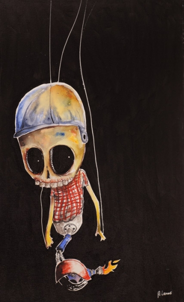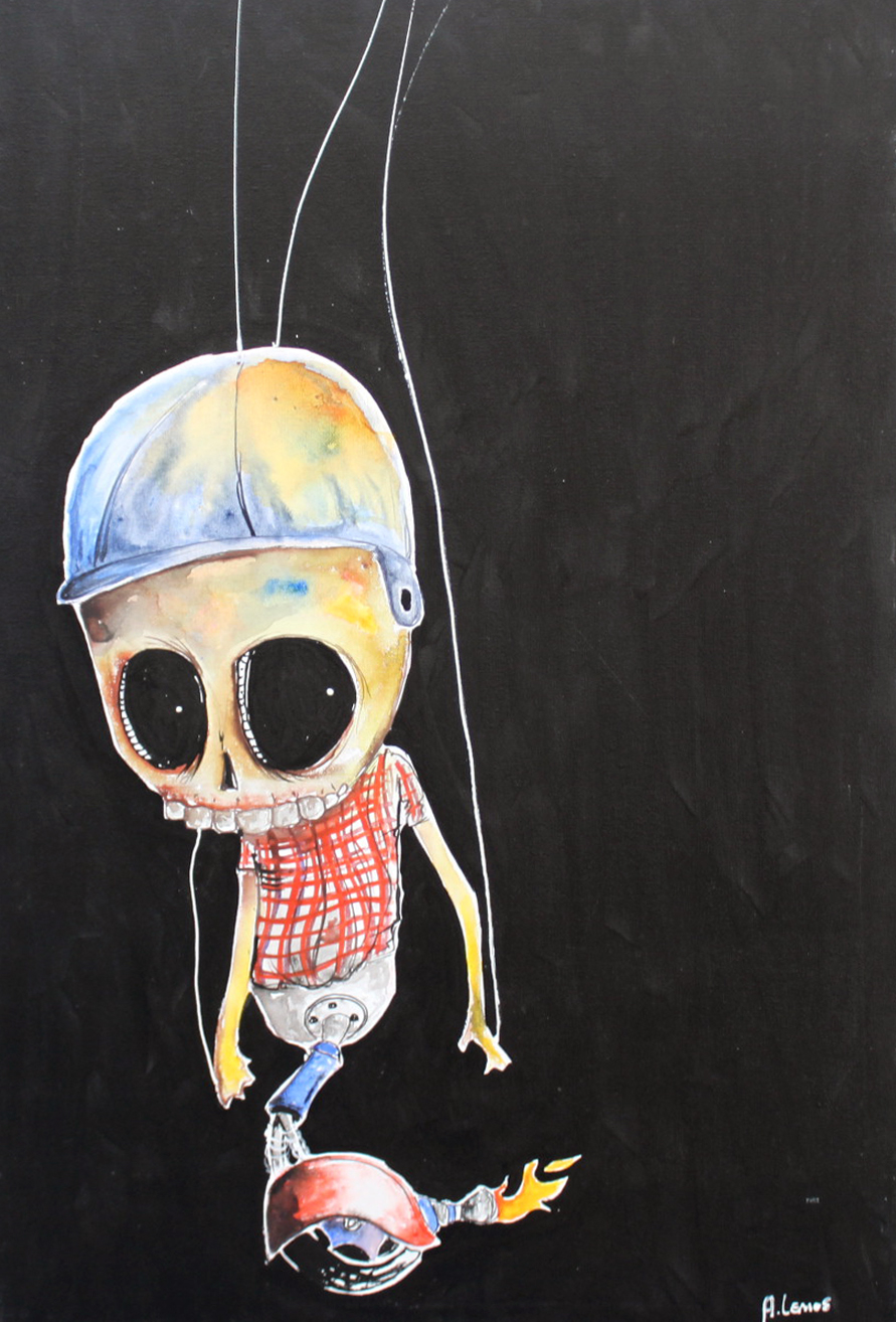 Em sua arte ele destaca um universo caótico. A ideia é usá-la para instigar a reflexão sobre o porquê manipulamos ou nos deixamos manipular. Em seus traços homens e mulheres estão presos, tais quais marionetes, cercados por elementos macabros, como caveiras.