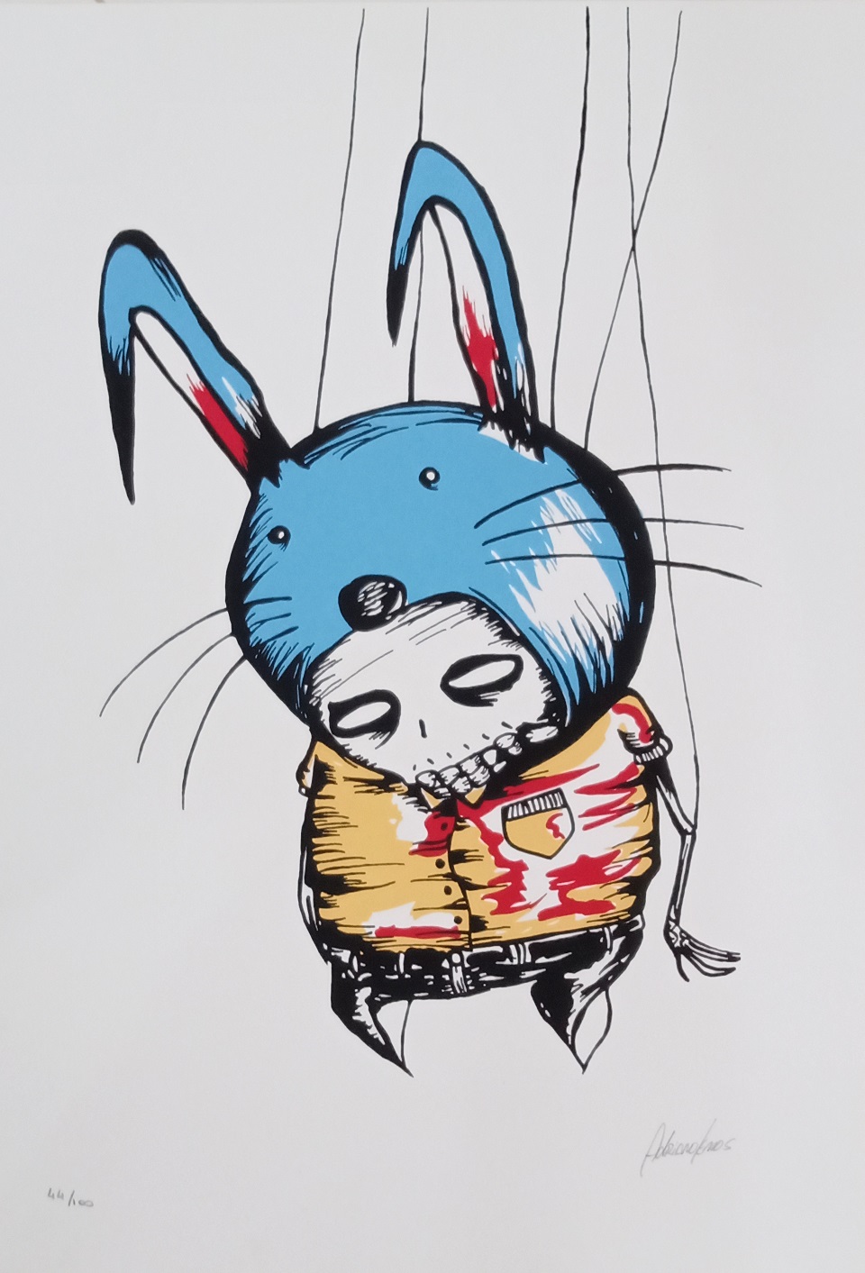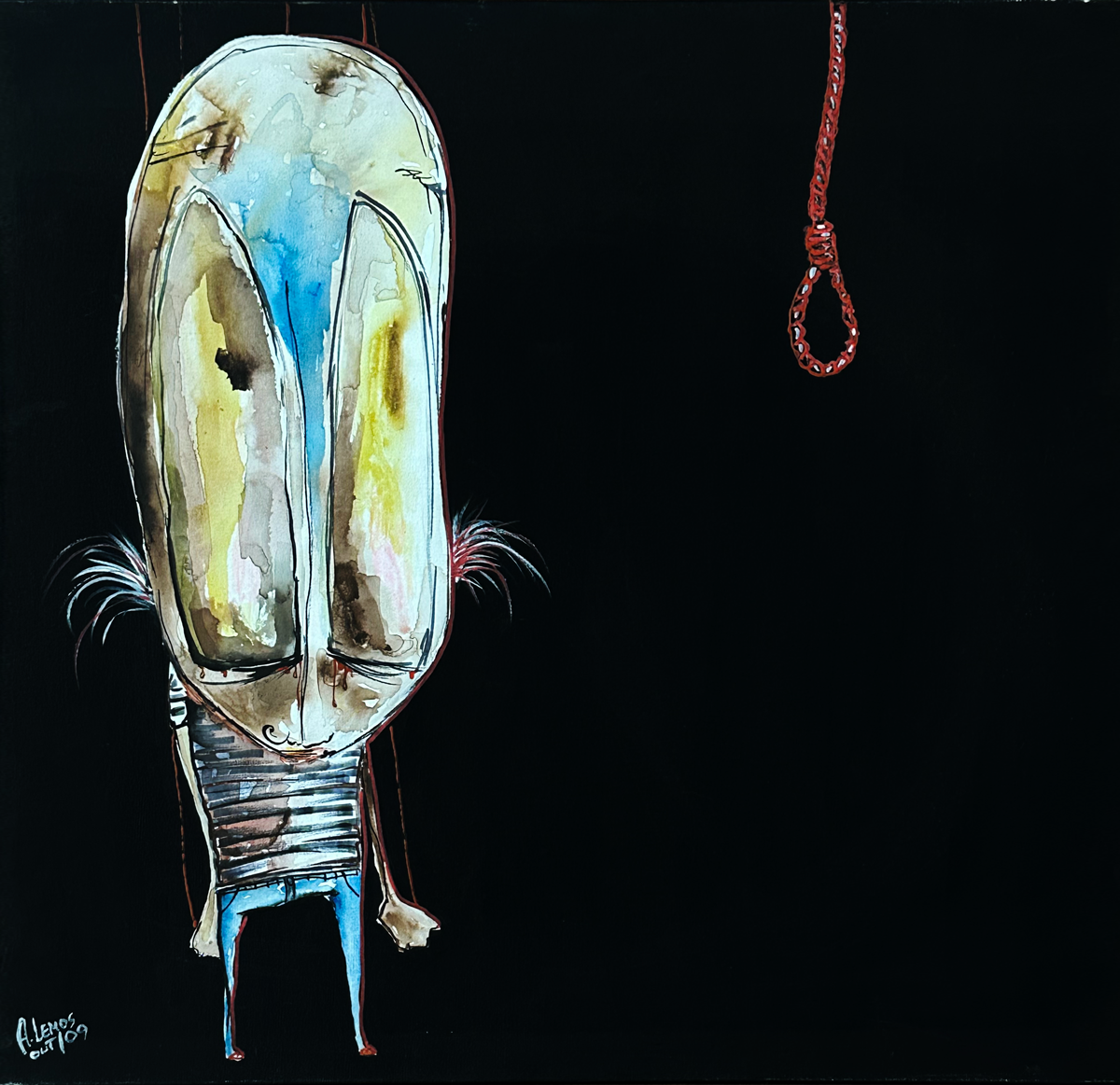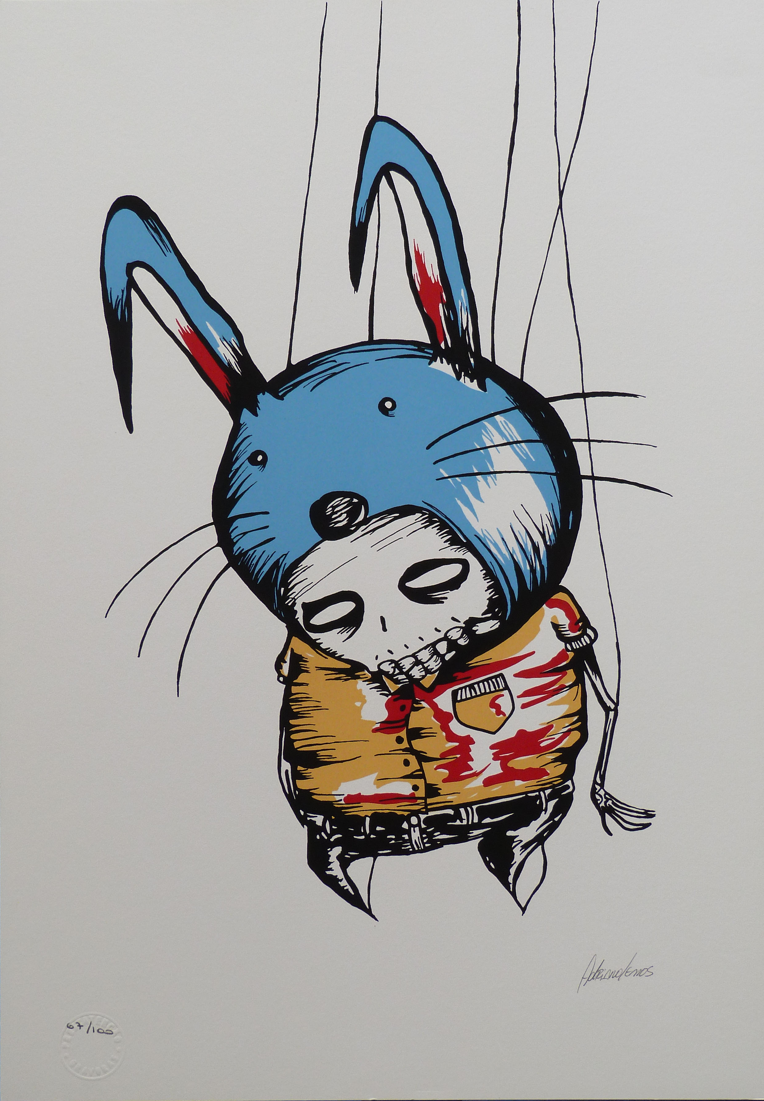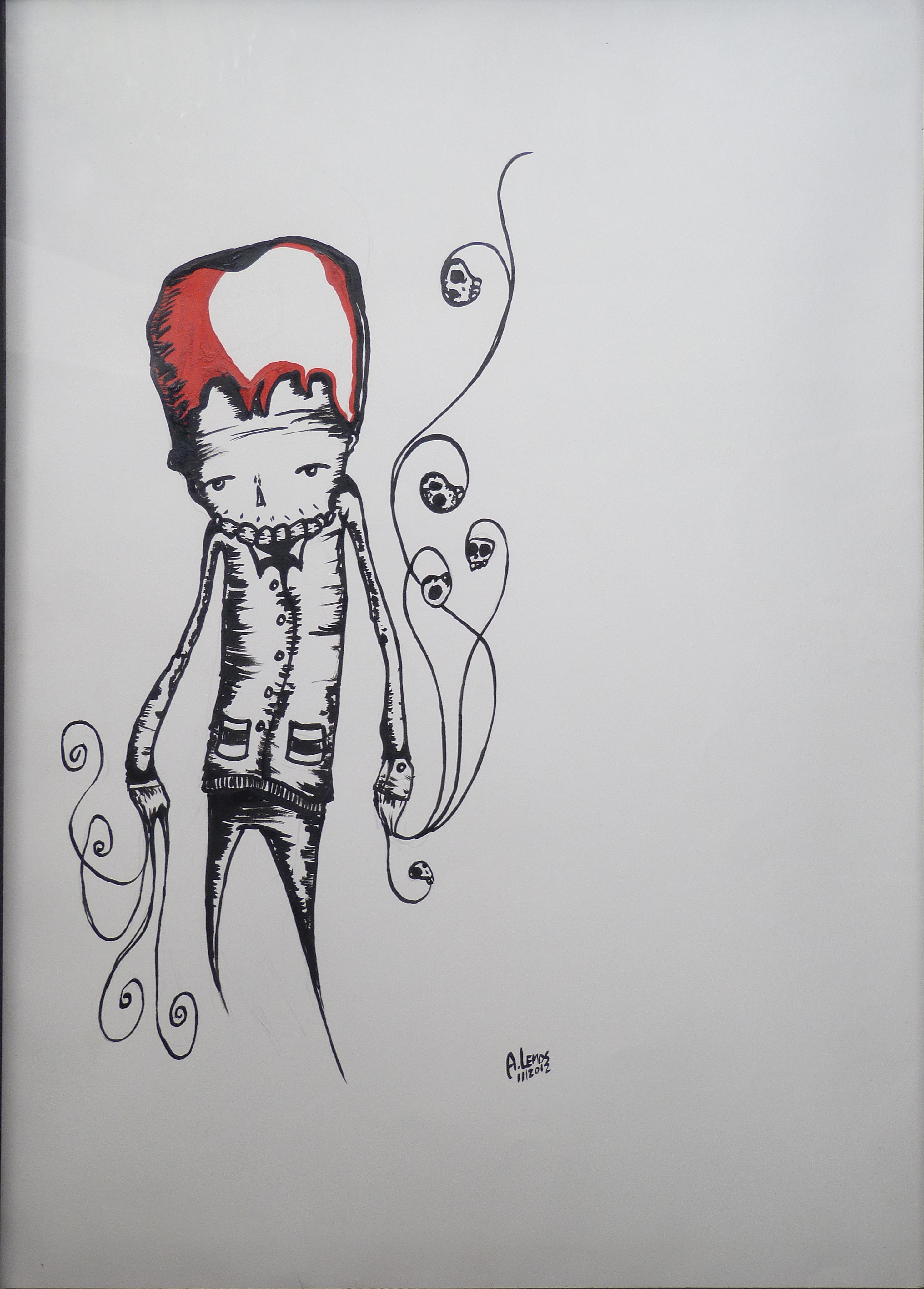 Em sua arte ele destaca um universo caótico. A ideia é usá-la para instigar a reflexão sobre o porquê manipulamos ou nos deixamos manipular. Em seus traços homens e mulheres estão presos, tais quais marionetes, cercados por elementos macabros, como caveiras.