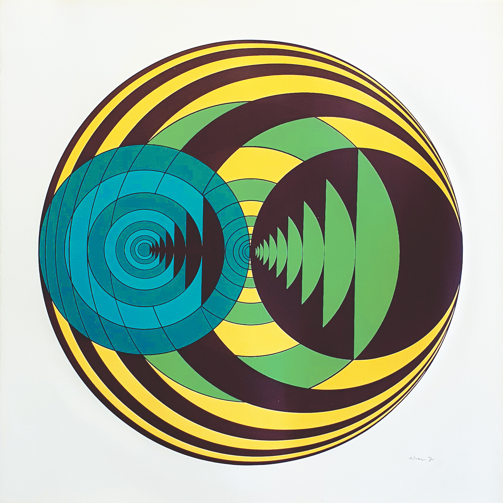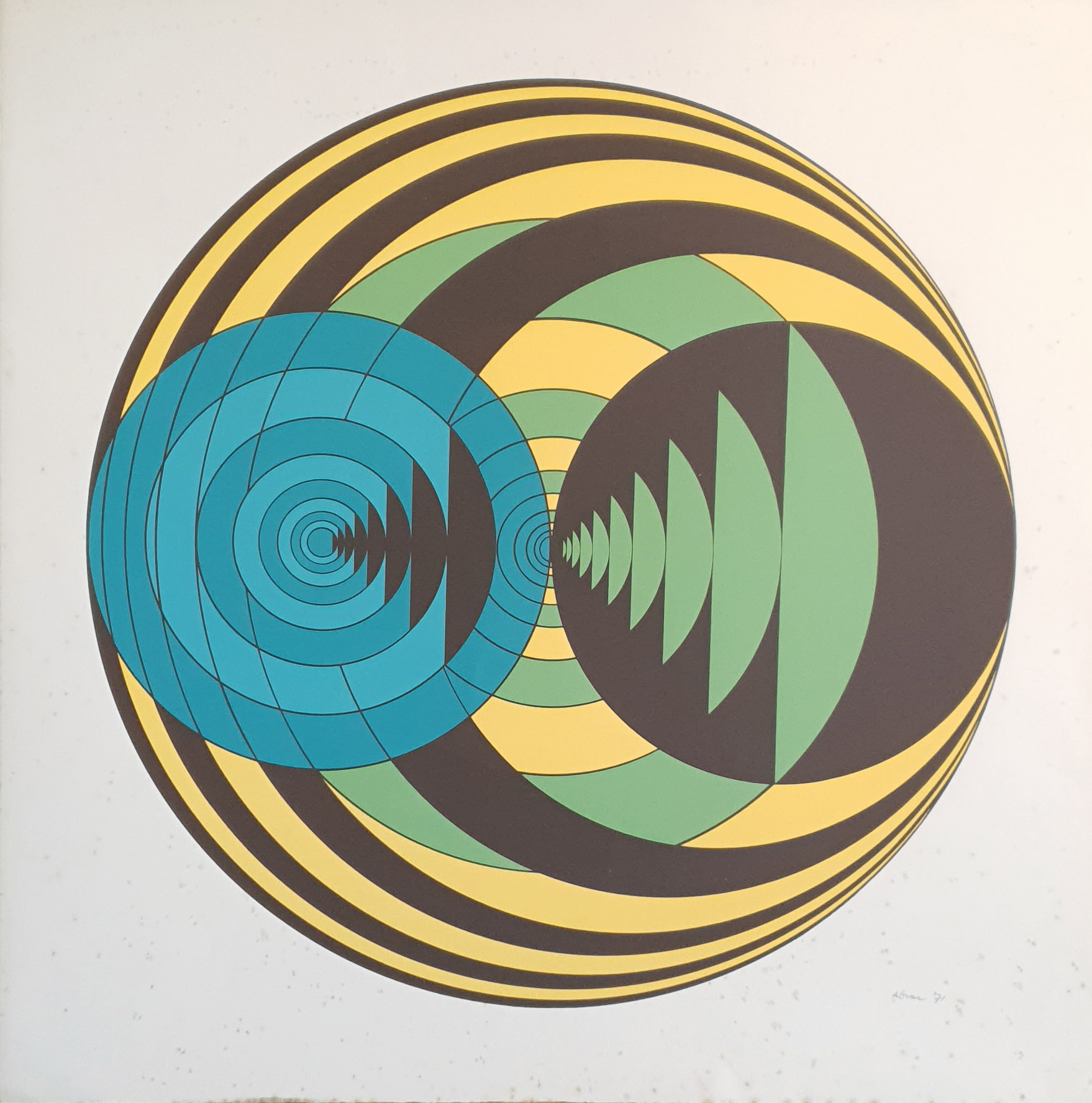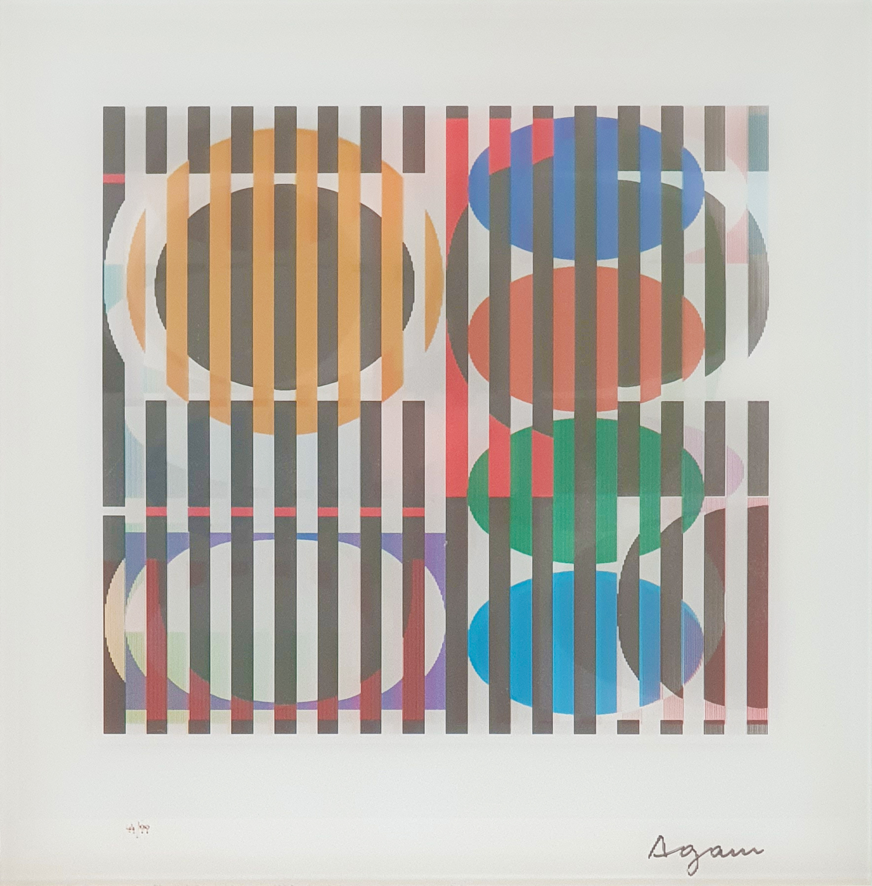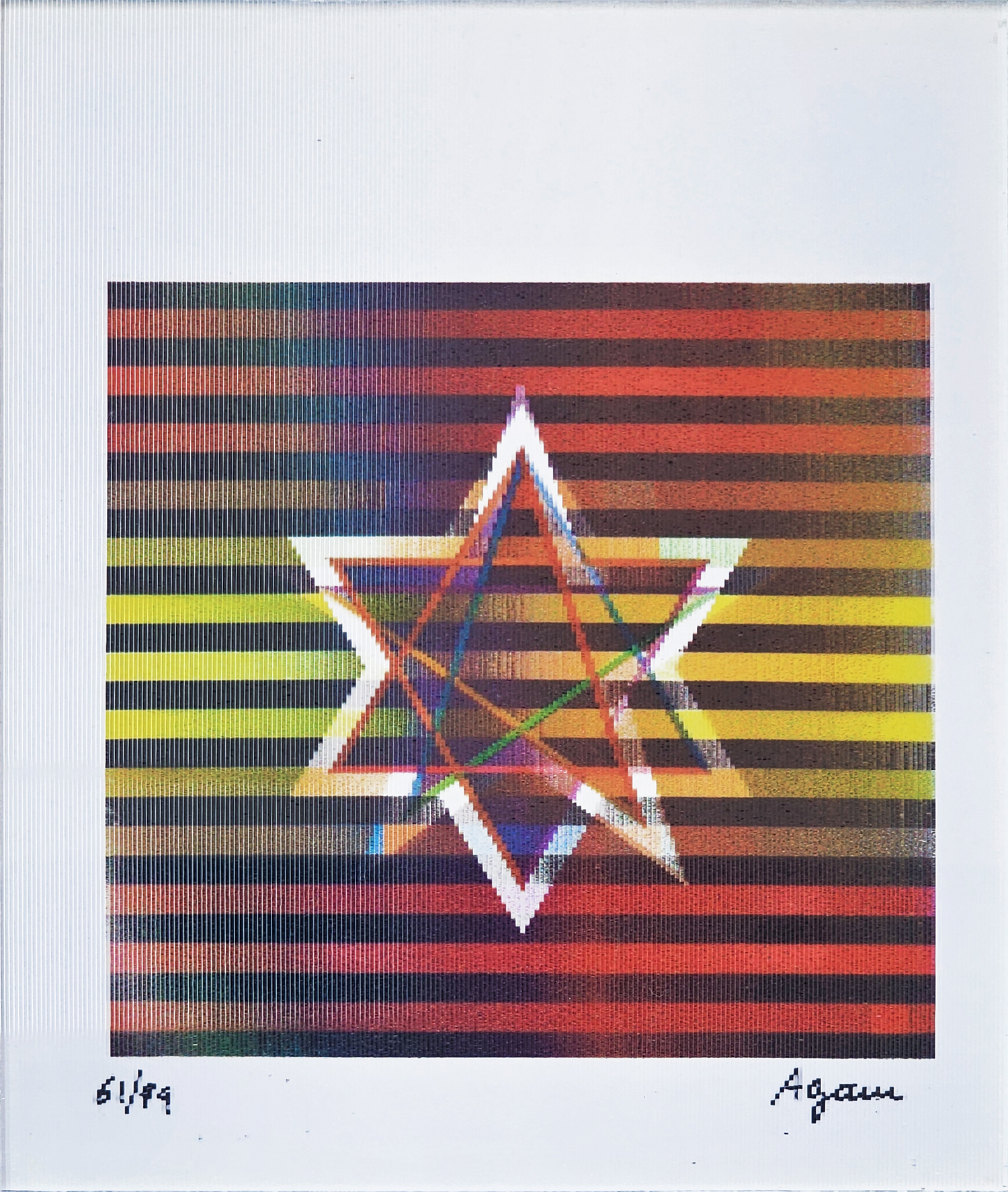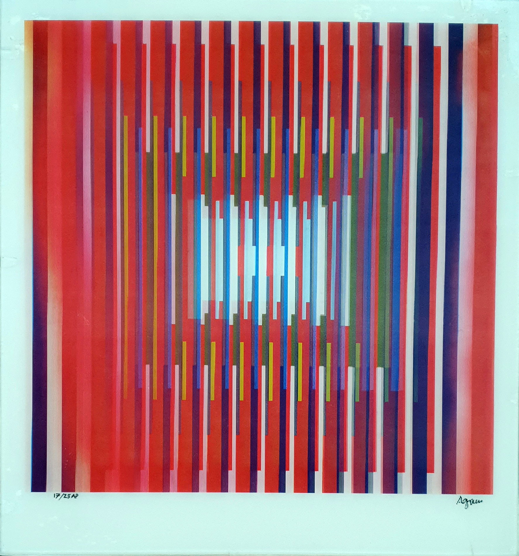Yaacov Agam foi um dos mais importantes realizadores de obras cinéticas transformáveis, ou seja, aquelas que requerem a movimentação do observador para perceber todas as suas variações. Agam formou-se na Academia de Arte de Jerusalém, embora se saiba que começou a pintar ainda na adolescência, motivado pelas obras de Van Gogh, Rembrandt e Doré. Seu professor, o artista plástico Ardo, aconselhou-o a continuar os estudos na Suíça, junto a Itten, pertencente à Bauhaus. Além das aulas de arte, Agam também estudou composição musical no conservatório de Zurique, o que iria se refletir intensamente em suas obras posteriores. Definitivamente instalado em Paris, o artista expôs em 1953 suas primeiras pinturas polifônicas de natureza eminentemente cinética. Já na década de 1960 se decidiu por um novo suporte, o alumínio de superfície irregular, que trabalhou em tons muito brilhantes e com um estudado efeito ótico. Também se aventurou pela escultura. Uma de suas obras mais importantes nessa disciplina, As 100 Portas, decora a residência presidencial de Israel.