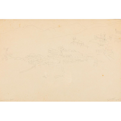 Guignard, Alberto da Veiga. Povoado com Igreja. Reprodução litográfica, 19 cm x 36,5 cm. Assinado embaixo à direita: Guignard. Origem: espólio de Cárbia Sabatel Bourroul e José Celestino Monteiro de Barros Bourroul.