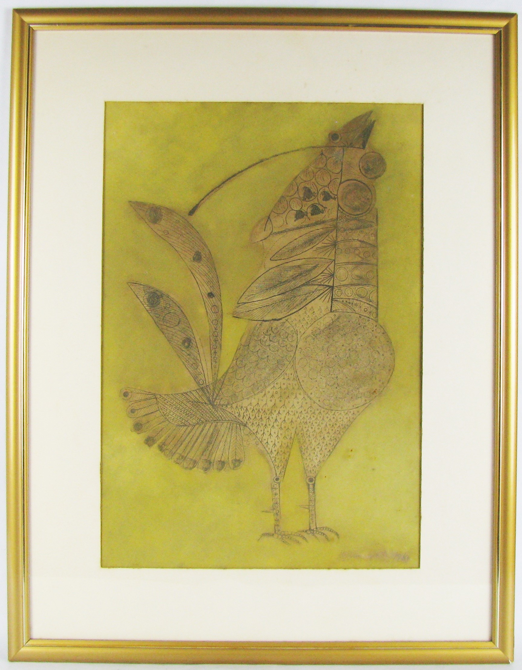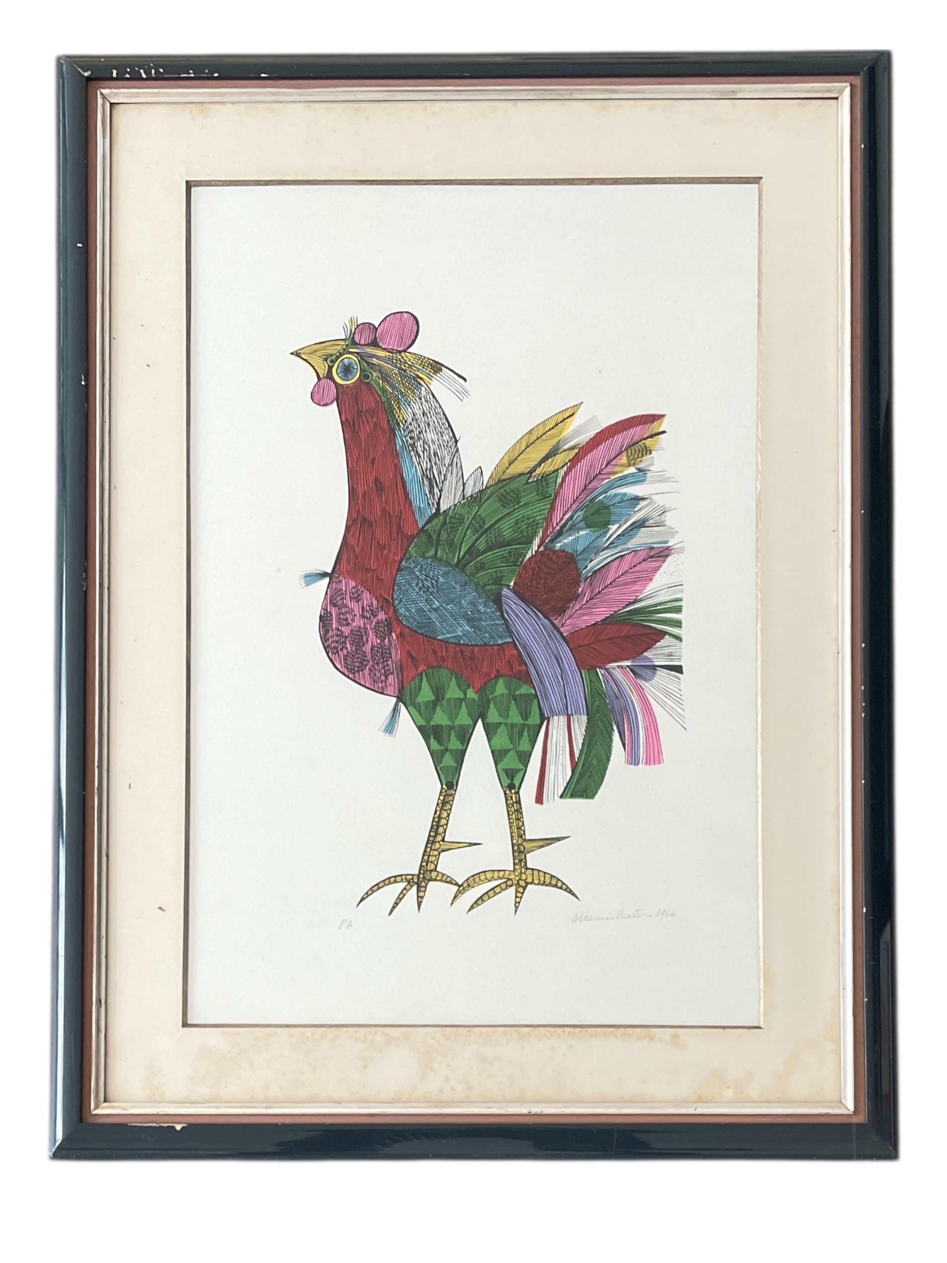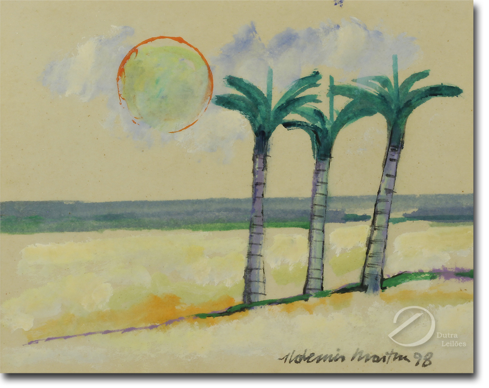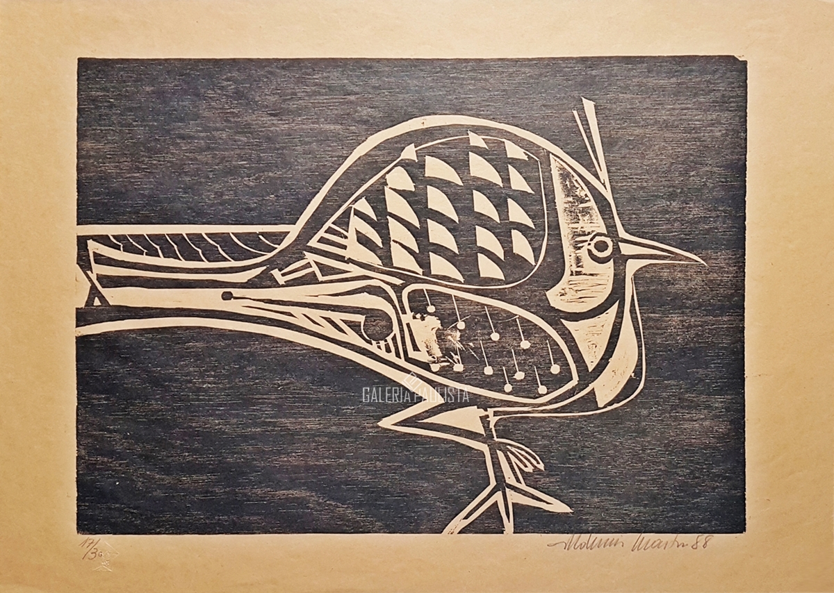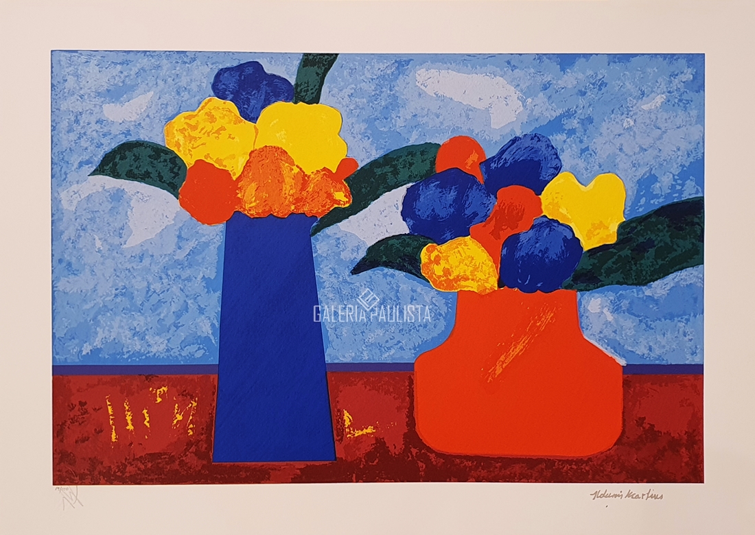 Aldemir Martins (Ingazeiras CE 1922 - São Paulo SP 2006). Pintor, gravador, desenhista, ilustrador. Em 1941, participa da criação do Centro Cultural de Belas Artes, em Fortaleza, com Antonio Bandeira (1922-1967), Raimundo Cela (1890-1954), Inimá de Paula (1918-1999) e Mario Baratta (1915-1983), um espaço para exposições permanentes e cursos de arte. Três anos depois, a instituição passa a chamar-se Sociedade Cearense de Artes Plásticas - SCAP. Aldemir Martins produz desenhos, xilogravuras, aquarelas e pinturas. Atua também como ilustrador na imprensa cearense. Em 1945, viaja para o Rio de Janeiro, e, menos de um ano depois, muda-se para São Paulo, onde realiza sua primeira individual e retoma a carreira de ilustrador. Entre 1949 e 1951, freqüenta os cursos do Museu de Arte de São Paulo Assis Chateaubriand - MASP e torna-se monitor da instituição. Estuda história da arte com Pietro Maria Bardi (1900-1999) e gravura com Poty Lazzarotto (1924-1998). Em 1959, recebe o prêmio de viagem ao exterior do Salão Nacional de Arte Moderna e permanece por dois anos na Itália. Desde o início da carreira sua produção é figurativa, e o artista emprega um repertório formal constantemente retomado: aves, sobretudo os galos; cangaceiros, inspirados nas figuras de cerâmica popular; gatos, realizados com linhas sinuosas; e ainda flores e frutas. Nas pinturas emprega cores intensas e contrastantes.
