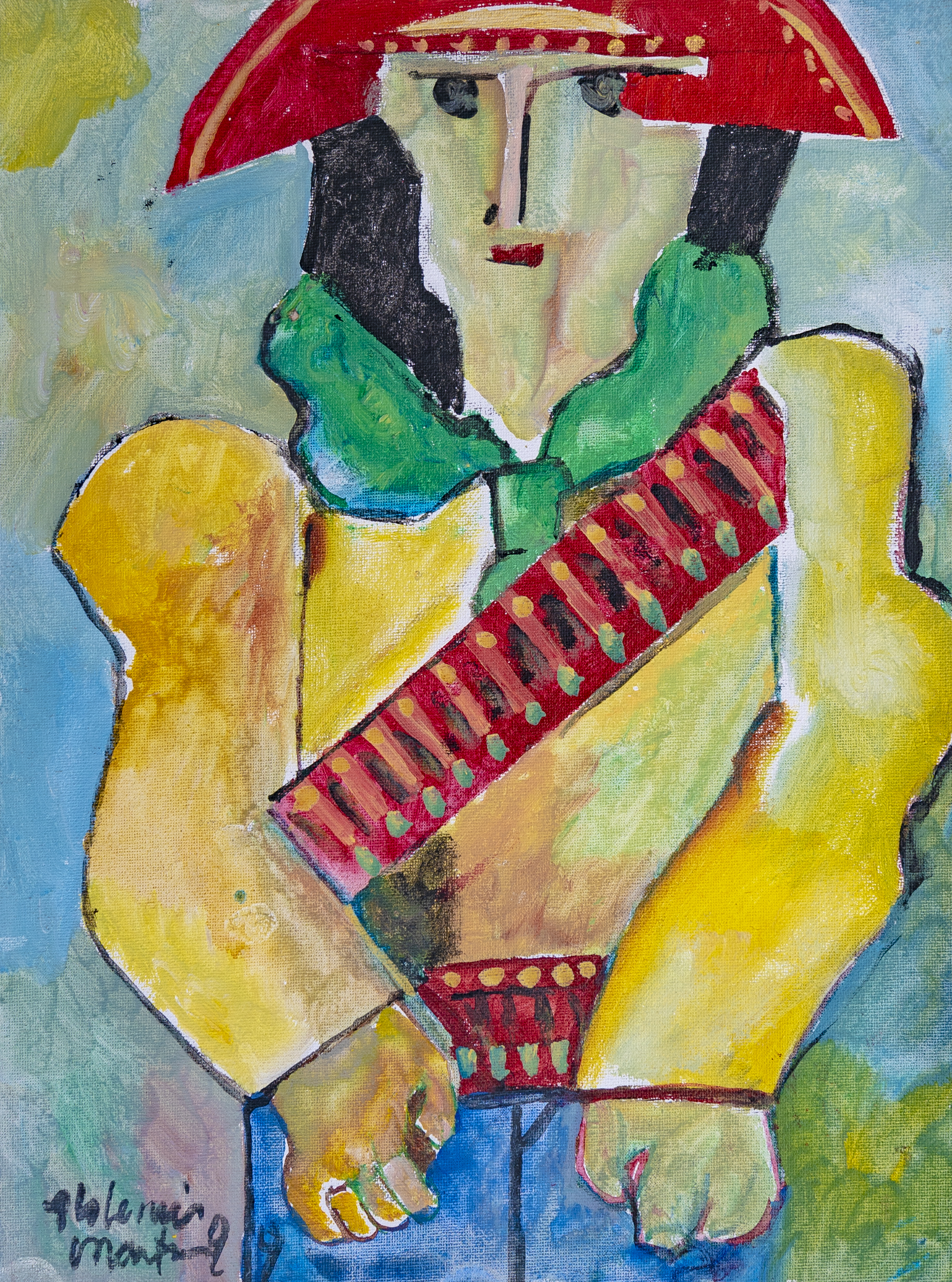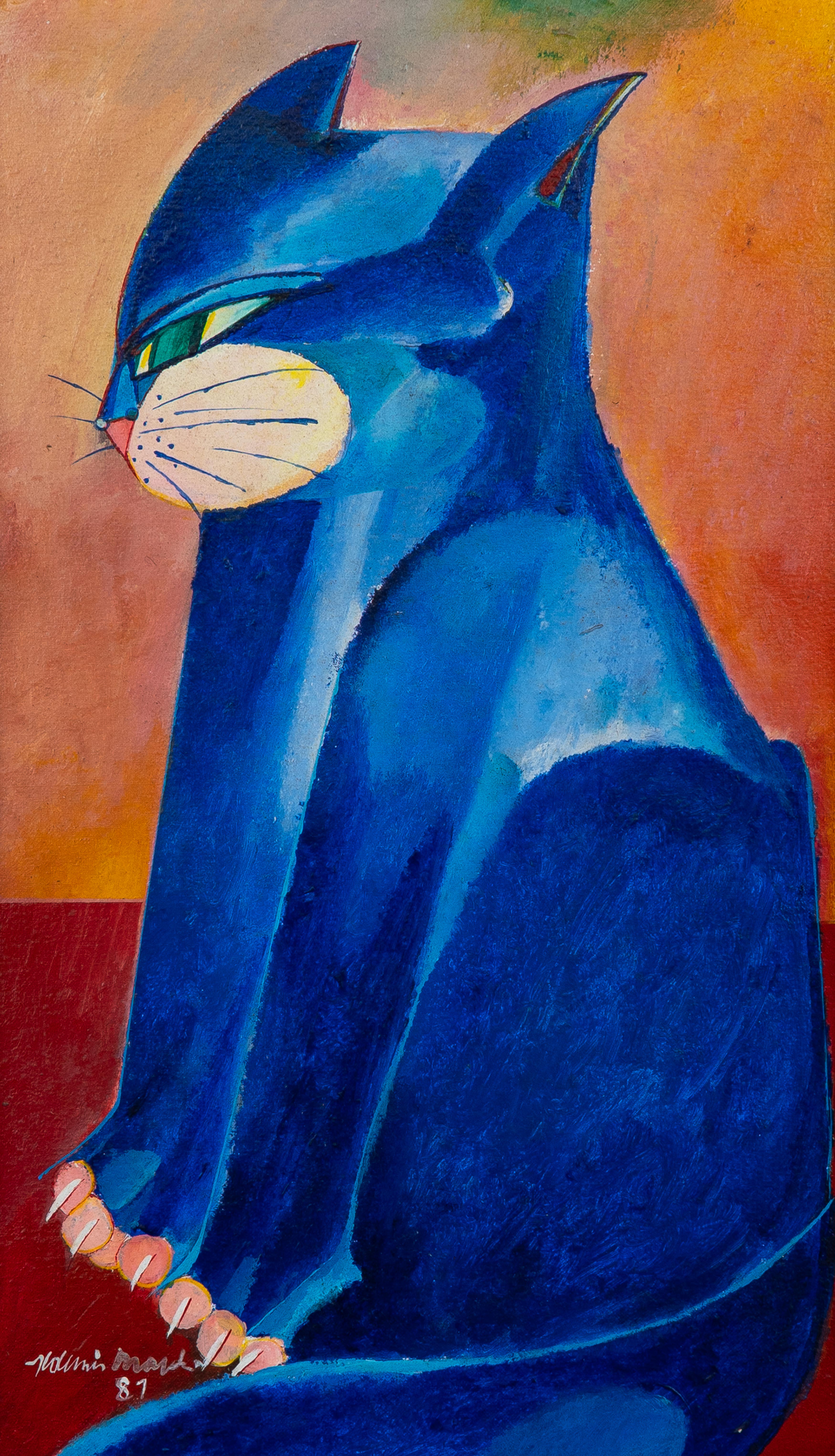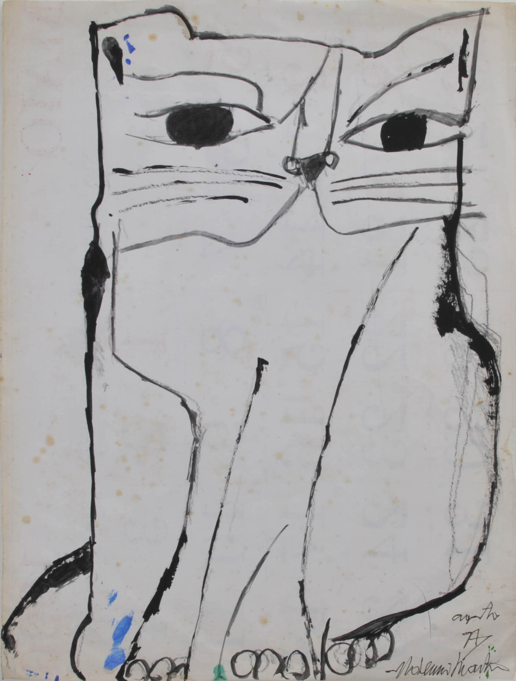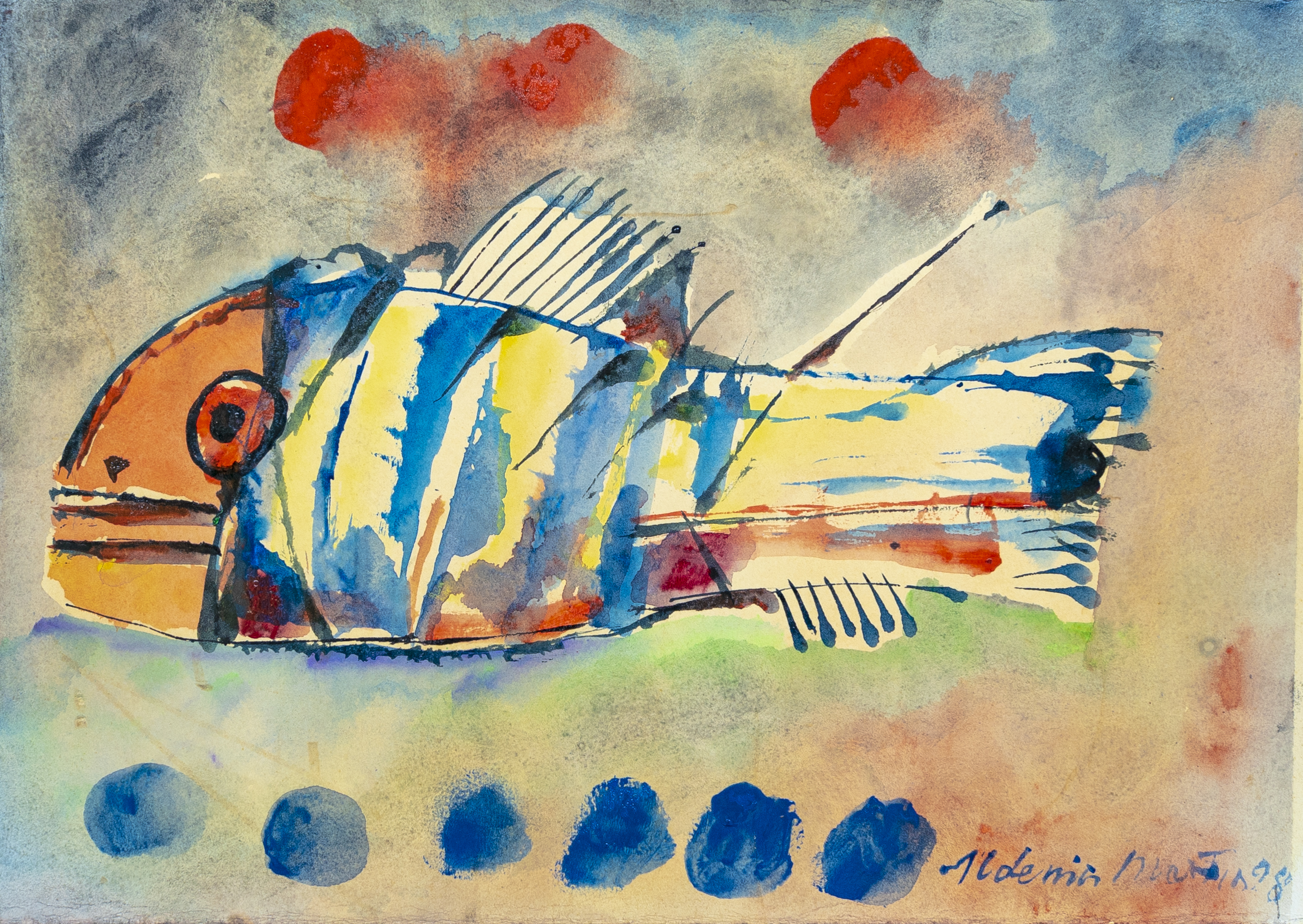 Aldemir Martins (Ingazeiras CE 1922 - São Paulo SP 2006). Pintor, gravador, desenhista, ilustrador. Em 1941, participa da criação do Centro Cultural de Belas Artes, em Fortaleza, com Antonio Bandeira (1922-1967), Raimundo Cela (1890-1954), Inimá de Paula (1918-1999) e Mario Baratta (1915-1983), um espaço para exposições permanentes e cursos de arte. Três anos depois, a instituição passa a chamar-se Sociedade Cearense de Artes Plásticas - SCAP. Aldemir Martins produz desenhos, xilogravuras, aquarelas e pinturas. Atua também como ilustrador na imprensa cearense. Em 1945, viaja para o Rio de Janeiro, e, menos de um ano depois, muda-se para São Paulo, onde realiza sua primeira individual e retoma a carreira de ilustrador. Entre 1949 e 1951, freqüenta os cursos do Museu de Arte de São Paulo Assis Chateaubriand - MASP e torna-se monitor da instituição. Estuda história da arte com Pietro Maria Bardi (1900-1999) e gravura com Poty Lazzarotto (1924-1998). Em 1959, recebe o prêmio de viagem ao exterior do Salão Nacional de Arte Moderna e permanece por dois anos na Itália. Desde o início da carreira sua produção é figurativa, e o artista emprega um repertório formal constantemente retomado: aves, sobretudo os galos; cangaceiros, inspirados nas figuras de cerâmica popular; gatos, realizados com linhas sinuosas; e ainda flores e frutas. Nas pinturas emprega cores intensas e contrastantes.