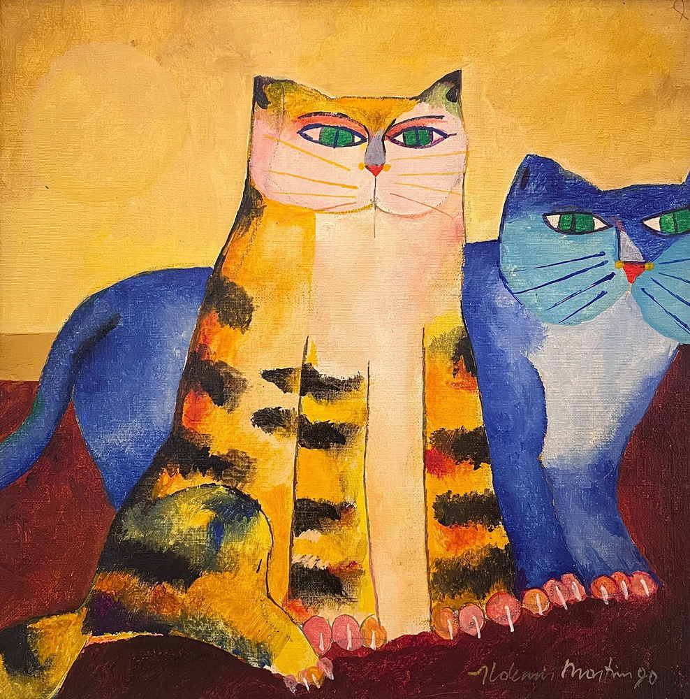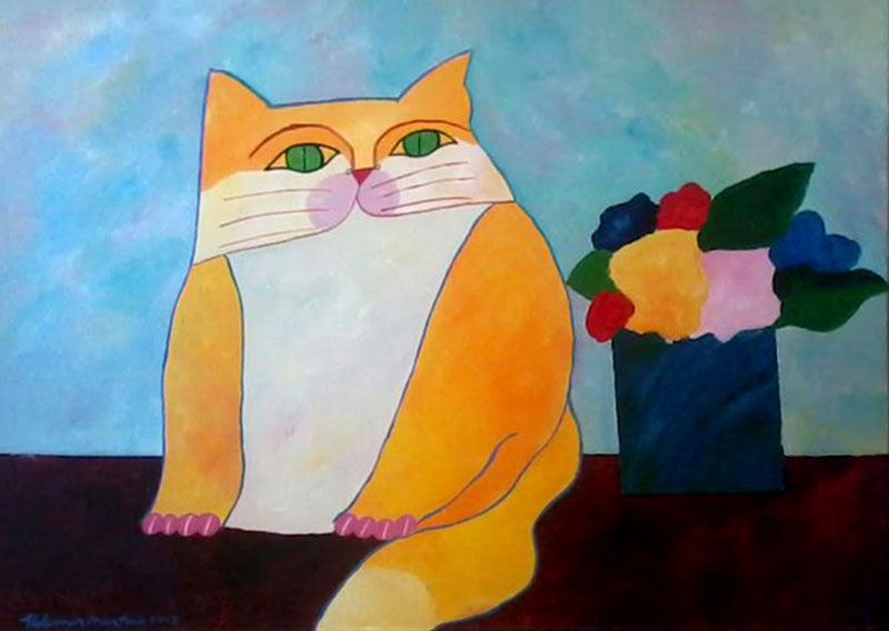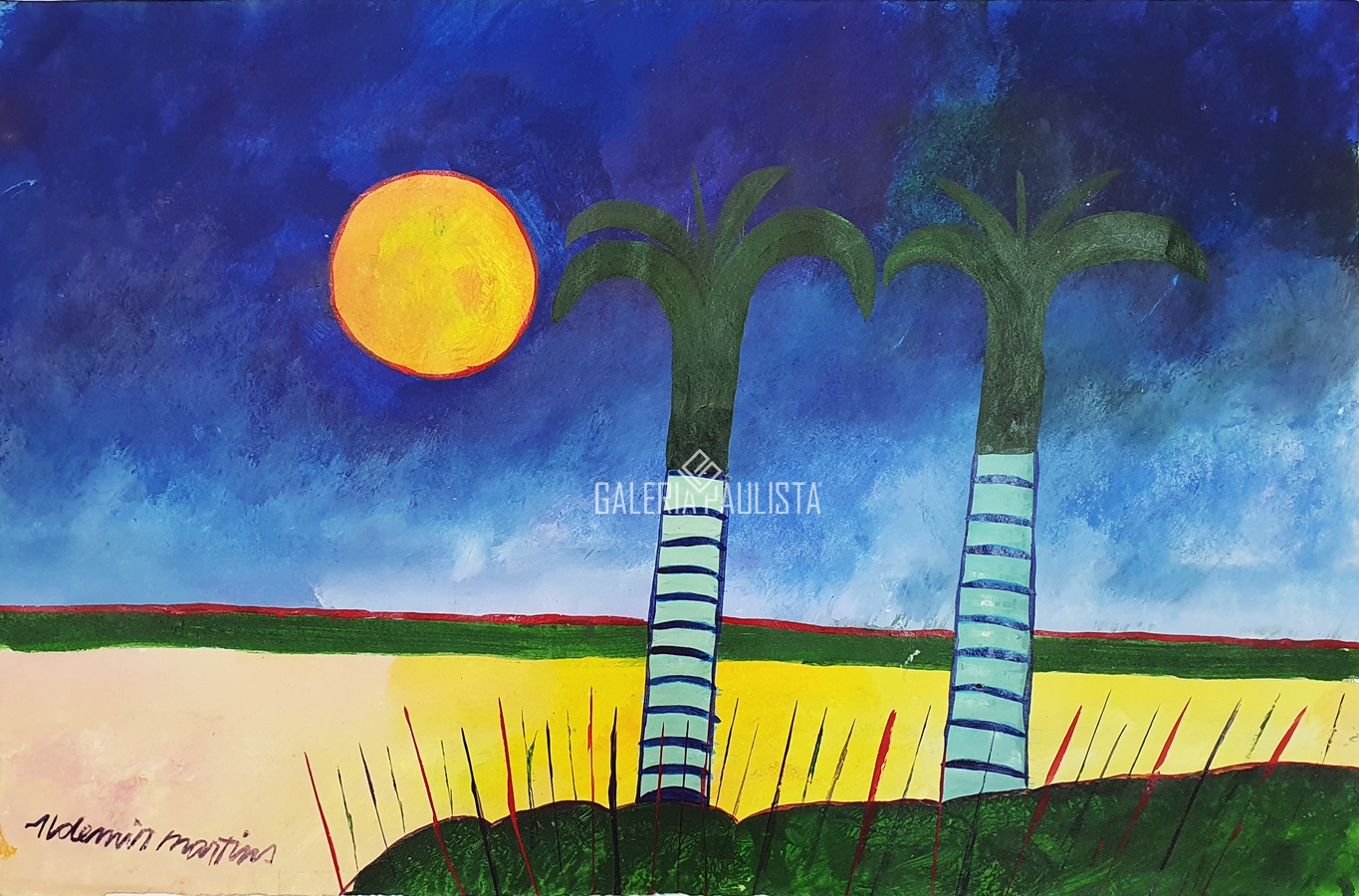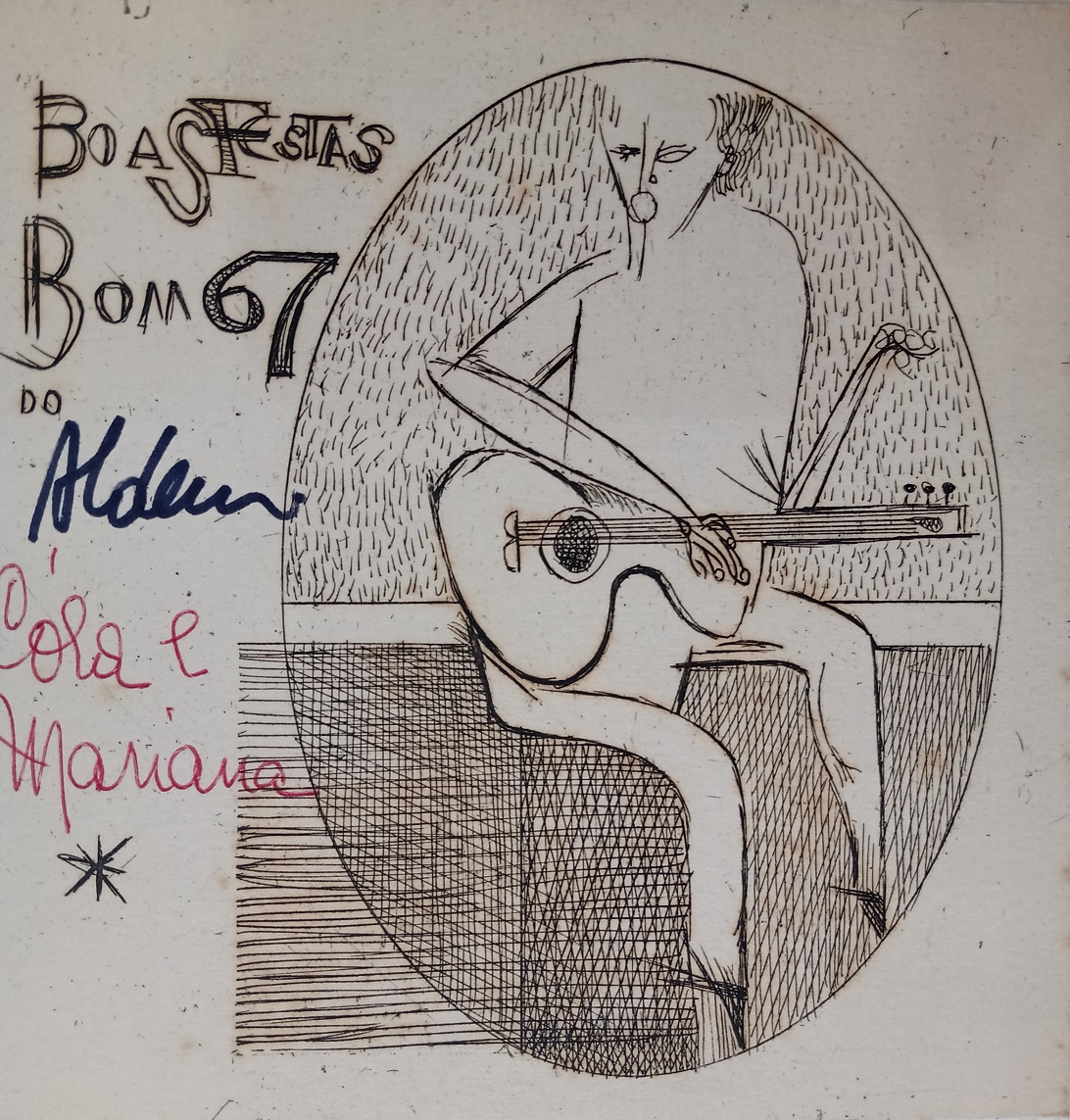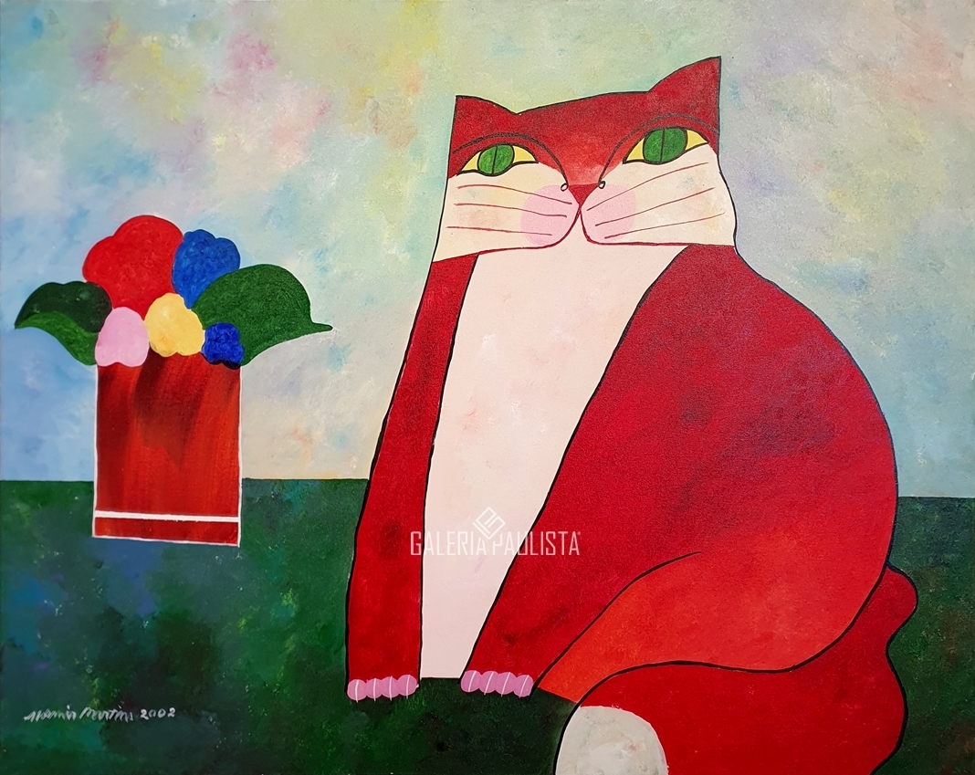 Aldemir Martins (Ingazeiras CE 1922 - São Paulo SP 2006). Pintor, gravador, desenhista, ilustrador. Em 1941, participa da criação do Centro Cultural de Belas Artes, em Fortaleza, com Antonio Bandeira (1922-1967), Raimundo Cela (1890-1954), Inimá de Paula (1918-1999) e Mario Baratta (1915-1983), um espaço para exposições permanentes e cursos de arte. Três anos depois, a instituição passa a chamar-se Sociedade Cearense de Artes Plásticas - SCAP. Aldemir Martins produz desenhos, xilogravuras, aquarelas e pinturas. Atua também como ilustrador na imprensa cearense. Em 1945, viaja para o Rio de Janeiro, e, menos de um ano depois, muda-se para São Paulo, onde realiza sua primeira individual e retoma a carreira de ilustrador. Entre 1949 e 1951, freqüenta os cursos do Museu de Arte de São Paulo Assis Chateaubriand - MASP e torna-se monitor da instituição. Estuda história da arte com Pietro Maria Bardi (1900-1999) e gravura com Poty Lazzarotto (1924-1998). Em 1959, recebe o prêmio de viagem ao exterior do Salão Nacional de Arte Moderna e permanece por dois anos na Itália. Desde o início da carreira sua produção é figurativa, e o artista emprega um repertório formal constantemente retomado: aves, sobretudo os galos; cangaceiros, inspirados nas figuras de cerâmica popular; gatos, realizados com linhas sinuosas; e ainda flores e frutas. Nas pinturas emprega cores intensas e contrastantes.