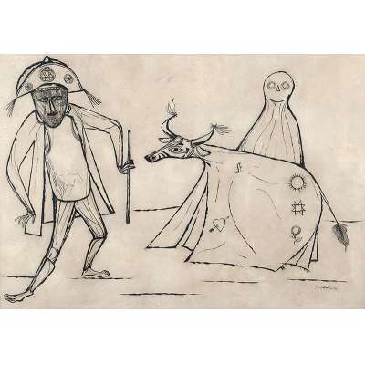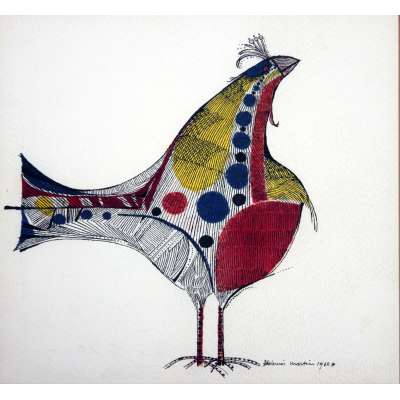 Aldemir Martins (Ingazeiras CE 1922 - São Paulo SP 2006). Pintor, gravador, desenhista, ilustrador. Em 1941, participa da criação do Centro Cultural de Belas Artes, em Fortaleza, com Antonio Bandeira (1922-1967), Raimundo Cela (1890-1954), Inimá de Paula (1918-1999) e Mario Baratta (1915-1983), um espaço para exposições permanentes e cursos de arte. Três anos depois, a instituição passa a chamar-se Sociedade Cearense de Artes Plásticas - SCAP. Aldemir Martins produz desenhos, xilogravuras, aquarelas e pinturas. Atua também como ilustrador na imprensa cearense. Em 1945, viaja para o Rio de Janeiro, e, menos de um ano depois, muda-se para São Paulo, onde realiza sua primeira individual e retoma a carreira de ilustrador. Entre 1949 e 1951, freqüenta os cursos do Museu de Arte de São Paulo Assis Chateaubriand - MASP e torna-se monitor da instituição. Estuda história da arte com Pietro Maria Bardi (1900-1999) e gravura com Poty Lazzarotto (1924-1998). Em 1959, recebe o prêmio de viagem ao exterior do Salão Nacional de Arte Moderna e permanece por dois anos na Itália. Desde o início da carreira sua produção é figurativa, e o artista emprega um repertório formal constantemente retomado: aves, sobretudo os galos; cangaceiros, inspirados nas figuras de cerâmica popular; gatos, realizados com linhas sinuosas; e ainda flores e frutas. Nas pinturas emprega cores intensas e contrastantes.
