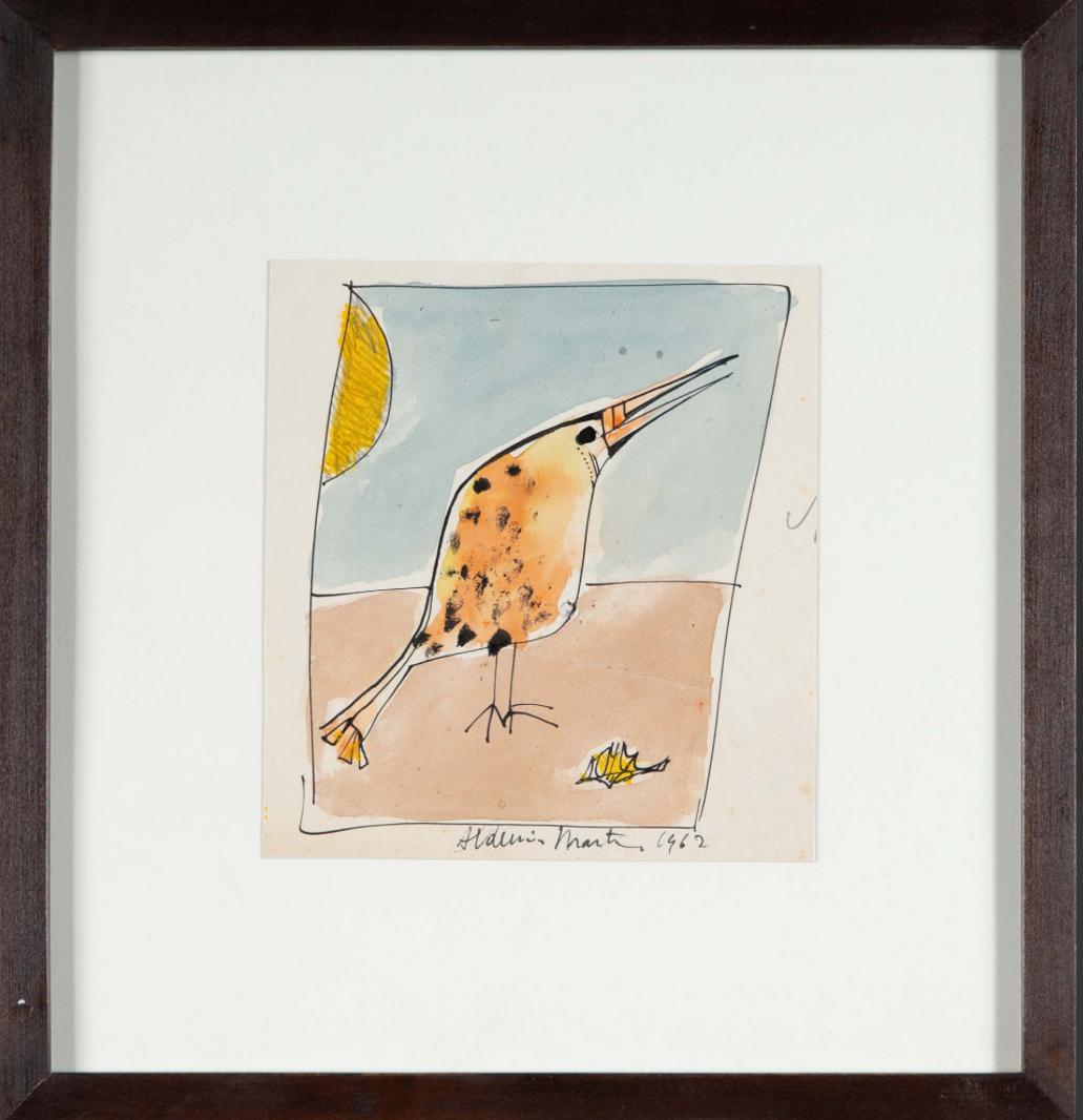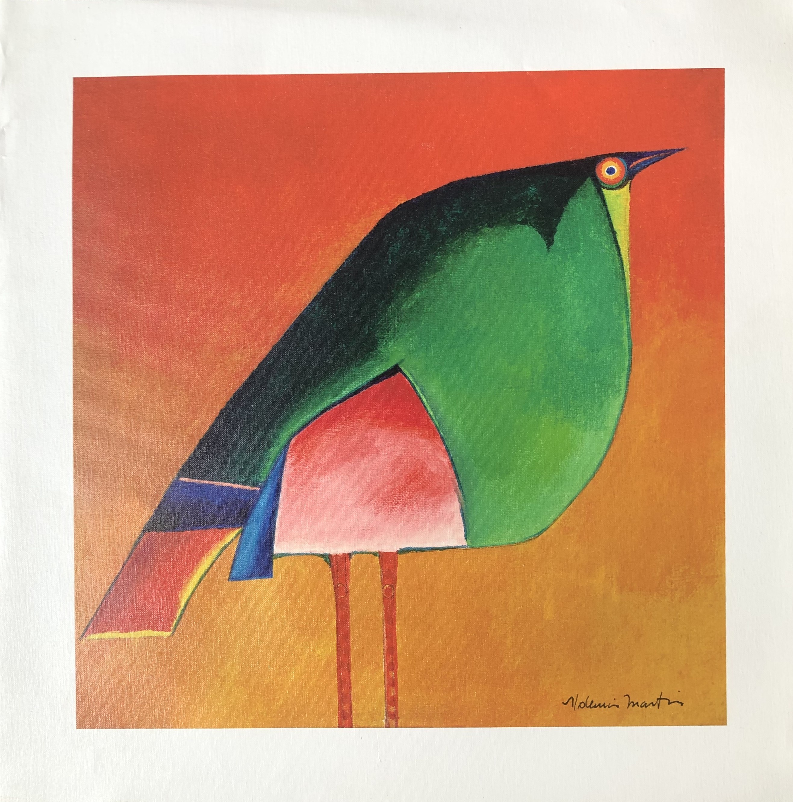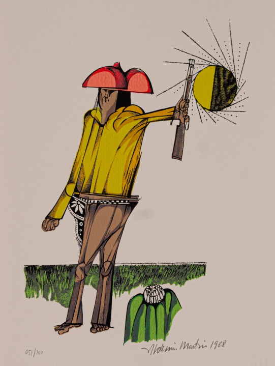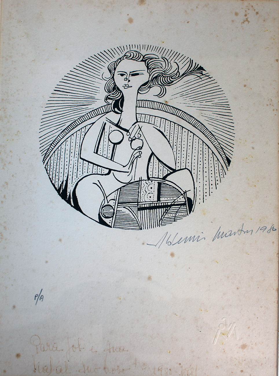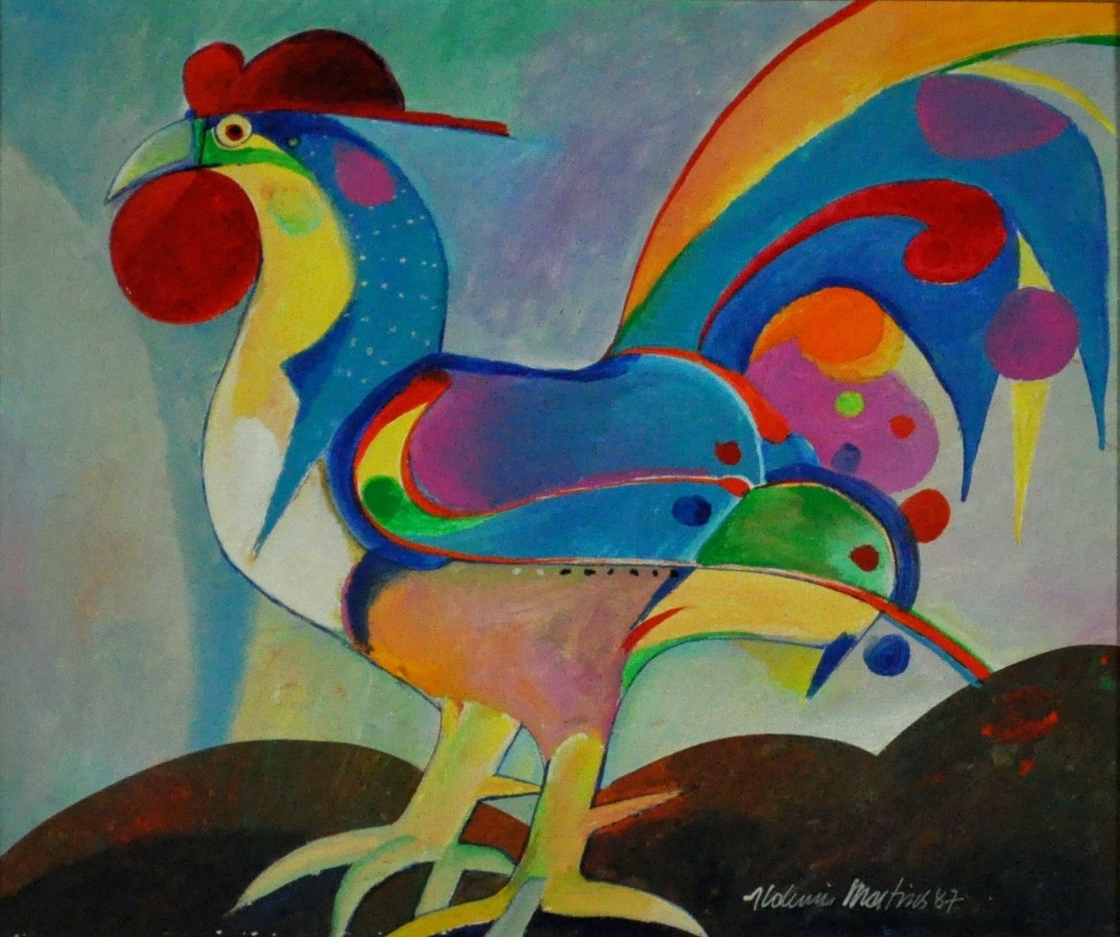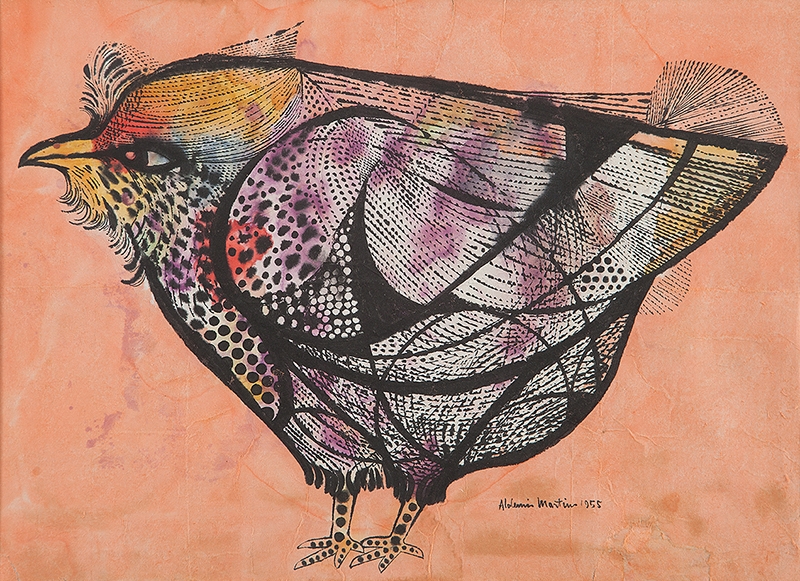 Aldemir Martins (Ingazeiras CE 1922 - São Paulo SP 2006). Pintor, gravador, desenhista, ilustrador. Em 1941, participa da criação do Centro Cultural de Belas Artes, em Fortaleza, com Antonio Bandeira (1922-1967), Raimundo Cela (1890-1954), Inimá de Paula (1918-1999) e Mario Baratta (1915-1983), um espaço para exposições permanentes e cursos de arte. Três anos depois, a instituição passa a chamar-se Sociedade Cearense de Artes Plásticas - SCAP. Aldemir Martins produz desenhos, xilogravuras, aquarelas e pinturas. Atua também como ilustrador na imprensa cearense. Em 1945, viaja para o Rio de Janeiro, e, menos de um ano depois, muda-se para São Paulo, onde realiza sua primeira individual e retoma a carreira de ilustrador. Entre 1949 e 1951, freqüenta os cursos do Museu de Arte de São Paulo Assis Chateaubriand - MASP e torna-se monitor da instituição. Estuda história da arte com Pietro Maria Bardi (1900-1999) e gravura com Poty Lazzarotto (1924-1998). Em 1959, recebe o prêmio de viagem ao exterior do Salão Nacional de Arte Moderna e permanece por dois anos na Itália. Desde o início da carreira sua produção é figurativa, e o artista emprega um repertório formal constantemente retomado: aves, sobretudo os galos; cangaceiros, inspirados nas figuras de cerâmica popular; gatos, realizados com linhas sinuosas; e ainda flores e frutas. Nas pinturas emprega cores intensas e contrastantes.