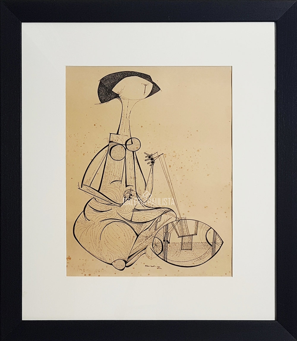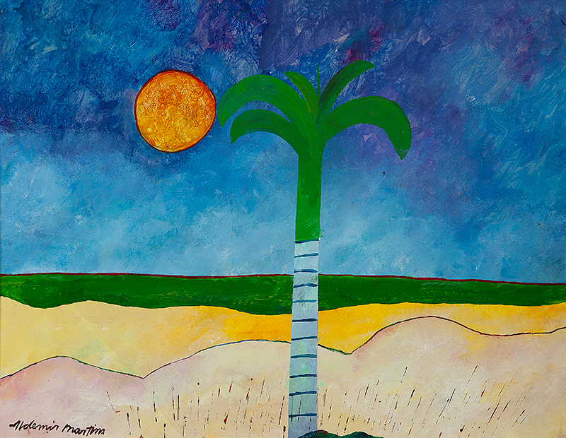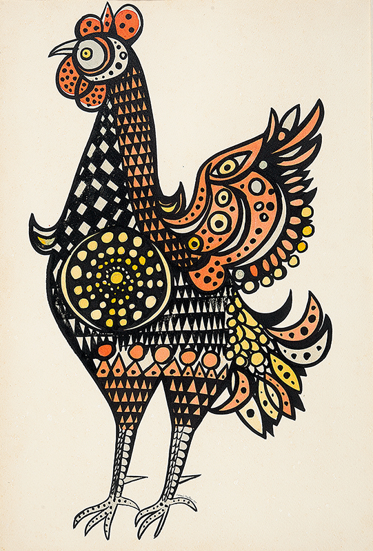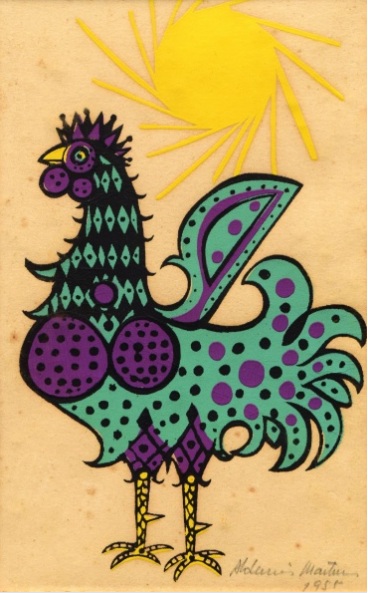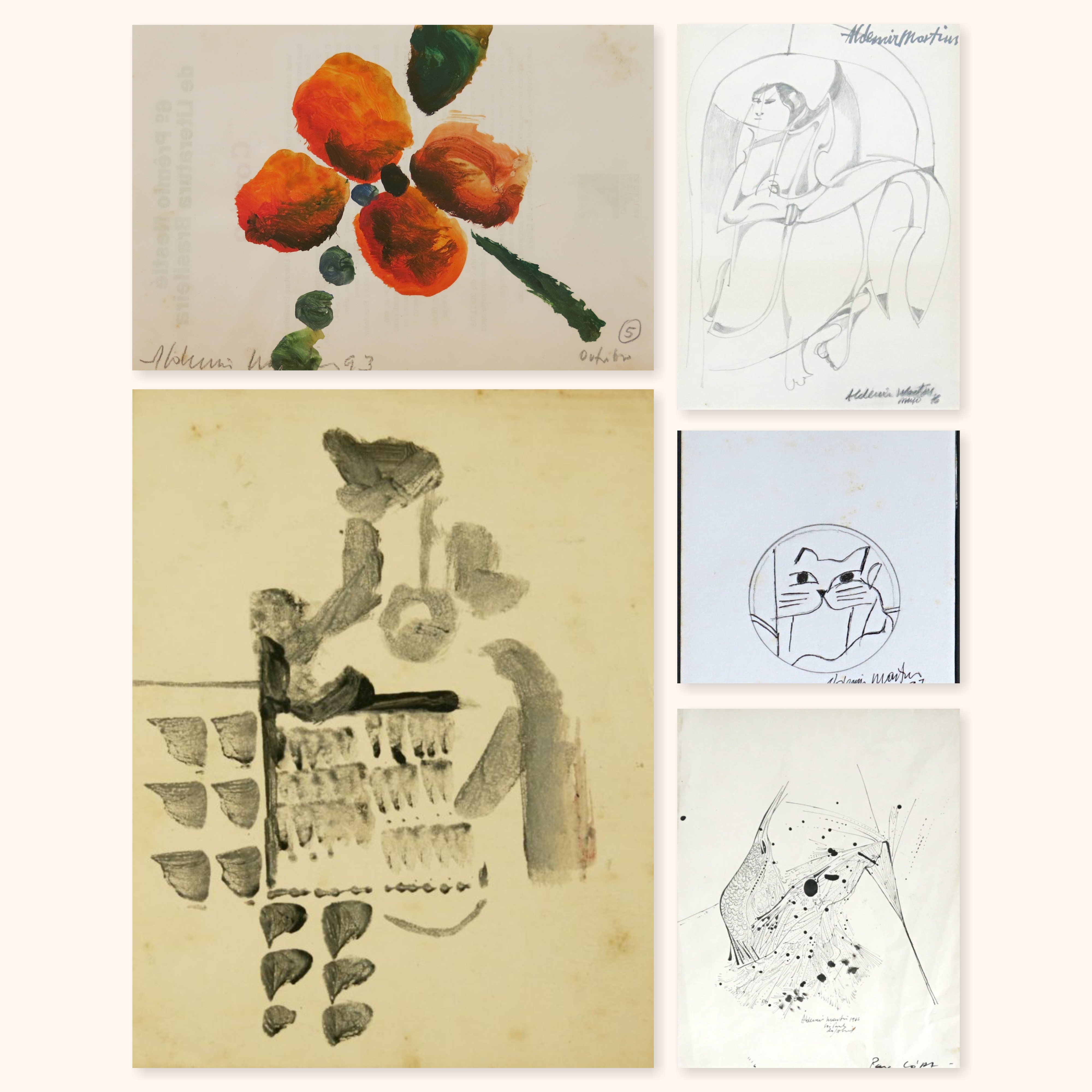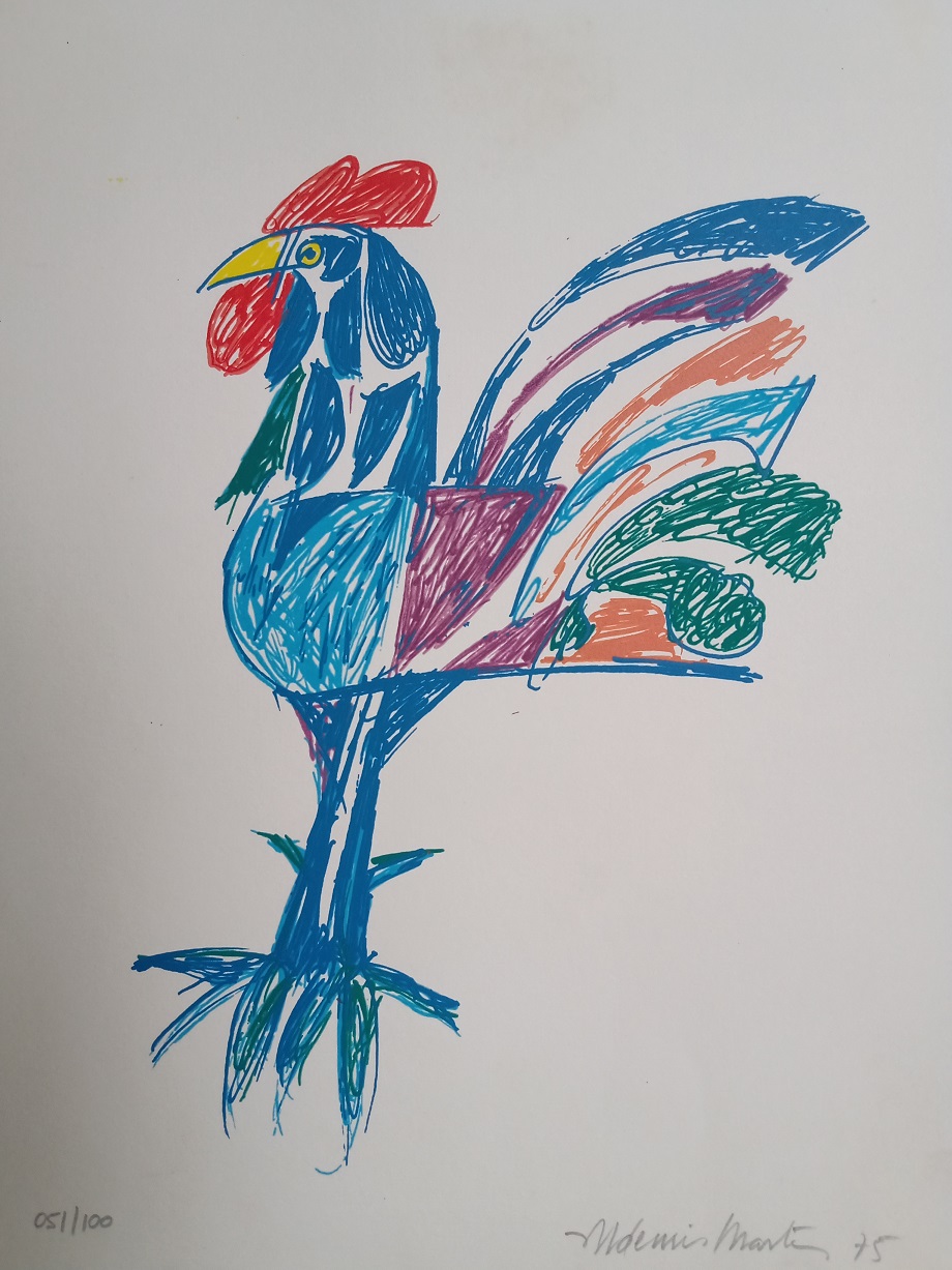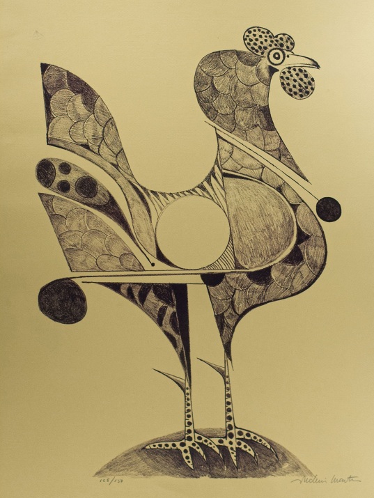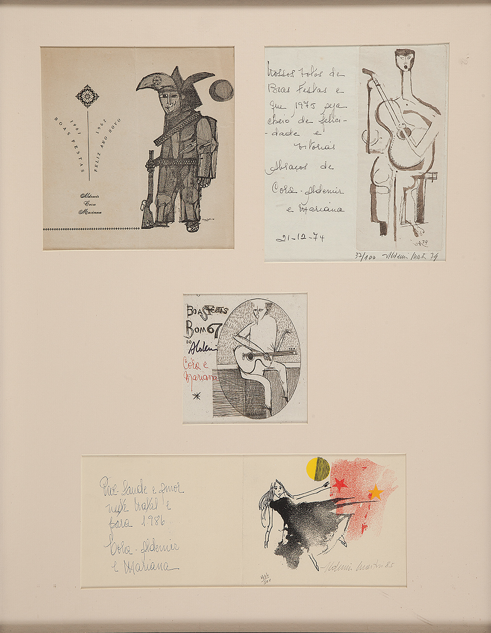 Aldemir Martins (Ingazeiras CE 1922 - São Paulo SP 2006). Pintor, gravador, desenhista, ilustrador. Em 1941, participa da criação do Centro Cultural de Belas Artes, em Fortaleza, com Antonio Bandeira (1922-1967), Raimundo Cela (1890-1954), Inimá de Paula (1918-1999) e Mario Baratta (1915-1983), um espaço para exposições permanentes e cursos de arte. Três anos depois, a instituição passa a chamar-se Sociedade Cearense de Artes Plásticas - SCAP. Aldemir Martins produz desenhos, xilogravuras, aquarelas e pinturas. Atua também como ilustrador na imprensa cearense. Em 1945, viaja para o Rio de Janeiro, e, menos de um ano depois, muda-se para São Paulo, onde realiza sua primeira individual e retoma a carreira de ilustrador. Entre 1949 e 1951, freqüenta os cursos do Museu de Arte de São Paulo Assis Chateaubriand - MASP e torna-se monitor da instituição. Estuda história da arte com Pietro Maria Bardi (1900-1999) e gravura com Poty Lazzarotto (1924-1998). Em 1959, recebe o prêmio de viagem ao exterior do Salão Nacional de Arte Moderna e permanece por dois anos na Itália. Desde o início da carreira sua produção é figurativa, e o artista emprega um repertório formal constantemente retomado: aves, sobretudo os galos; cangaceiros, inspirados nas figuras de cerâmica popular; gatos, realizados com linhas sinuosas; e ainda flores e frutas. Nas pinturas emprega cores intensas e contrastantes.