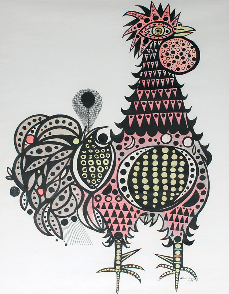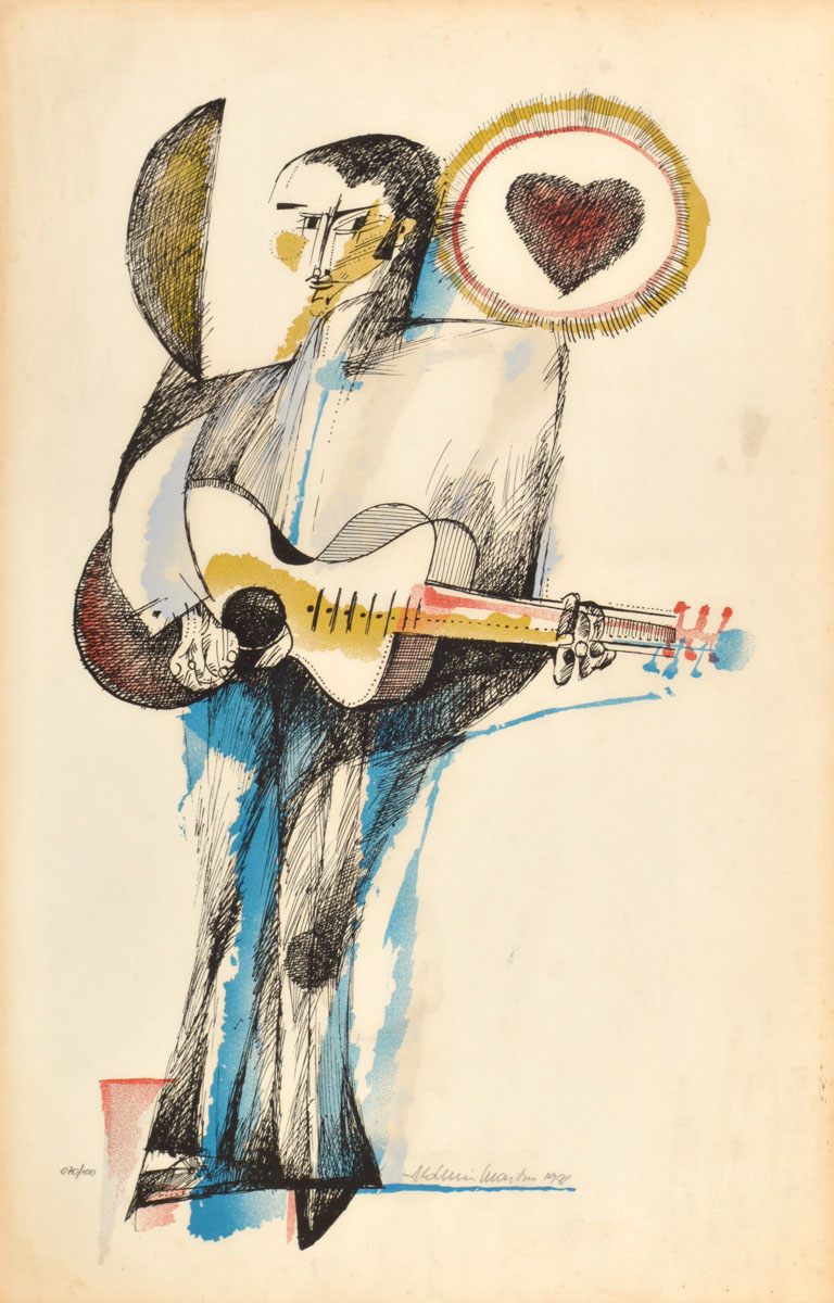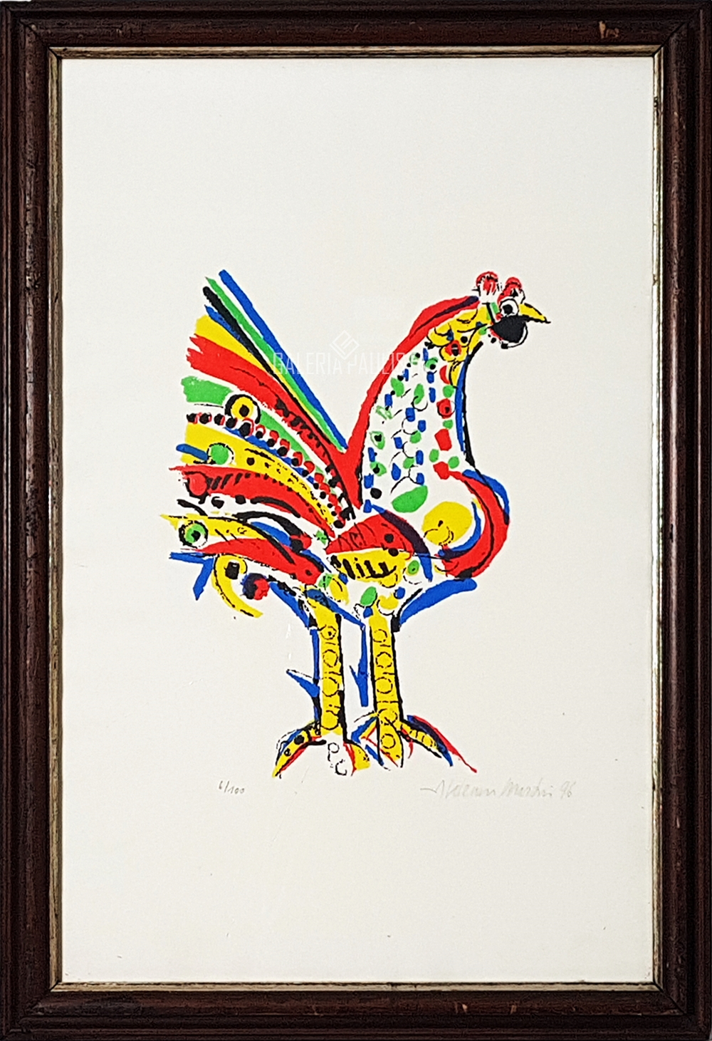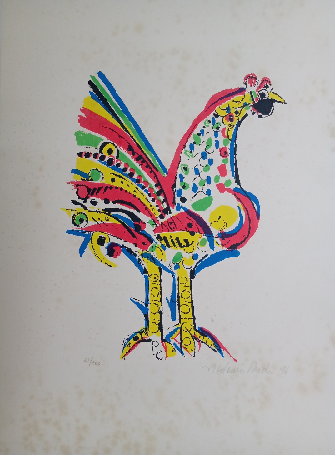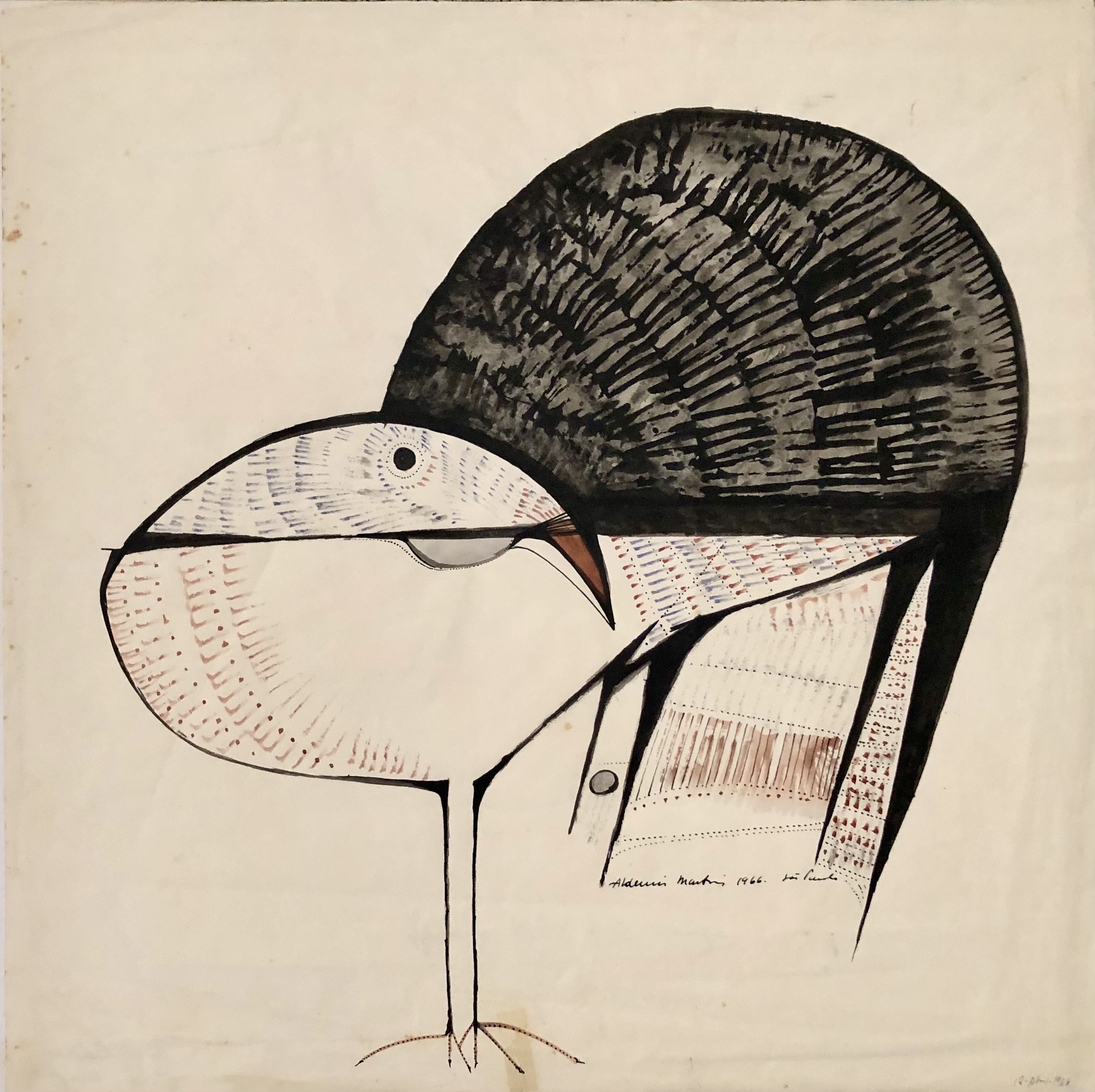 Aldemir Martins (Ingazeiras CE 1922 - São Paulo SP 2006). Pintor, gravador, desenhista, ilustrador. Em 1941, participa da criação do Centro Cultural de Belas Artes, em Fortaleza, com Antonio Bandeira (1922-1967), Raimundo Cela (1890-1954), Inimá de Paula (1918-1999) e Mario Baratta (1915-1983), um espaço para exposições permanentes e cursos de arte. Três anos depois, a instituição passa a chamar-se Sociedade Cearense de Artes Plásticas - SCAP. Aldemir Martins produz desenhos, xilogravuras, aquarelas e pinturas. Atua também como ilustrador na imprensa cearense. Em 1945, viaja para o Rio de Janeiro, e, menos de um ano depois, muda-se para São Paulo, onde realiza sua primeira individual e retoma a carreira de ilustrador. Entre 1949 e 1951, freqüenta os cursos do Museu de Arte de São Paulo Assis Chateaubriand - MASP e torna-se monitor da instituição. Estuda história da arte com Pietro Maria Bardi (1900-1999) e gravura com Poty Lazzarotto (1924-1998). Em 1959, recebe o prêmio de viagem ao exterior do Salão Nacional de Arte Moderna e permanece por dois anos na Itália. Desde o início da carreira sua produção é figurativa, e o artista emprega um repertório formal constantemente retomado: aves, sobretudo os galos; cangaceiros, inspirados nas figuras de cerâmica popular; gatos, realizados com linhas sinuosas; e ainda flores e frutas. Nas pinturas emprega cores intensas e contrastantes.