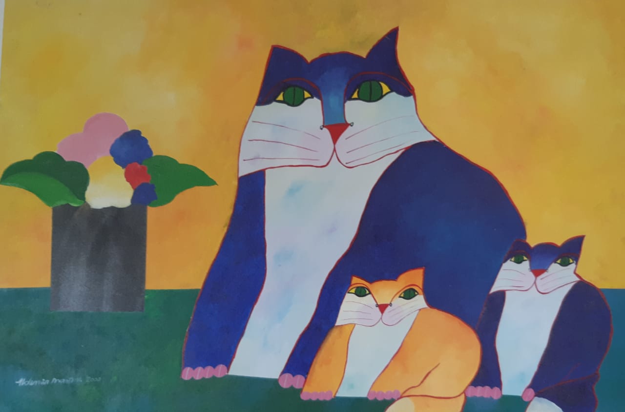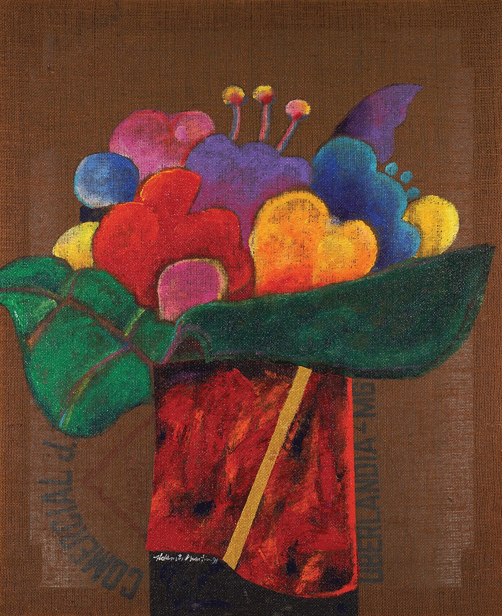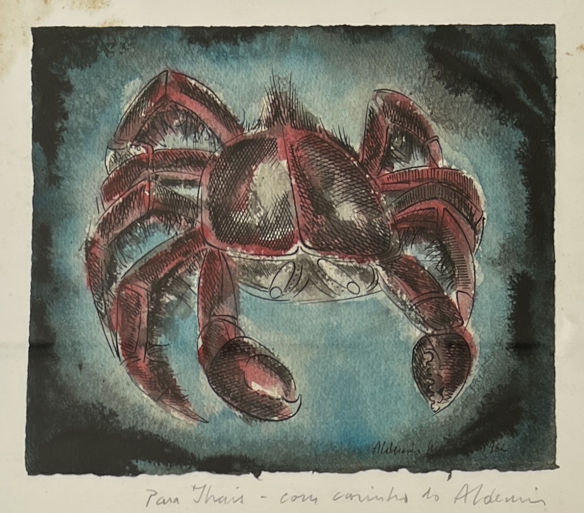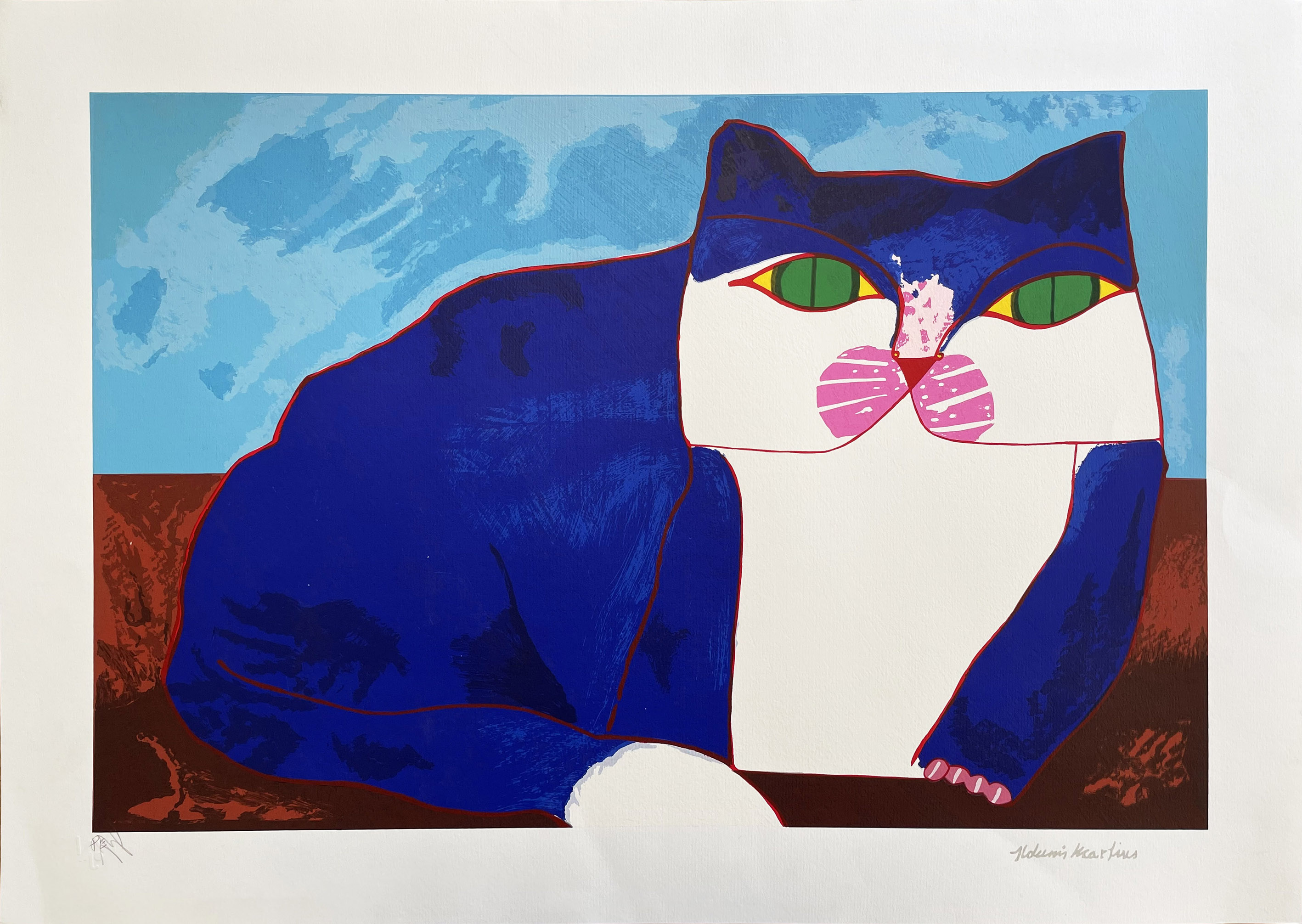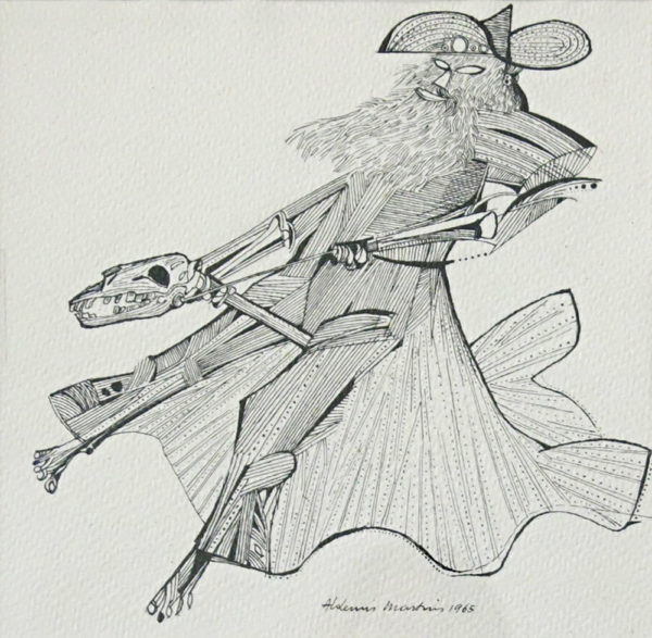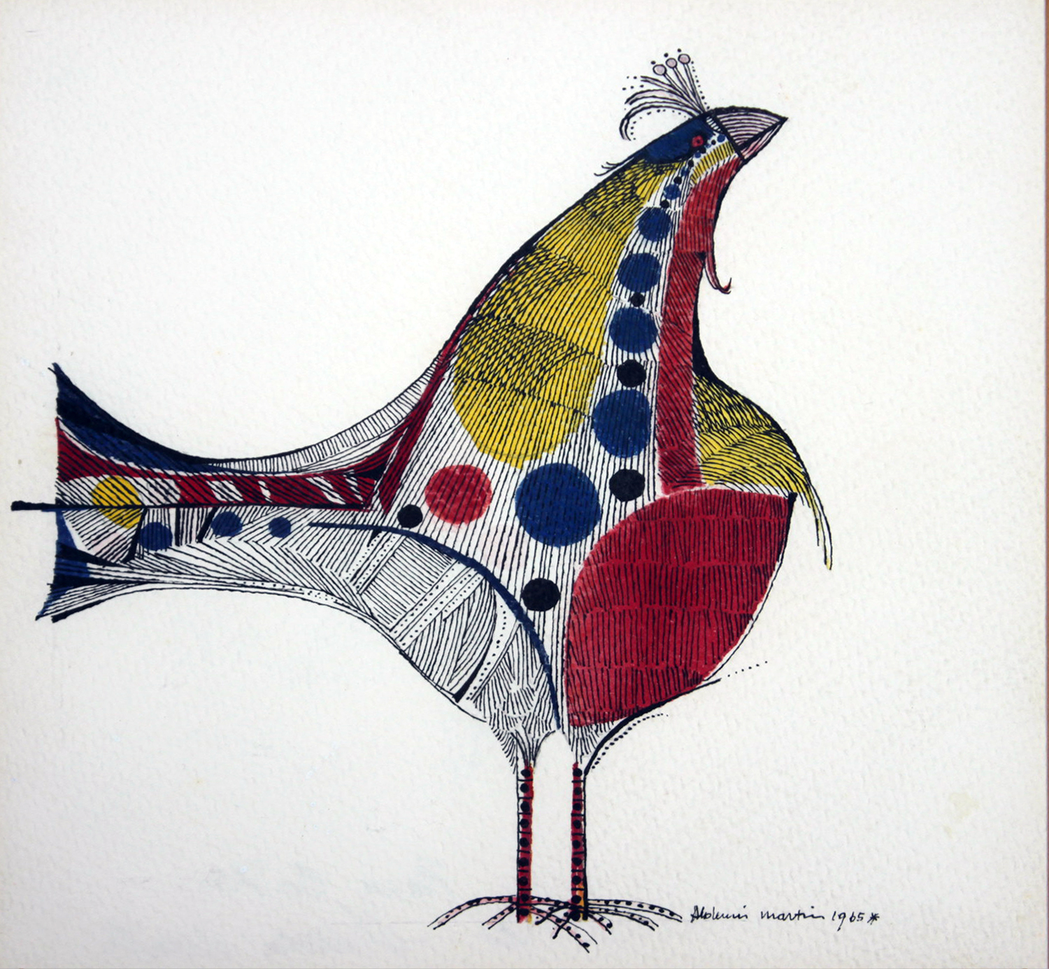 Aldemir Martins (Ingazeiras CE 1922 - São Paulo SP 2006). Pintor, gravador, desenhista, ilustrador. Em 1941, participa da criação do Centro Cultural de Belas Artes, em Fortaleza, com Antonio Bandeira (1922-1967), Raimundo Cela (1890-1954), Inimá de Paula (1918-1999) e Mario Baratta (1915-1983), um espaço para exposições permanentes e cursos de arte. Três anos depois, a instituição passa a chamar-se Sociedade Cearense de Artes Plásticas - SCAP. Aldemir Martins produz desenhos, xilogravuras, aquarelas e pinturas. Atua também como ilustrador na imprensa cearense. Em 1945, viaja para o Rio de Janeiro, e, menos de um ano depois, muda-se para São Paulo, onde realiza sua primeira individual e retoma a carreira de ilustrador. Entre 1949 e 1951, freqüenta os cursos do Museu de Arte de São Paulo Assis Chateaubriand - MASP e torna-se monitor da instituição. Estuda história da arte com Pietro Maria Bardi (1900-1999) e gravura com Poty Lazzarotto (1924-1998). Em 1959, recebe o prêmio de viagem ao exterior do Salão Nacional de Arte Moderna e permanece por dois anos na Itália. Desde o início da carreira sua produção é figurativa, e o artista emprega um repertório formal constantemente retomado: aves, sobretudo os galos; cangaceiros, inspirados nas figuras de cerâmica popular; gatos, realizados com linhas sinuosas; e ainda flores e frutas. Nas pinturas emprega cores intensas e contrastantes.