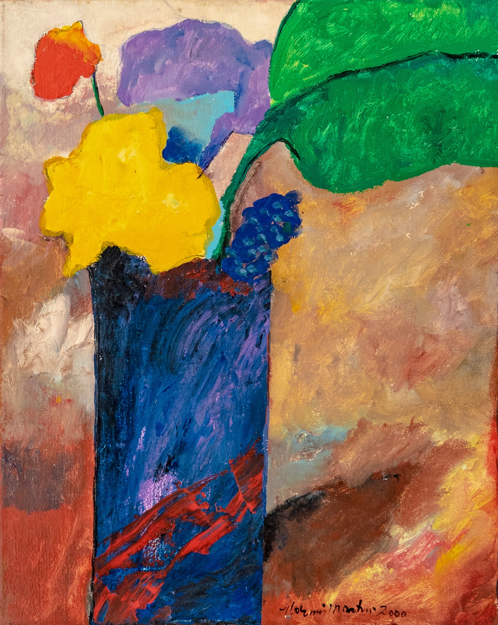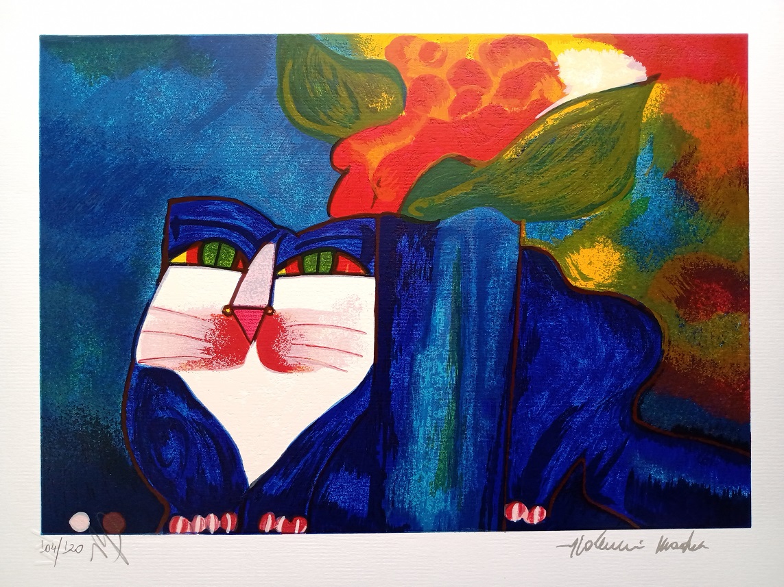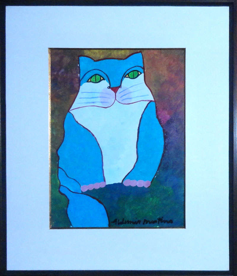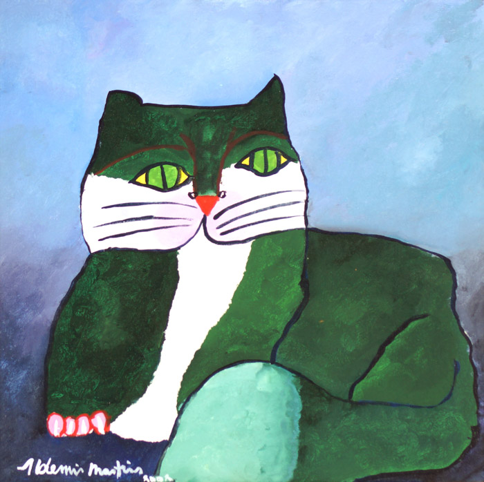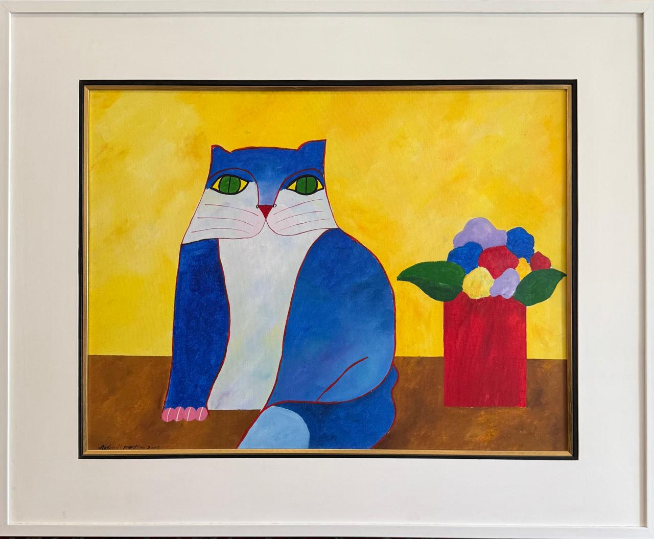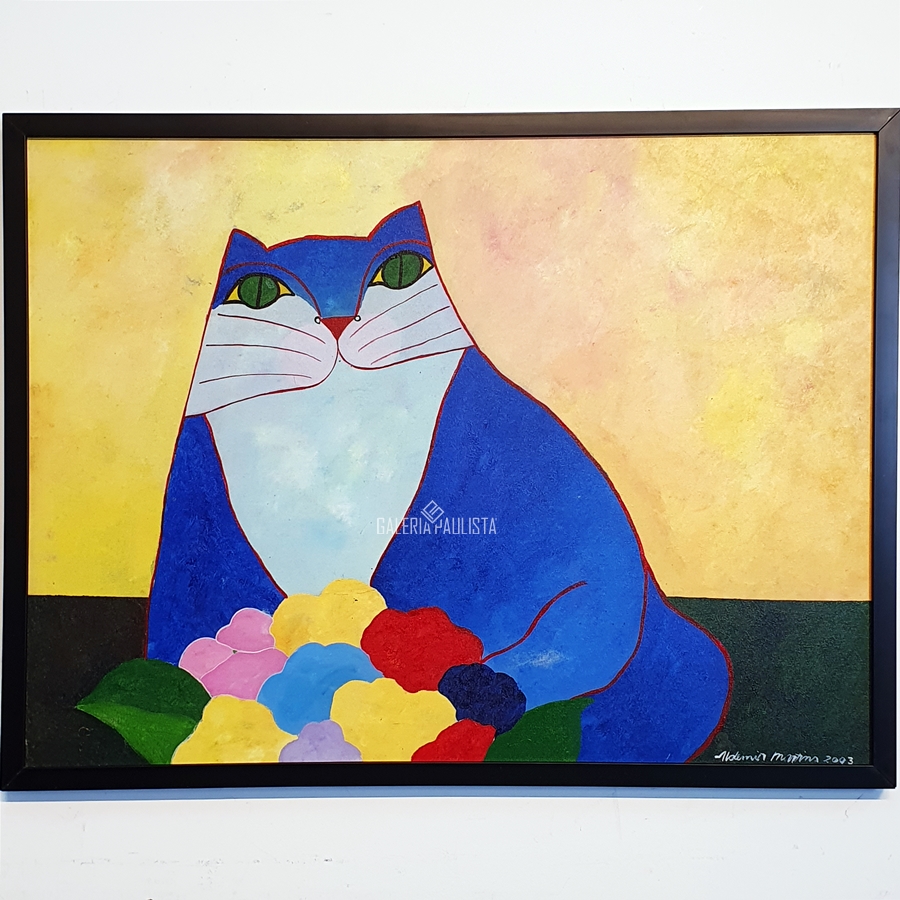 ALDEMIR MARTINS - Gato azul com vaso de flores - acrílico sobre tela - Medidas: 60 x 80 cm - Assinatura: canto inferior direito e dorso - 2003
