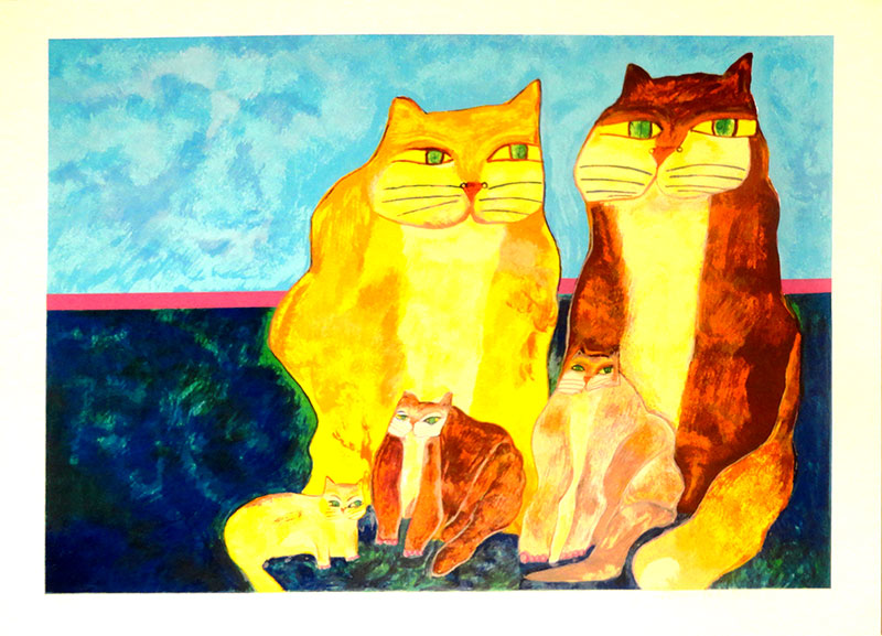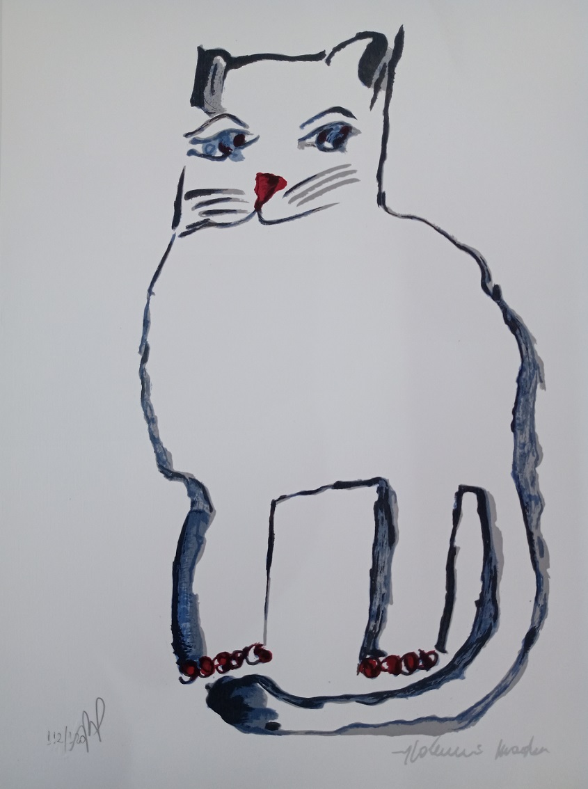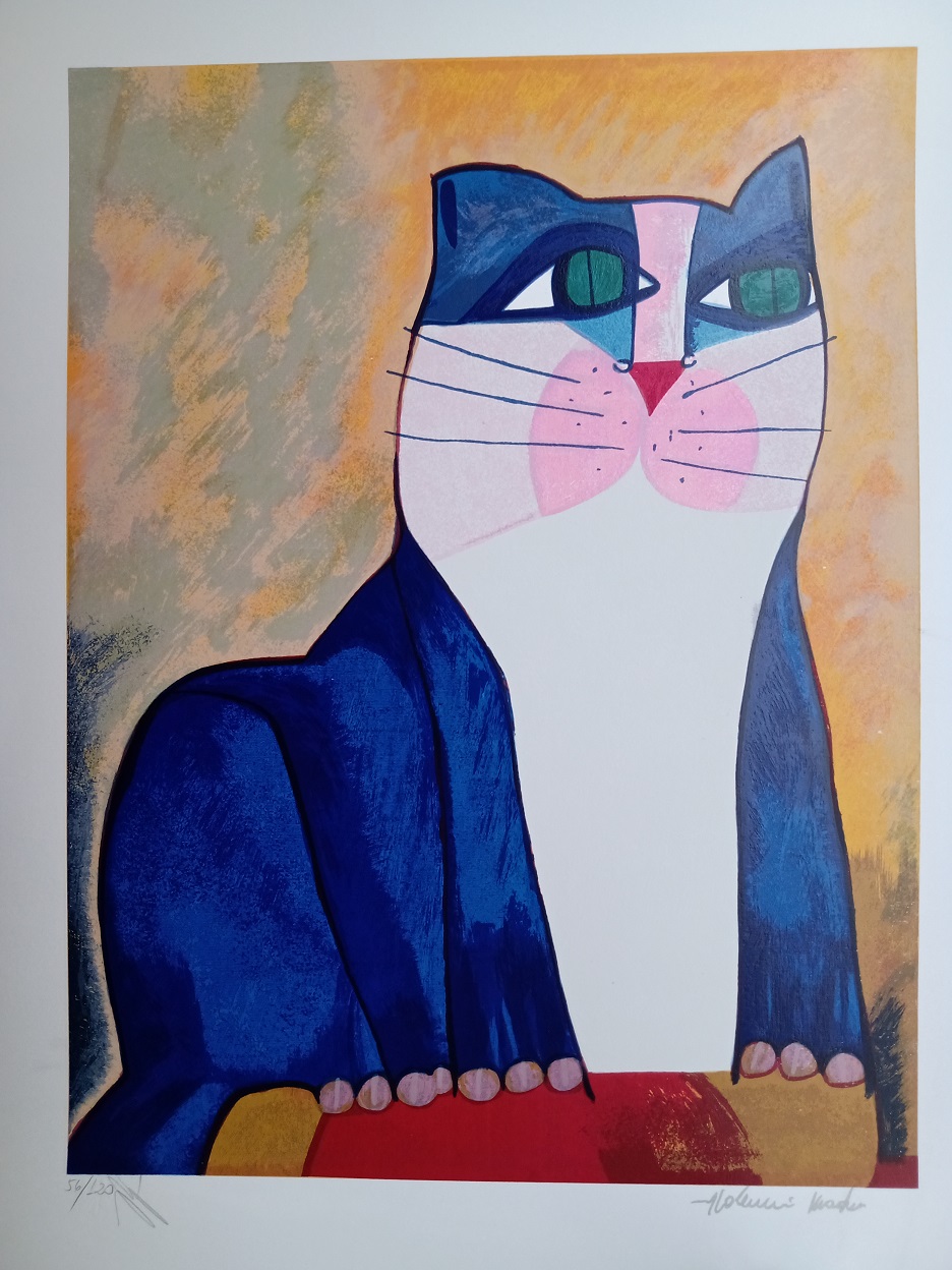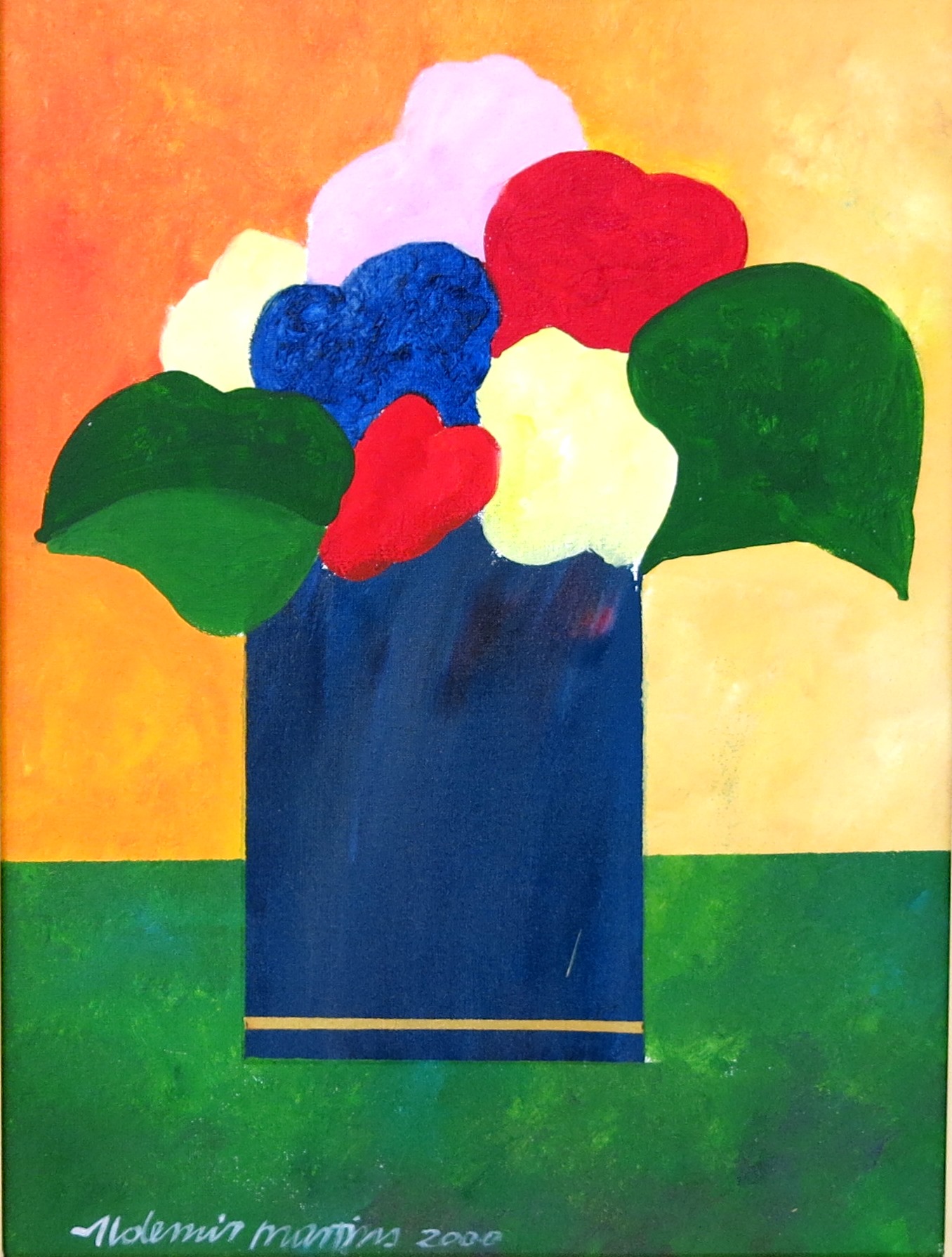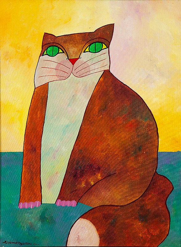ALDEMIR MARTINS - Gato azul com vaso de flores - acrílico sobre tela - Medidas: 60 x 80 cm - Assinatura: canto inferior direito e dorso - 2003