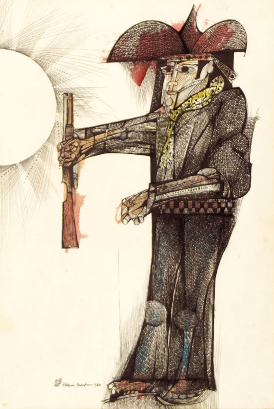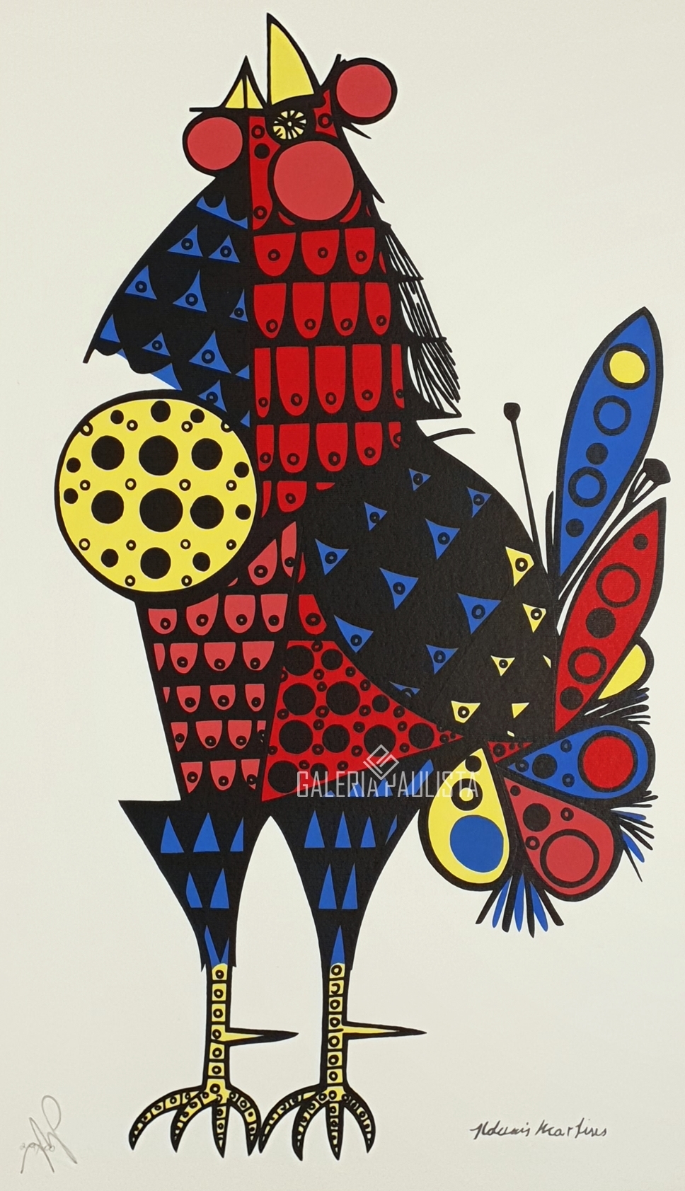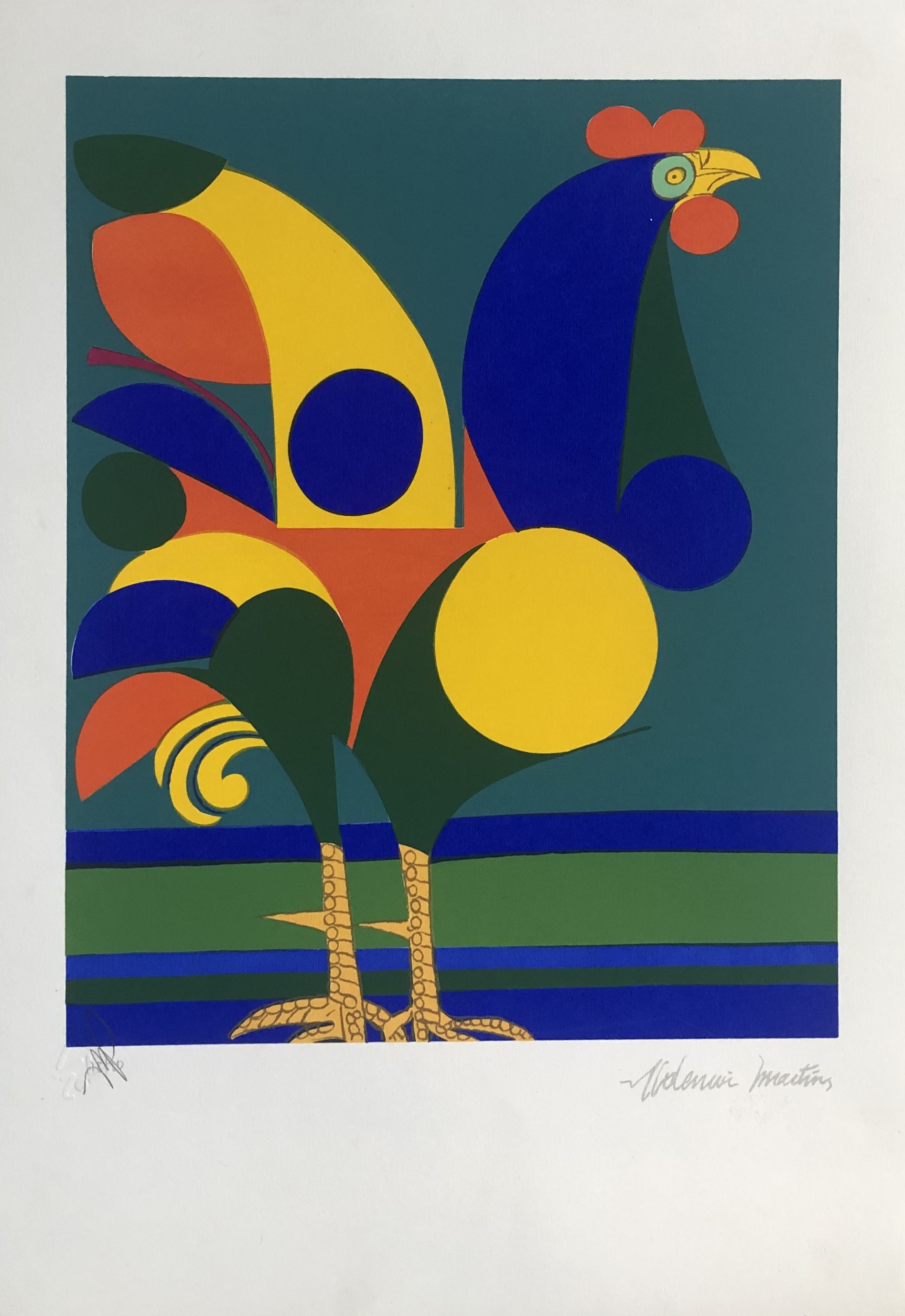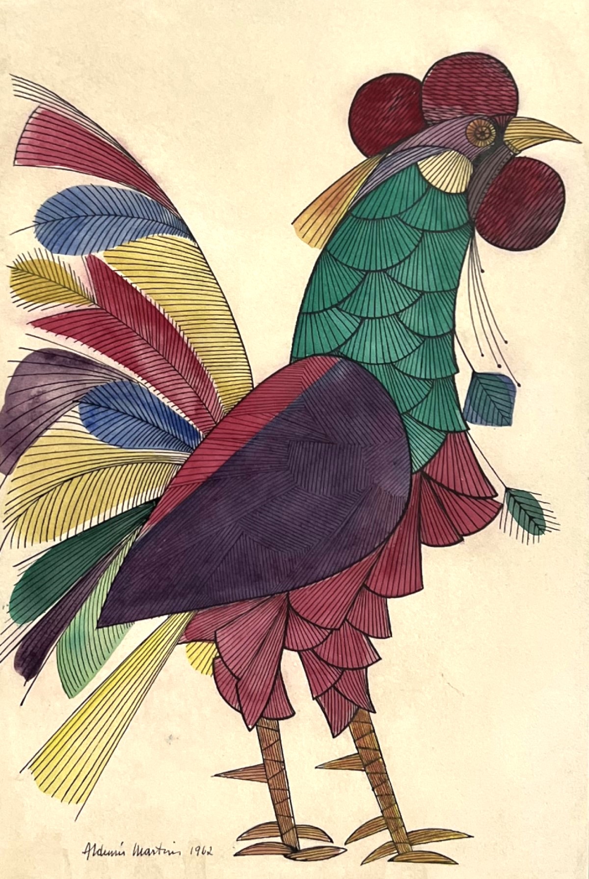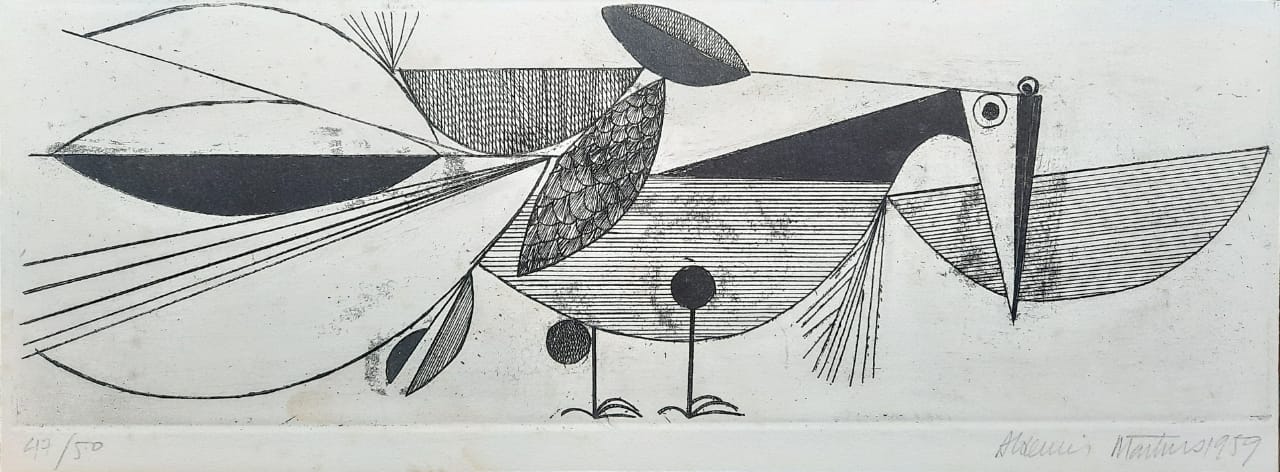 Aldemir Martins (Ingazeiras CE 1922 - São Paulo SP 2006). Pintor, gravador, desenhista, ilustrador. Em 1941, participa da criação do Centro Cultural de Belas Artes, em Fortaleza, com Antonio Bandeira (1922-1967), Raimundo Cela (1890-1954), Inimá de Paula (1918-1999) e Mario Baratta (1915-1983), um espaço para exposições permanentes e cursos de arte. Três anos depois, a instituição passa a chamar-se Sociedade Cearense de Artes Plásticas - SCAP. Aldemir Martins produz desenhos, xilogravuras, aquarelas e pinturas. Atua também como ilustrador na imprensa cearense. Em 1945, viaja para o Rio de Janeiro, e, menos de um ano depois, muda-se para São Paulo, onde realiza sua primeira individual e retoma a carreira de ilustrador. Entre 1949 e 1951, freqüenta os cursos do Museu de Arte de São Paulo Assis Chateaubriand - MASP e torna-se monitor da instituição. Estuda história da arte com Pietro Maria Bardi (1900-1999) e gravura com Poty Lazzarotto (1924-1998). Em 1959, recebe o prêmio de viagem ao exterior do Salão Nacional de Arte Moderna e permanece por dois anos na Itália. Desde o início da carreira sua produção é figurativa, e o artista emprega um repertório formal constantemente retomado: aves, sobretudo os galos; cangaceiros, inspirados nas figuras de cerâmica popular; gatos, realizados com linhas sinuosas; e ainda flores e frutas. Nas pinturas emprega cores intensas e contrastantes.