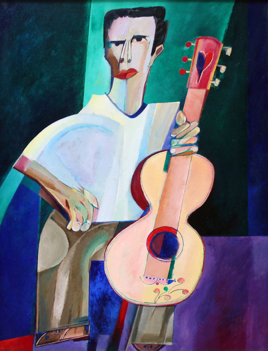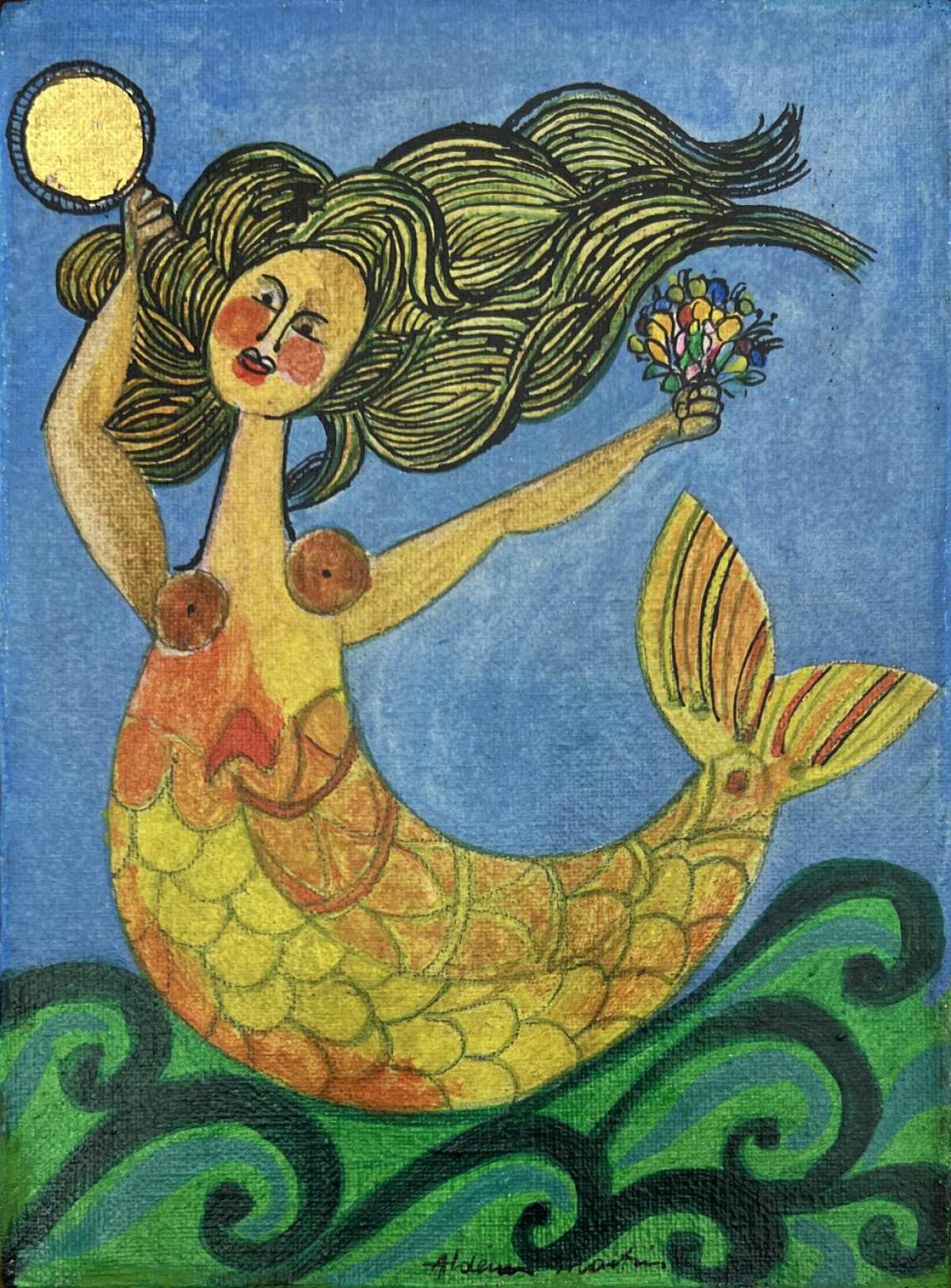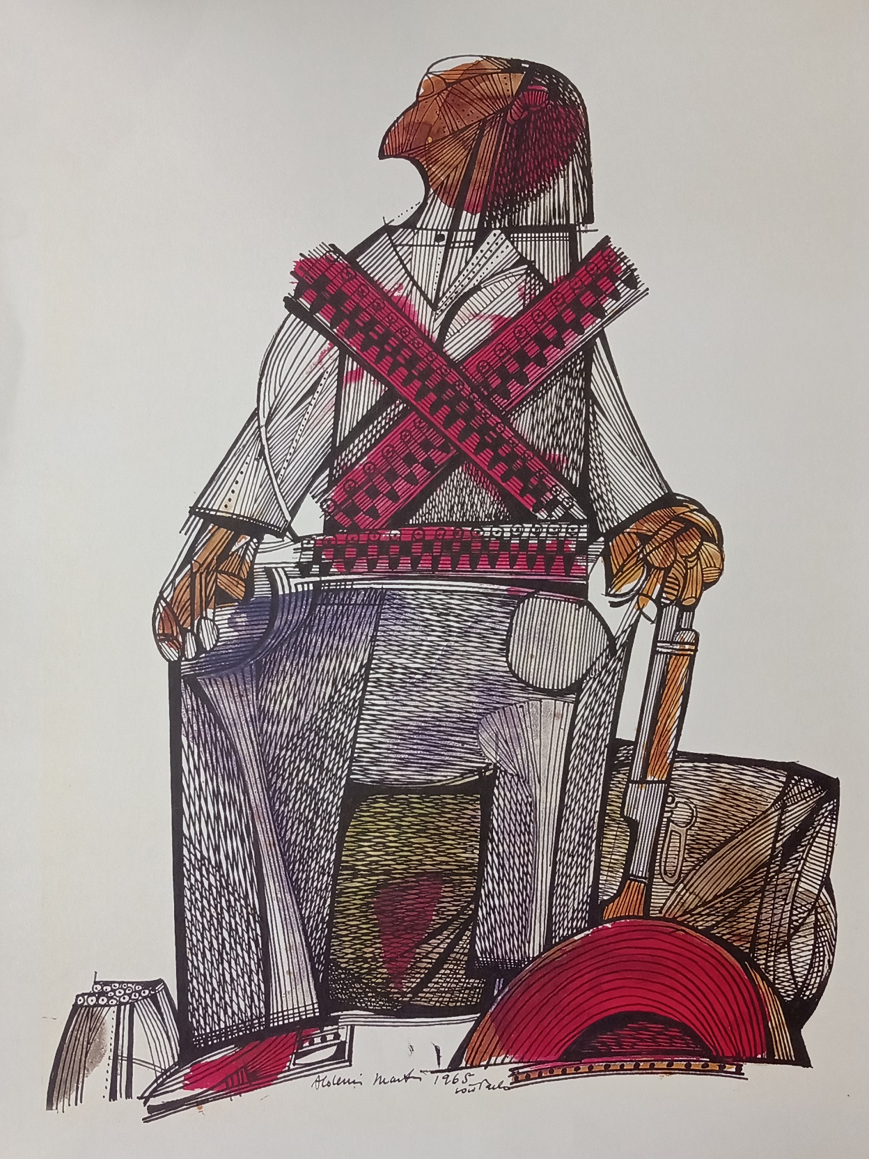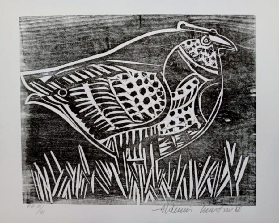 Aldemir Martins (Ingazeiras CE 1922 - São Paulo SP 2006). Pintor, gravador, desenhista, ilustrador. Em 1941, participa da criação do Centro Cultural de Belas Artes, em Fortaleza, com Antonio Bandeira (1922-1967), Raimundo Cela (1890-1954), Inimá de Paula (1918-1999) e Mario Baratta (1915-1983), um espaço para exposições permanentes e cursos de arte. Três anos depois, a instituição passa a chamar-se Sociedade Cearense de Artes Plásticas - SCAP. Aldemir Martins produz desenhos, xilogravuras, aquarelas e pinturas. Atua também como ilustrador na imprensa cearense. Em 1945, viaja para o Rio de Janeiro, e, menos de um ano depois, muda-se para São Paulo, onde realiza sua primeira individual e retoma a carreira de ilustrador. Entre 1949 e 1951, freqüenta os cursos do Museu de Arte de São Paulo Assis Chateaubriand - MASP e torna-se monitor da instituição. Estuda história da arte com Pietro Maria Bardi (1900-1999) e gravura com Poty Lazzarotto (1924-1998). Em 1959, recebe o prêmio de viagem ao exterior do Salão Nacional de Arte Moderna e permanece por dois anos na Itália. Desde o início da carreira sua produção é figurativa, e o artista emprega um repertório formal constantemente retomado: aves, sobretudo os galos; cangaceiros, inspirados nas figuras de cerâmica popular; gatos, realizados com linhas sinuosas; e ainda flores e frutas. Nas pinturas emprega cores intensas e contrastantes.
