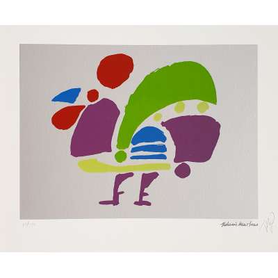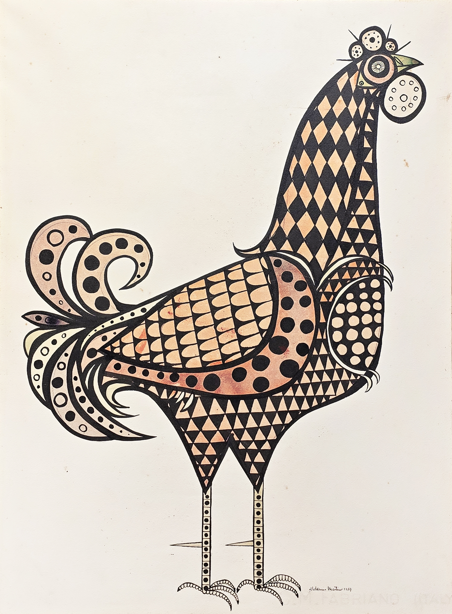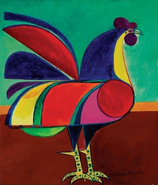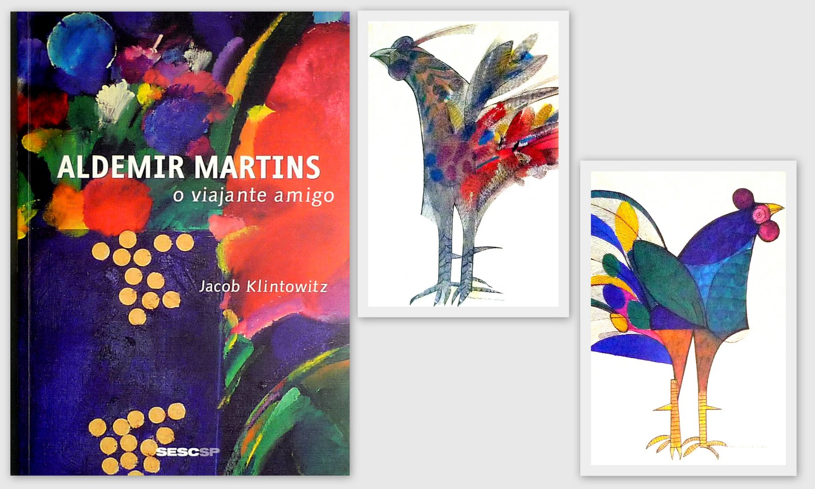 Aldemir Martins (Ingazeiras CE 1922 - São Paulo SP 2006). Pintor, gravador, desenhista, ilustrador. Em 1941, participa da criação do Centro Cultural de Belas Artes, em Fortaleza, com Antonio Bandeira (1922-1967), Raimundo Cela (1890-1954), Inimá de Paula (1918-1999) e Mario Baratta (1915-1983), um espaço para exposições permanentes e cursos de arte. Três anos depois, a instituição passa a chamar-se Sociedade Cearense de Artes Plásticas - SCAP. Aldemir Martins produz desenhos, xilogravuras, aquarelas e pinturas. Atua também como ilustrador na imprensa cearense. Em 1945, viaja para o Rio de Janeiro, e, menos de um ano depois, muda-se para São Paulo, onde realiza sua primeira individual e retoma a carreira de ilustrador. Entre 1949 e 1951, freqüenta os cursos do Museu de Arte de São Paulo Assis Chateaubriand - MASP e torna-se monitor da instituição. Estuda história da arte com Pietro Maria Bardi (1900-1999) e gravura com Poty Lazzarotto (1924-1998). Em 1959, recebe o prêmio de viagem ao exterior do Salão Nacional de Arte Moderna e permanece por dois anos na Itália. Desde o início da carreira sua produção é figurativa, e o artista emprega um repertório formal constantemente retomado: aves, sobretudo os galos; cangaceiros, inspirados nas figuras de cerâmica popular; gatos, realizados com linhas sinuosas; e ainda flores e frutas. Nas pinturas emprega cores intensas e contrastantes.