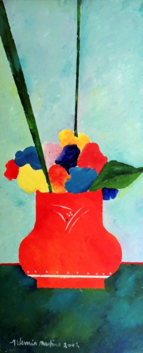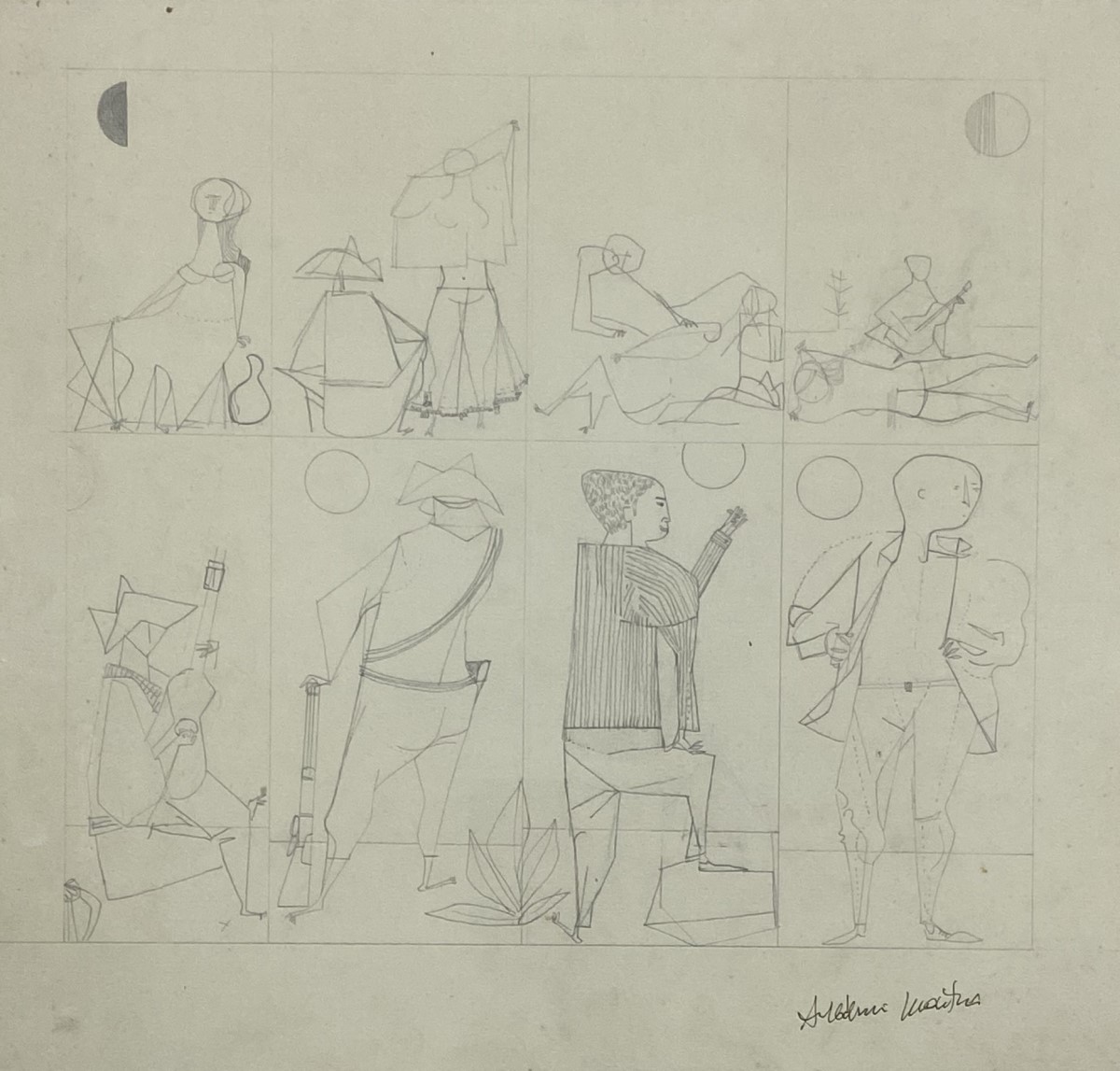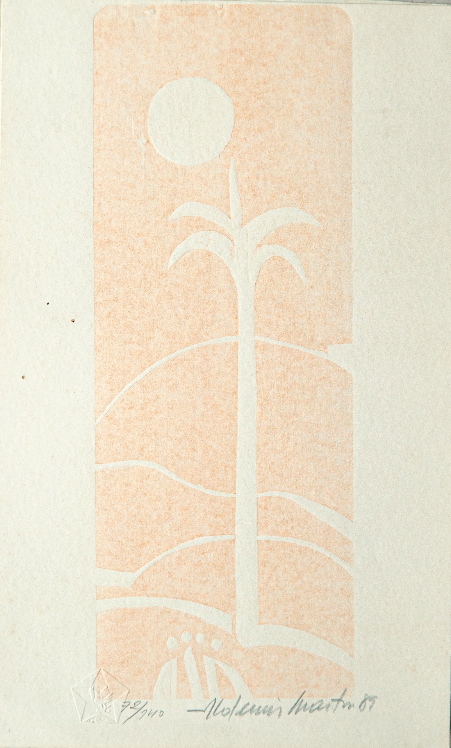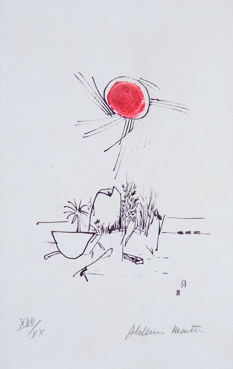 Aldemir Martins (Ingazeiras CE 1922 - São Paulo SP 2006). Pintor, gravador, desenhista, ilustrador. Em 1941, participa da criação do Centro Cultural de Belas Artes, em Fortaleza, com Antonio Bandeira (1922-1967), Raimundo Cela (1890-1954), Inimá de Paula (1918-1999) e Mario Baratta (1915-1983), um espaço para exposições permanentes e cursos de arte. Três anos depois, a instituição passa a chamar-se Sociedade Cearense de Artes Plásticas - SCAP. Aldemir Martins produz desenhos, xilogravuras, aquarelas e pinturas. Atua também como ilustrador na imprensa cearense. Em 1945, viaja para o Rio de Janeiro, e, menos de um ano depois, muda-se para São Paulo, onde realiza sua primeira individual e retoma a carreira de ilustrador. Entre 1949 e 1951, freqüenta os cursos do Museu de Arte de São Paulo Assis Chateaubriand - MASP e torna-se monitor da instituição. Estuda história da arte com Pietro Maria Bardi (1900-1999) e gravura com Poty Lazzarotto (1924-1998). Em 1959, recebe o prêmio de viagem ao exterior do Salão Nacional de Arte Moderna e permanece por dois anos na Itália. Desde o início da carreira sua produção é figurativa, e o artista emprega um repertório formal constantemente retomado: aves, sobretudo os galos; cangaceiros, inspirados nas figuras de cerâmica popular; gatos, realizados com linhas sinuosas; e ainda flores e frutas. Nas pinturas emprega cores intensas e contrastantes.