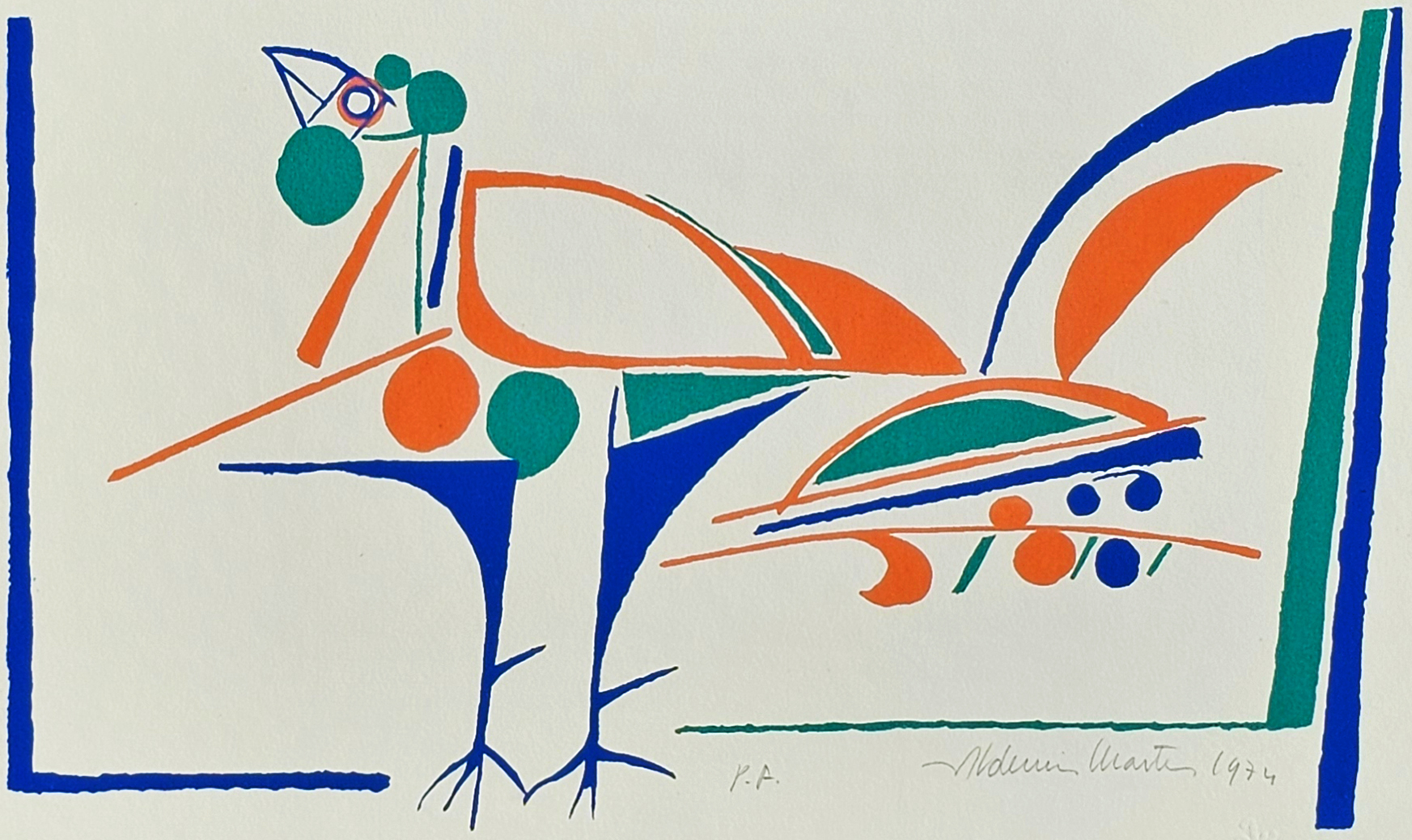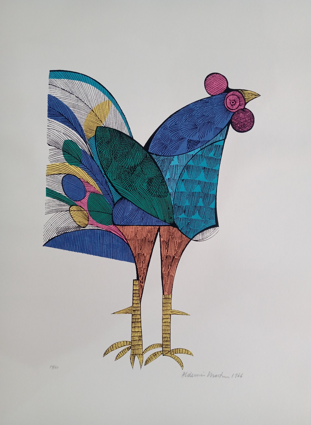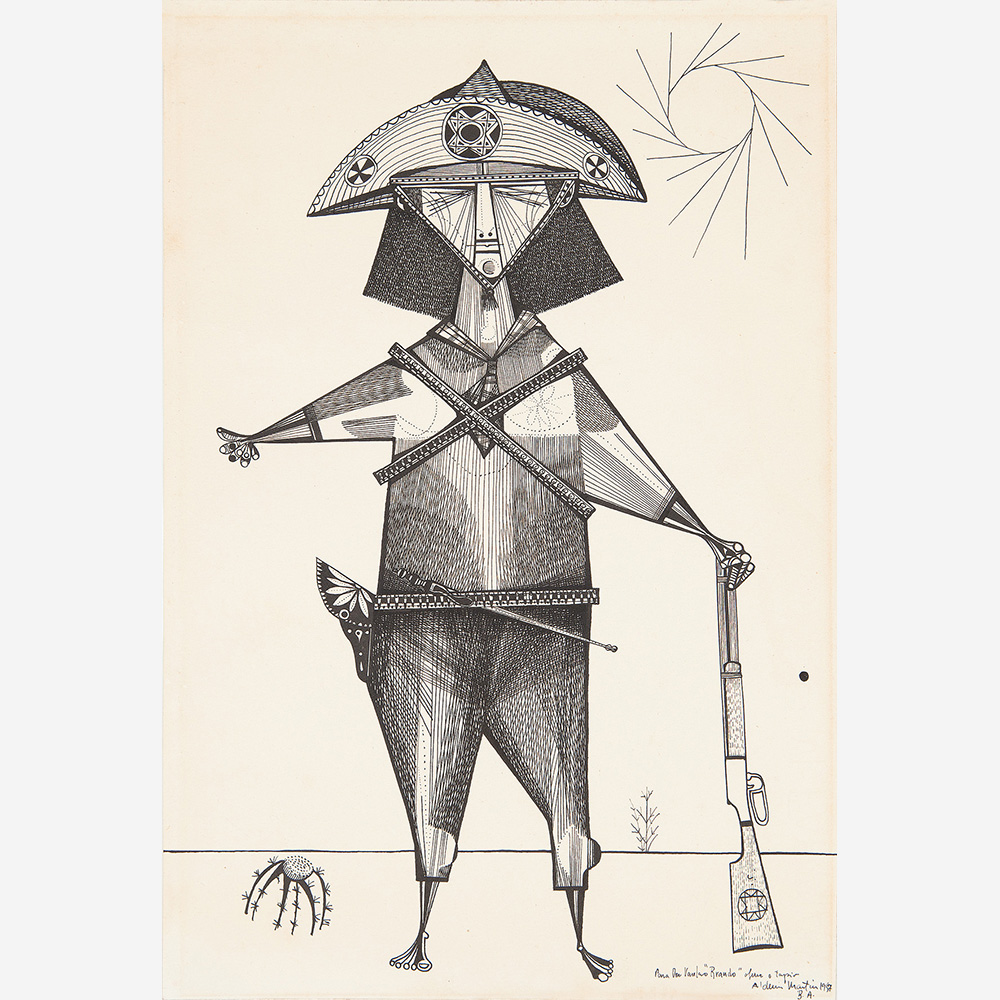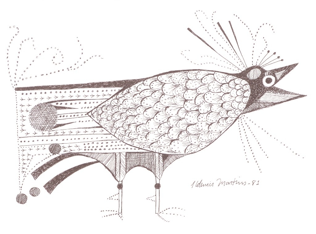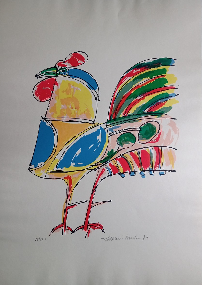 Aldemir Martins (Ingazeiras CE 1922 - São Paulo SP 2006). Pintor, gravador, desenhista, ilustrador. Em 1941, participa da criação do Centro Cultural de Belas Artes, em Fortaleza, com Antonio Bandeira (1922-1967), Raimundo Cela (1890-1954), Inimá de Paula (1918-1999) e Mario Baratta (1915-1983), um espaço para exposições permanentes e cursos de arte. Três anos depois, a instituição passa a chamar-se Sociedade Cearense de Artes Plásticas - SCAP. Aldemir Martins produz desenhos, xilogravuras, aquarelas e pinturas. Atua também como ilustrador na imprensa cearense. Em 1945, viaja para o Rio de Janeiro, e, menos de um ano depois, muda-se para São Paulo, onde realiza sua primeira individual e retoma a carreira de ilustrador. Entre 1949 e 1951, freqüenta os cursos do Museu de Arte de São Paulo Assis Chateaubriand - MASP e torna-se monitor da instituição. Estuda história da arte com Pietro Maria Bardi (1900-1999) e gravura com Poty Lazzarotto (1924-1998). Em 1959, recebe o prêmio de viagem ao exterior do Salão Nacional de Arte Moderna e permanece por dois anos na Itália. Desde o início da carreira sua produção é figurativa, e o artista emprega um repertório formal constantemente retomado: aves, sobretudo os galos; cangaceiros, inspirados nas figuras de cerâmica popular; gatos, realizados com linhas sinuosas; e ainda flores e frutas. Nas pinturas emprega cores intensas e contrastantes.