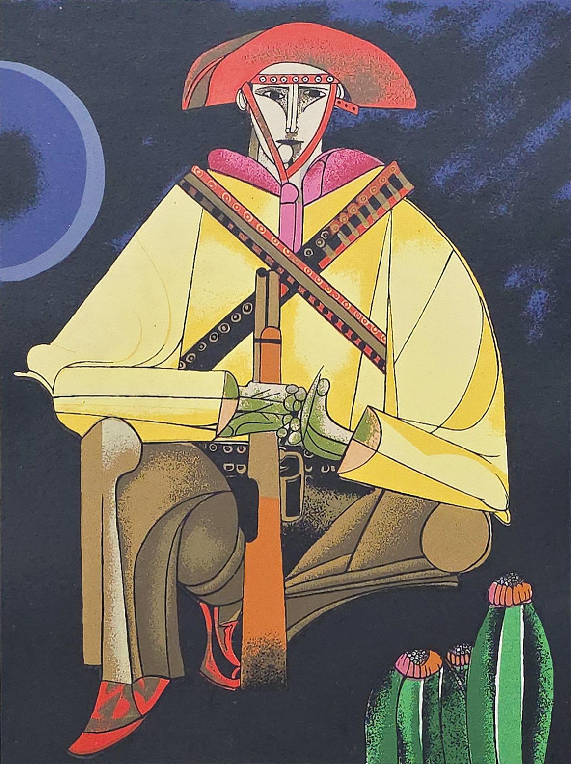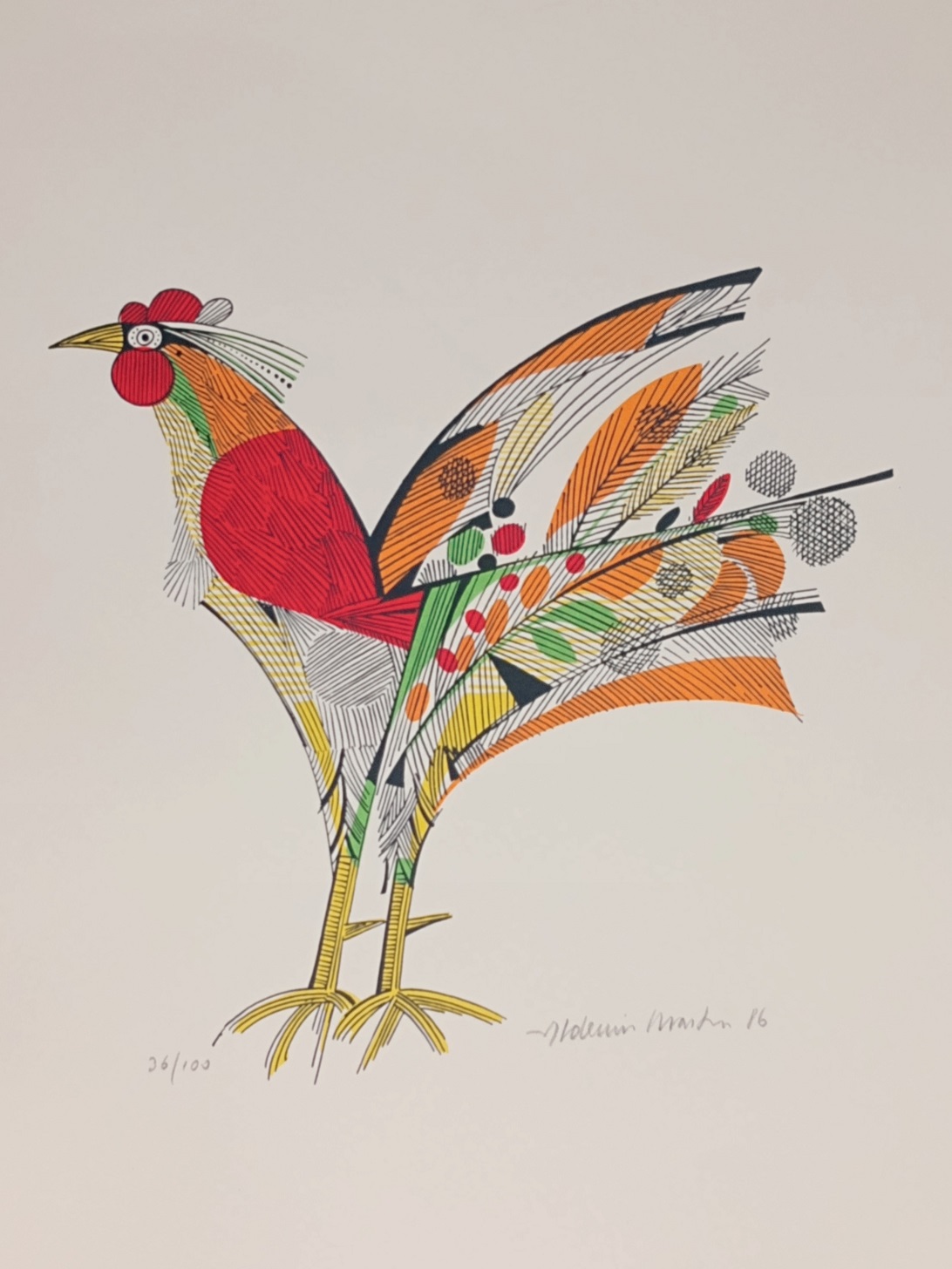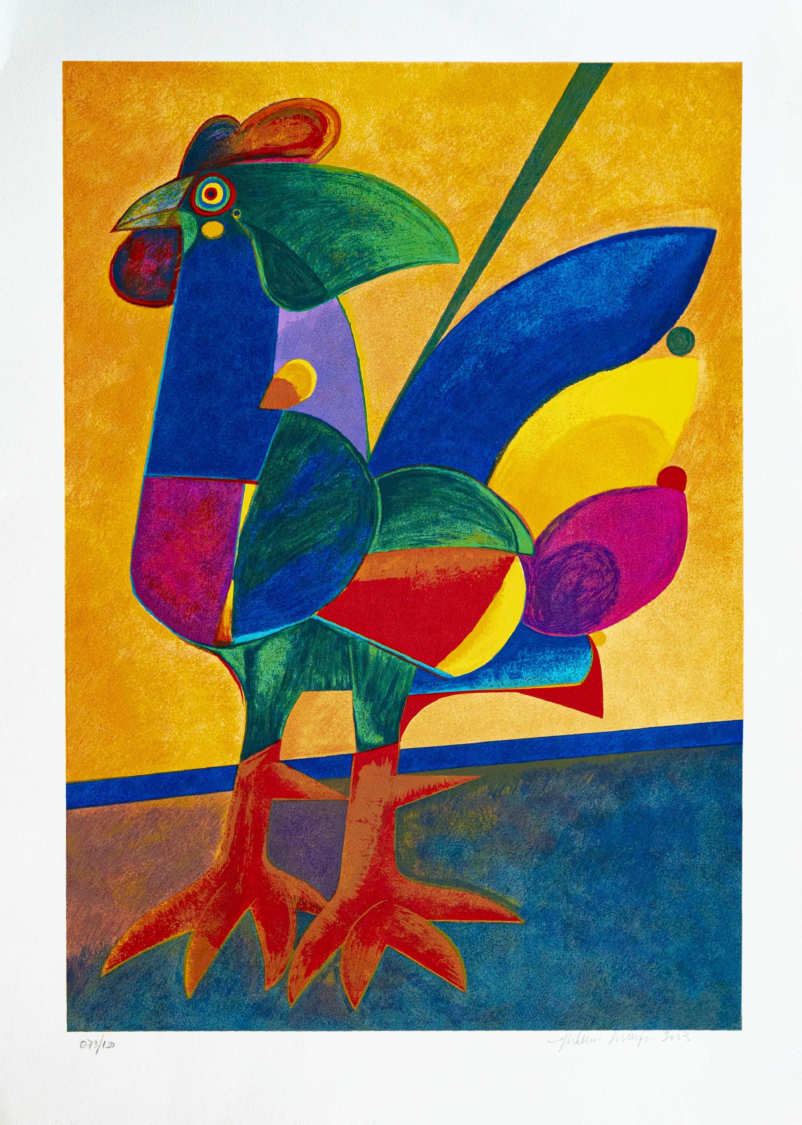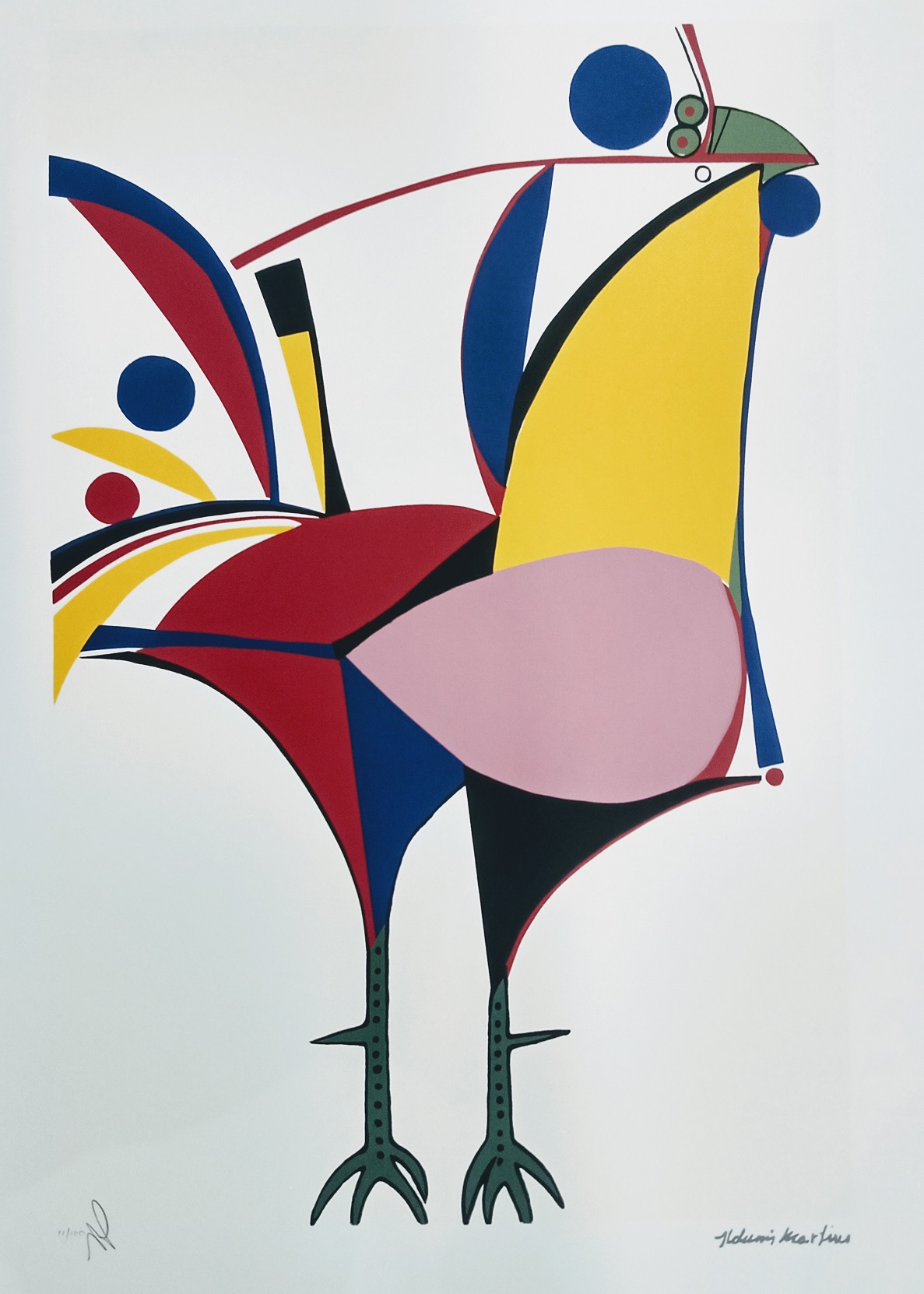 Aldemir Martins (Ingazeiras CE 1922 - São Paulo SP 2006). Pintor, gravador, desenhista, ilustrador. Em 1941, participa da criação do Centro Cultural de Belas Artes, em Fortaleza, com Antonio Bandeira (1922-1967), Raimundo Cela (1890-1954), Inimá de Paula (1918-1999) e Mario Baratta (1915-1983), um espaço para exposições permanentes e cursos de arte. Três anos depois, a instituição passa a chamar-se Sociedade Cearense de Artes Plásticas - SCAP. Aldemir Martins produz desenhos, xilogravuras, aquarelas e pinturas. Atua também como ilustrador na imprensa cearense. Em 1945, viaja para o Rio de Janeiro, e, menos de um ano depois, muda-se para São Paulo, onde realiza sua primeira individual e retoma a carreira de ilustrador. Entre 1949 e 1951, freqüenta os cursos do Museu de Arte de São Paulo Assis Chateaubriand - MASP e torna-se monitor da instituição. Estuda história da arte com Pietro Maria Bardi (1900-1999) e gravura com Poty Lazzarotto (1924-1998). Em 1959, recebe o prêmio de viagem ao exterior do Salão Nacional de Arte Moderna e permanece por dois anos na Itália. Desde o início da carreira sua produção é figurativa, e o artista emprega um repertório formal constantemente retomado: aves, sobretudo os galos; cangaceiros, inspirados nas figuras de cerâmica popular; gatos, realizados com linhas sinuosas; e ainda flores e frutas. Nas pinturas emprega cores intensas e contrastantes.