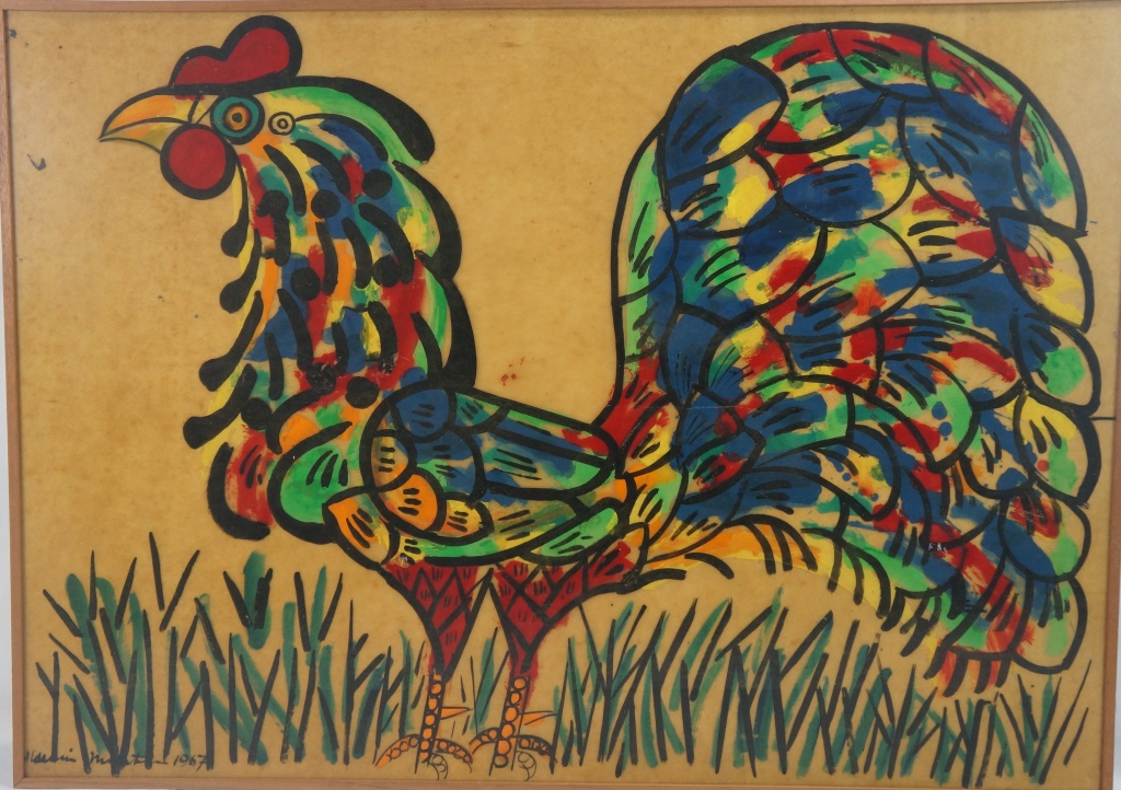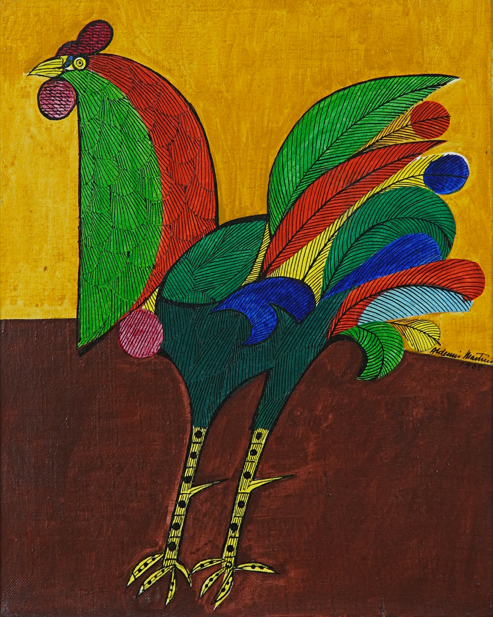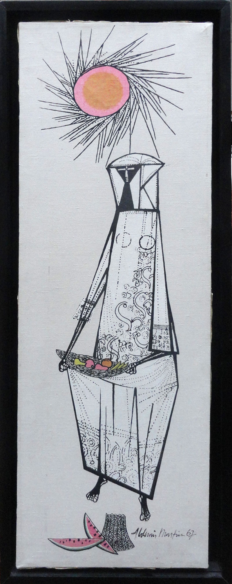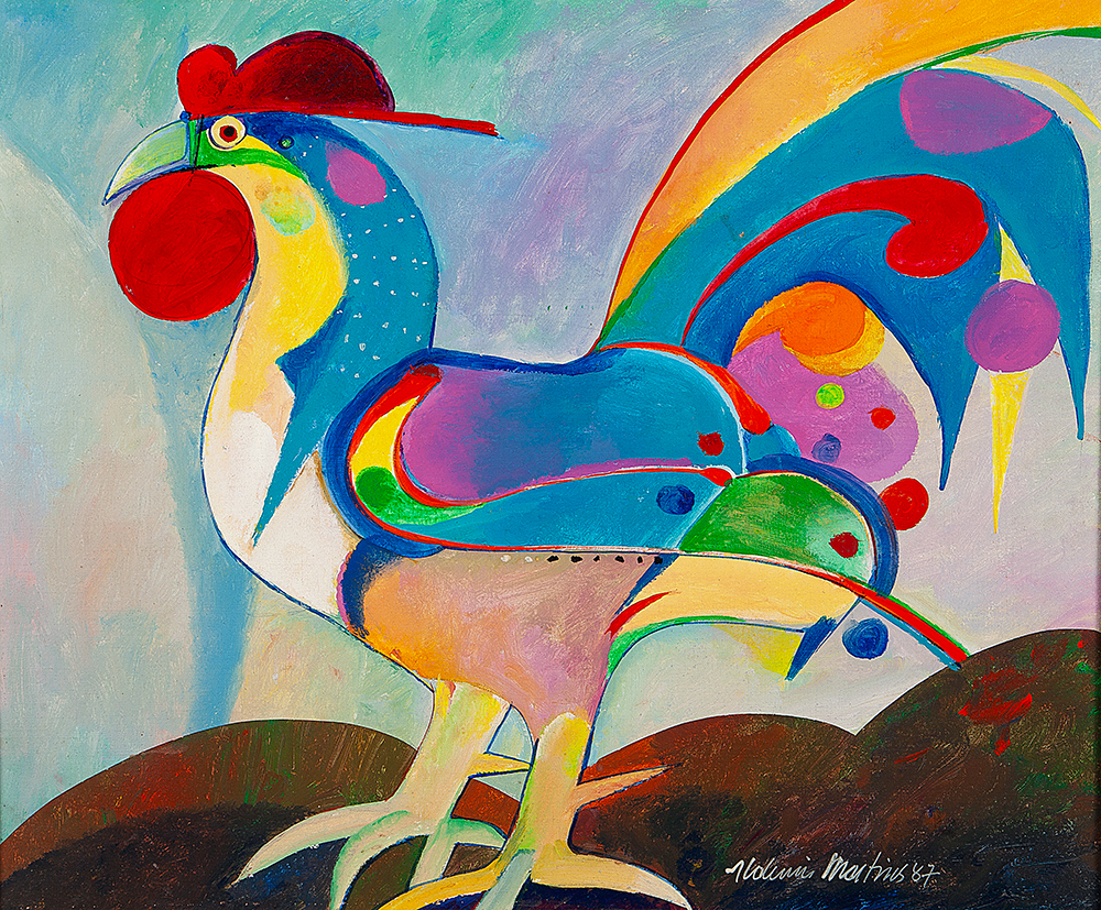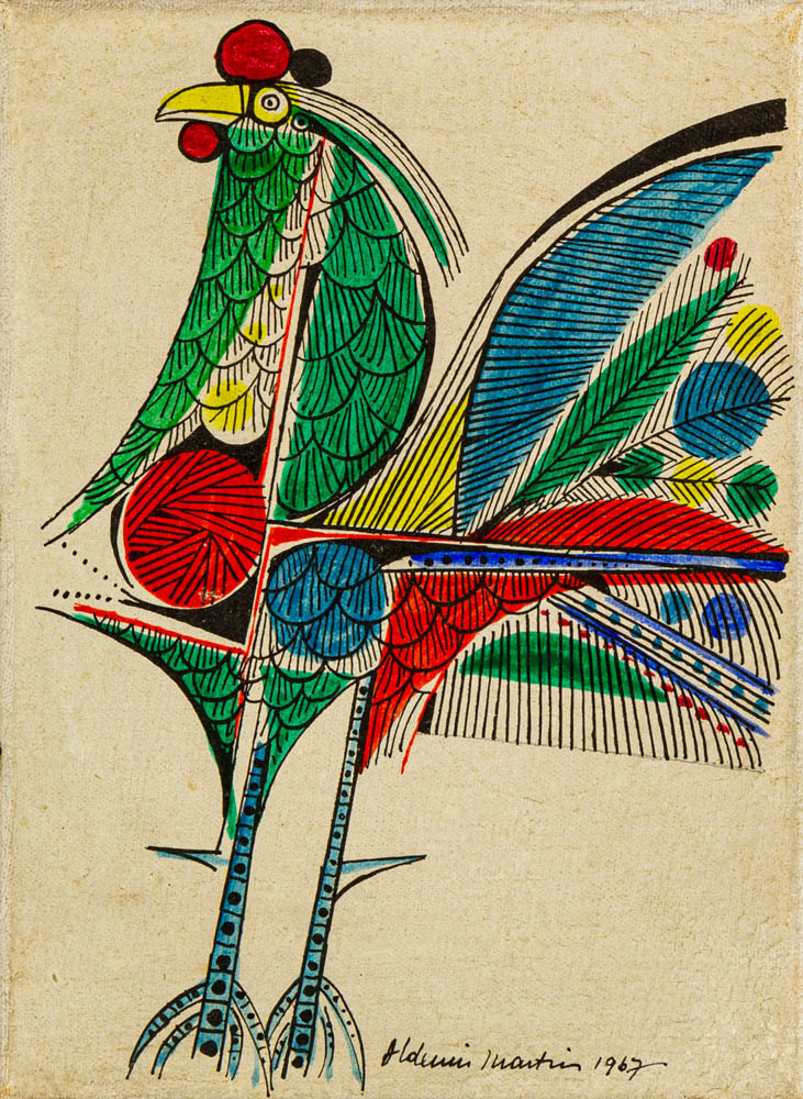 Aldemir Martins (Ingazeiras CE 1922 - São Paulo SP 2006). Pintor, gravador, desenhista, ilustrador. Em 1941, participa da criação do Centro Cultural de Belas Artes, em Fortaleza, com Antonio Bandeira (1922-1967), Raimundo Cela (1890-1954), Inimá de Paula (1918-1999) e Mario Baratta (1915-1983), um espaço para exposições permanentes e cursos de arte. Três anos depois, a instituição passa a chamar-se Sociedade Cearense de Artes Plásticas - SCAP. Aldemir Martins produz desenhos, xilogravuras, aquarelas e pinturas. Atua também como ilustrador na imprensa cearense. Em 1945, viaja para o Rio de Janeiro, e, menos de um ano depois, muda-se para São Paulo, onde realiza sua primeira individual e retoma a carreira de ilustrador. Entre 1949 e 1951, freqüenta os cursos do Museu de Arte de São Paulo Assis Chateaubriand - MASP e torna-se monitor da instituição. Estuda história da arte com Pietro Maria Bardi (1900-1999) e gravura com Poty Lazzarotto (1924-1998). Em 1959, recebe o prêmio de viagem ao exterior do Salão Nacional de Arte Moderna e permanece por dois anos na Itália. Desde o início da carreira sua produção é figurativa, e o artista emprega um repertório formal constantemente retomado: aves, sobretudo os galos; cangaceiros, inspirados nas figuras de cerâmica popular; gatos, realizados com linhas sinuosas; e ainda flores e frutas. Nas pinturas emprega cores intensas e contrastantes.
