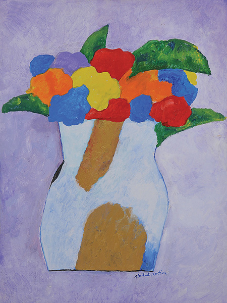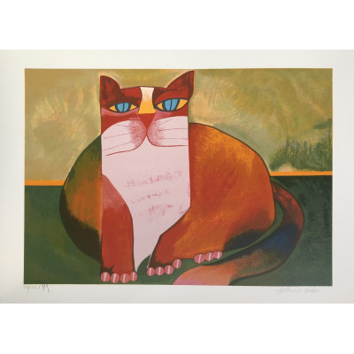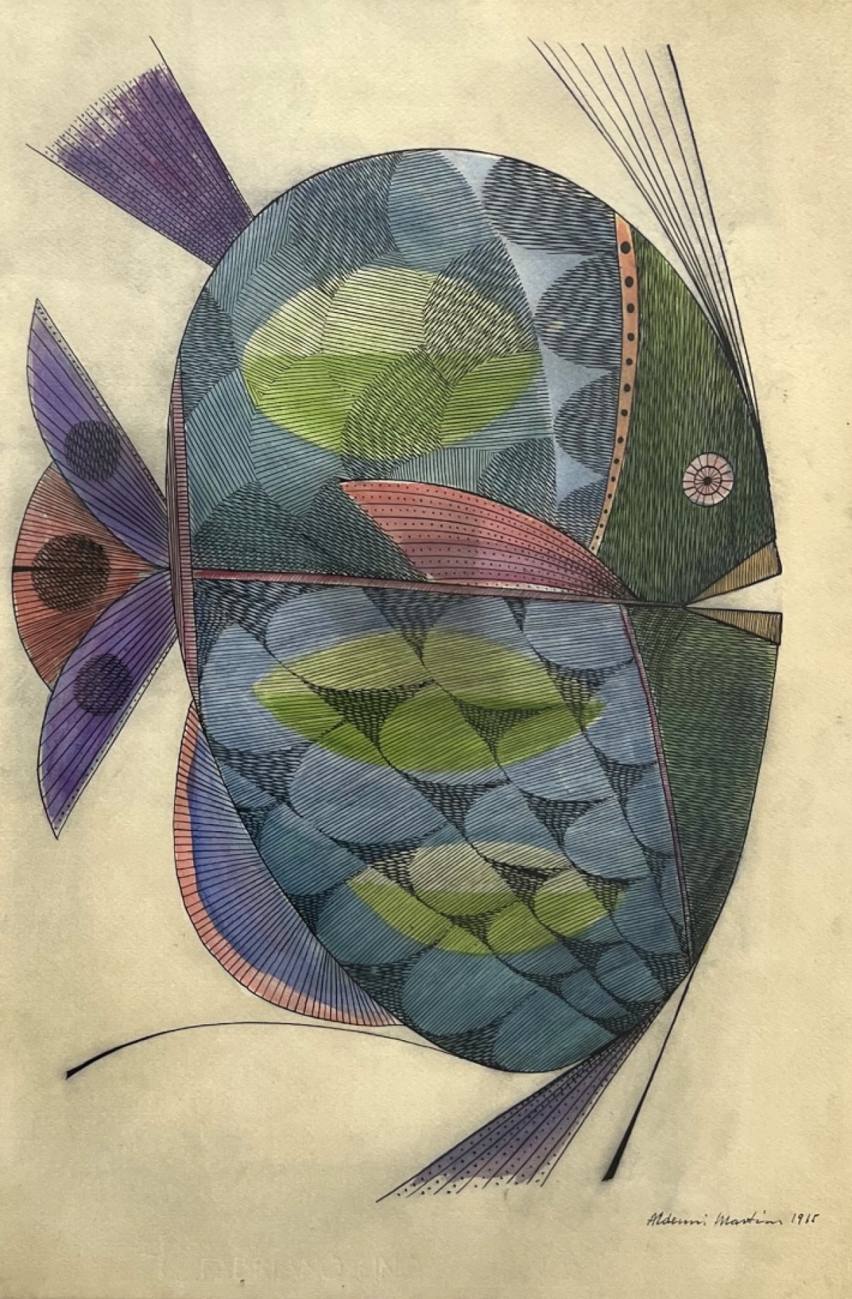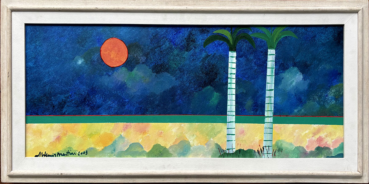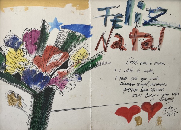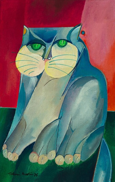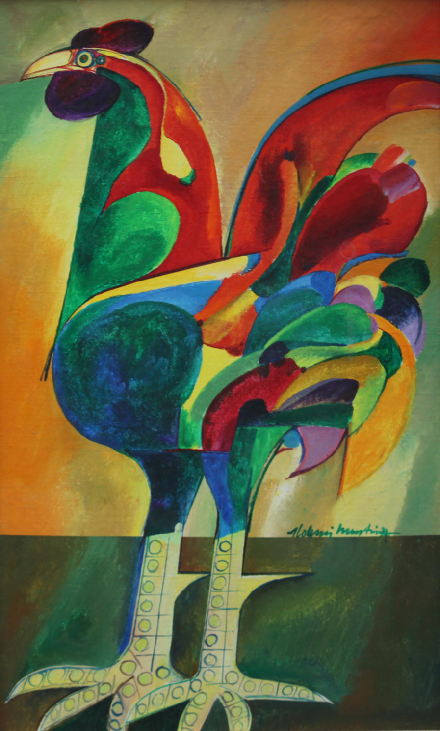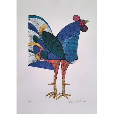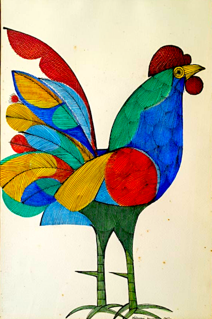 Aldemir Martins (Ingazeiras CE 1922 - São Paulo SP 2006). Pintor, gravador, desenhista, ilustrador. Em 1941, participa da criação do Centro Cultural de Belas Artes, em Fortaleza, com Antonio Bandeira (1922-1967), Raimundo Cela (1890-1954), Inimá de Paula (1918-1999) e Mario Baratta (1915-1983), um espaço para exposições permanentes e cursos de arte. Três anos depois, a instituição passa a chamar-se Sociedade Cearense de Artes Plásticas - SCAP. Aldemir Martins produz desenhos, xilogravuras, aquarelas e pinturas. Atua também como ilustrador na imprensa cearense. Em 1945, viaja para o Rio de Janeiro, e, menos de um ano depois, muda-se para São Paulo, onde realiza sua primeira individual e retoma a carreira de ilustrador. Entre 1949 e 1951, freqüenta os cursos do Museu de Arte de São Paulo Assis Chateaubriand - MASP e torna-se monitor da instituição. Estuda história da arte com Pietro Maria Bardi (1900-1999) e gravura com Poty Lazzarotto (1924-1998). Em 1959, recebe o prêmio de viagem ao exterior do Salão Nacional de Arte Moderna e permanece por dois anos na Itália. Desde o início da carreira sua produção é figurativa, e o artista emprega um repertório formal constantemente retomado: aves, sobretudo os galos; cangaceiros, inspirados nas figuras de cerâmica popular; gatos, realizados com linhas sinuosas; e ainda flores e frutas. Nas pinturas emprega cores intensas e contrastantes.