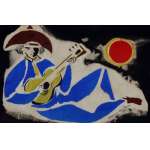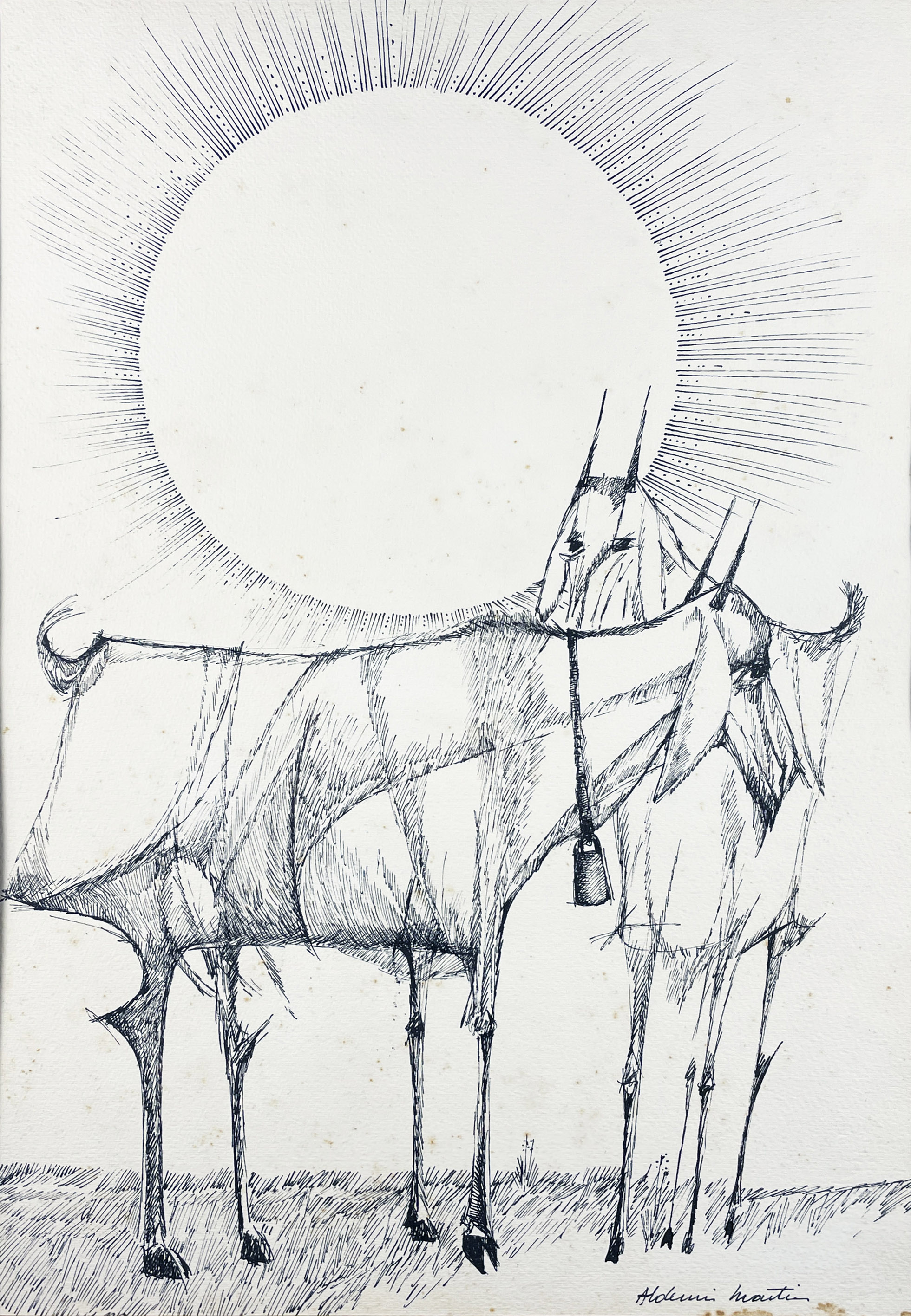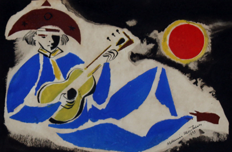 Aldemir Martins (Ingazeiras CE 1922 - São Paulo SP 2006). Pintor, gravador, desenhista, ilustrador. Em 1941, participa da criação do Centro Cultural de Belas Artes, em Fortaleza, com Antonio Bandeira (1922-1967), Raimundo Cela (1890-1954), Inimá de Paula (1918-1999) e Mario Baratta (1915-1983), um espaço para exposições permanentes e cursos de arte. Três anos depois, a instituição passa a chamar-se Sociedade Cearense de Artes Plásticas - SCAP. Aldemir Martins produz desenhos, xilogravuras, aquarelas e pinturas. Atua também como ilustrador na imprensa cearense. Em 1945, viaja para o Rio de Janeiro, e, menos de um ano depois, muda-se para São Paulo, onde realiza sua primeira individual e retoma a carreira de ilustrador. Entre 1949 e 1951, freqüenta os cursos do Museu de Arte de São Paulo Assis Chateaubriand - MASP e torna-se monitor da instituição. Estuda história da arte com Pietro Maria Bardi (1900-1999) e gravura com Poty Lazzarotto (1924-1998). Em 1959, recebe o prêmio de viagem ao exterior do Salão Nacional de Arte Moderna e permanece por dois anos na Itália. Desde o início da carreira sua produção é figurativa, e o artista emprega um repertório formal constantemente retomado: aves, sobretudo os galos; cangaceiros, inspirados nas figuras de cerâmica popular; gatos, realizados com linhas sinuosas; e ainda flores e frutas. Nas pinturas emprega cores intensas e contrastantes.