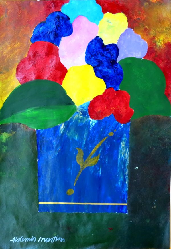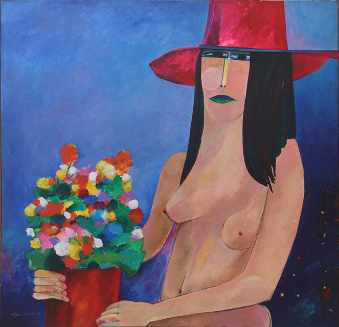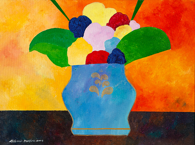 Aldemir Martins - Vaso de flores. Óleo sobre tela, 75x25 cm, sem data, sem assinatura. Com moldura e certificado do Estúdio Aldemir Martins.