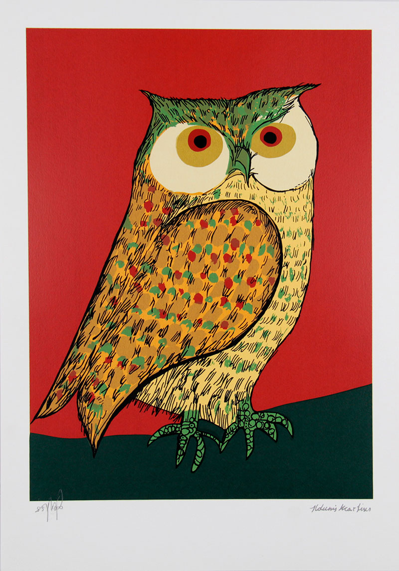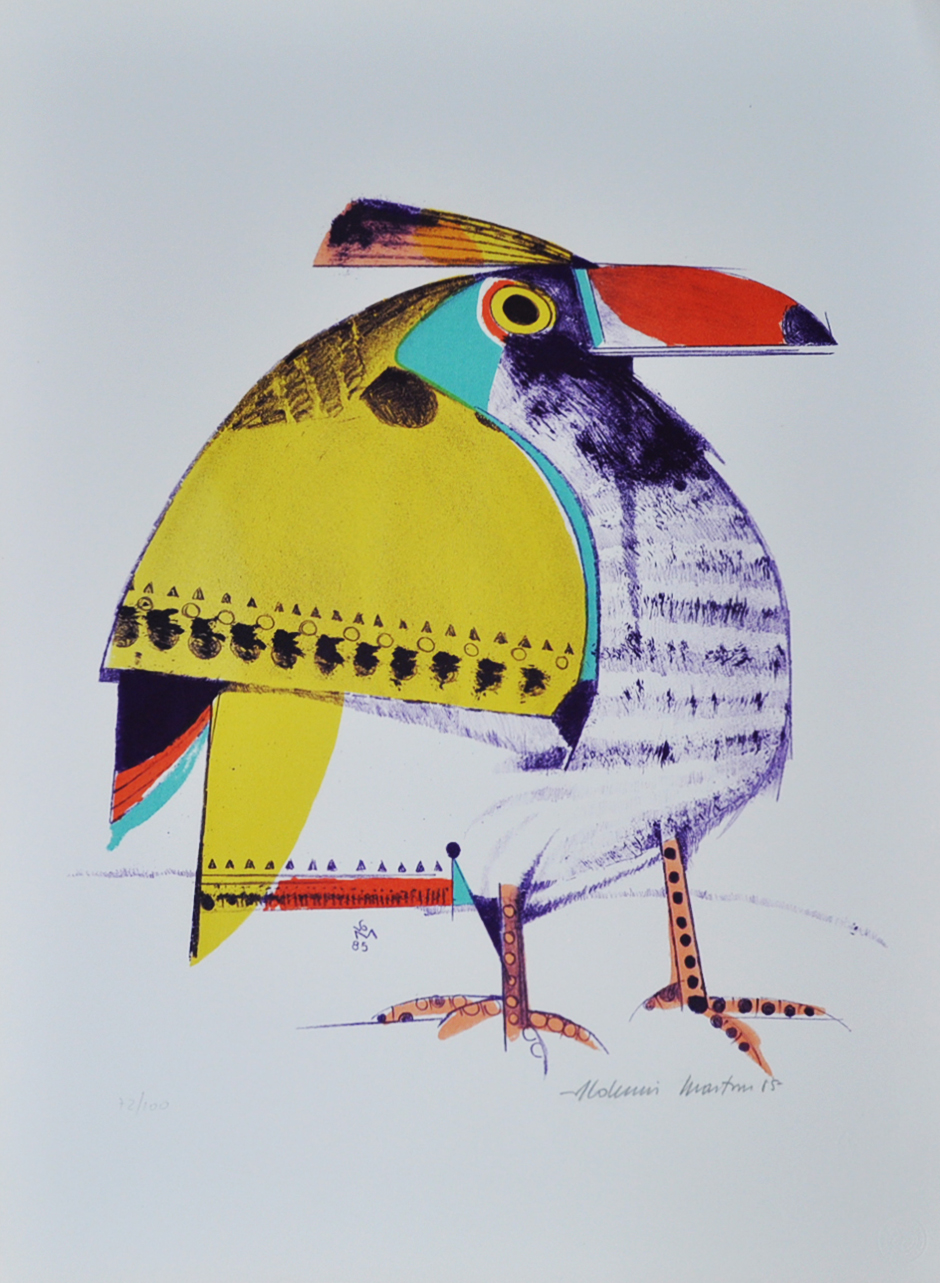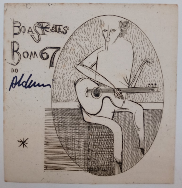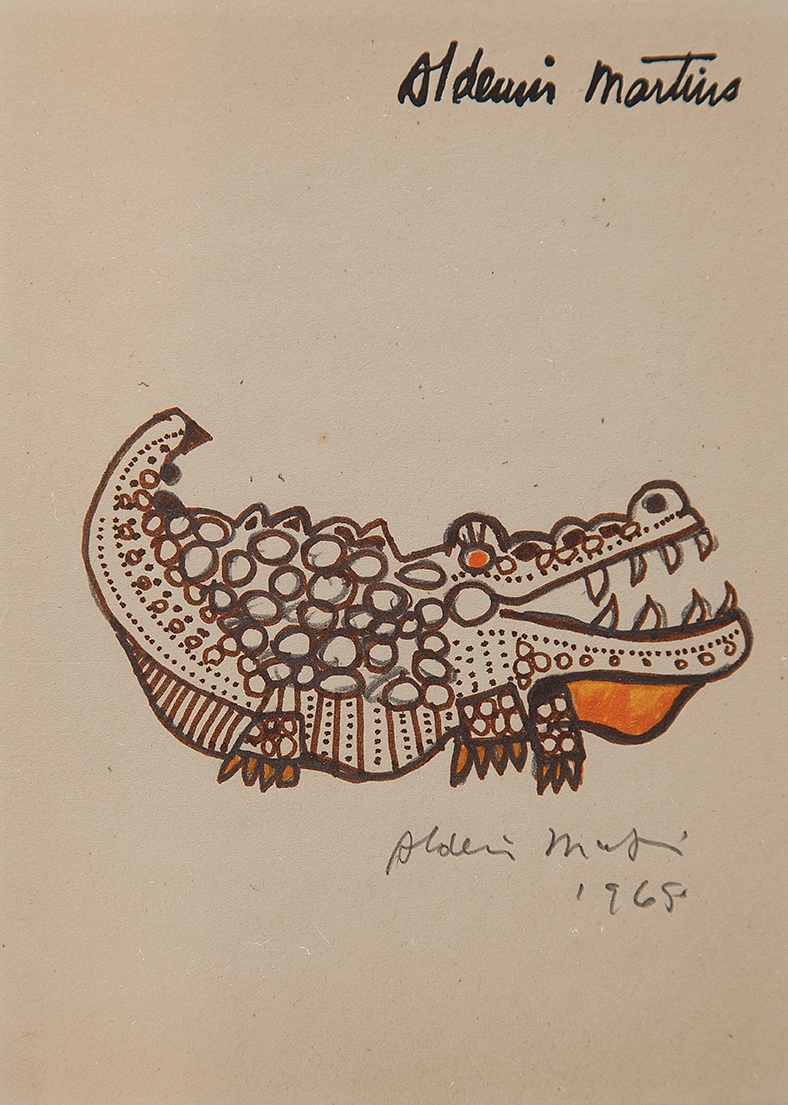 Aldemir Martins (Ingazeiras CE 1922 - São Paulo SP 2006). Pintor, gravador, desenhista, ilustrador. Em 1941, participa da criação do Centro Cultural de Belas Artes, em Fortaleza, com Antonio Bandeira (1922-1967), Raimundo Cela (1890-1954), Inimá de Paula (1918-1999) e Mario Baratta (1915-1983), um espaço para exposições permanentes e cursos de arte. Três anos depois, a instituição passa a chamar-se Sociedade Cearense de Artes Plásticas - SCAP. Aldemir Martins produz desenhos, xilogravuras, aquarelas e pinturas. Atua também como ilustrador na imprensa cearense. Em 1945, viaja para o Rio de Janeiro, e, menos de um ano depois, muda-se para São Paulo, onde realiza sua primeira individual e retoma a carreira de ilustrador. Entre 1949 e 1951, freqüenta os cursos do Museu de Arte de São Paulo Assis Chateaubriand - MASP e torna-se monitor da instituição. Estuda história da arte com Pietro Maria Bardi (1900-1999) e gravura com Poty Lazzarotto (1924-1998). Em 1959, recebe o prêmio de viagem ao exterior do Salão Nacional de Arte Moderna e permanece por dois anos na Itália. Desde o início da carreira sua produção é figurativa, e o artista emprega um repertório formal constantemente retomado: aves, sobretudo os galos; cangaceiros, inspirados nas figuras de cerâmica popular; gatos, realizados com linhas sinuosas; e ainda flores e frutas. Nas pinturas emprega cores intensas e contrastantes.