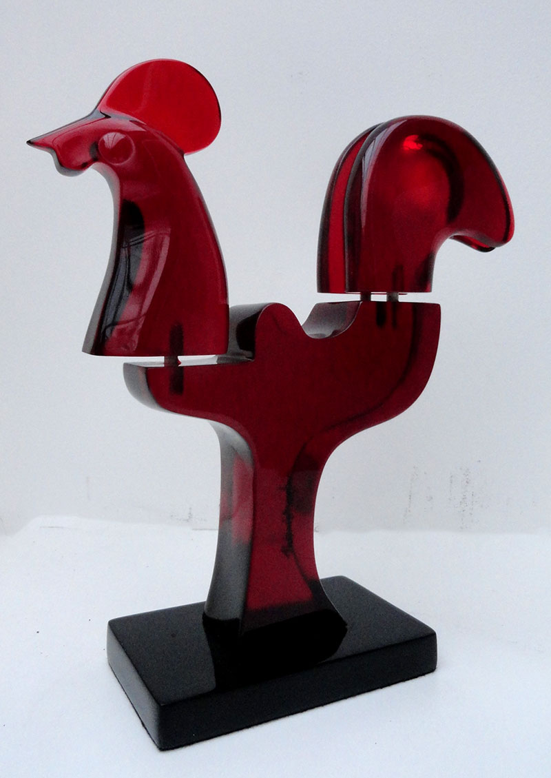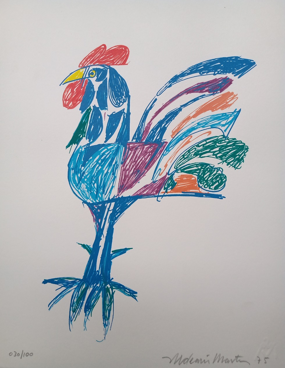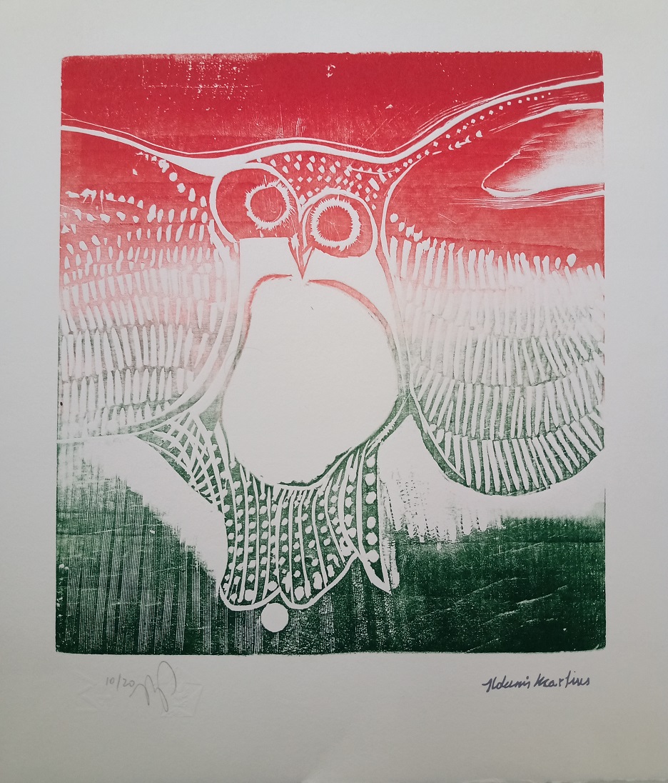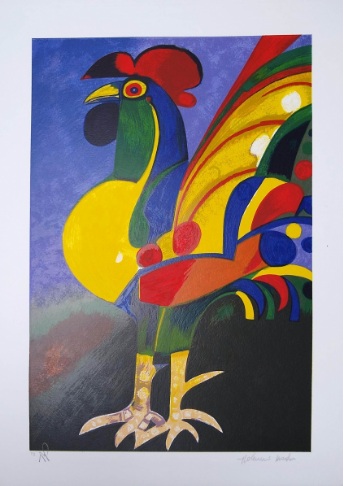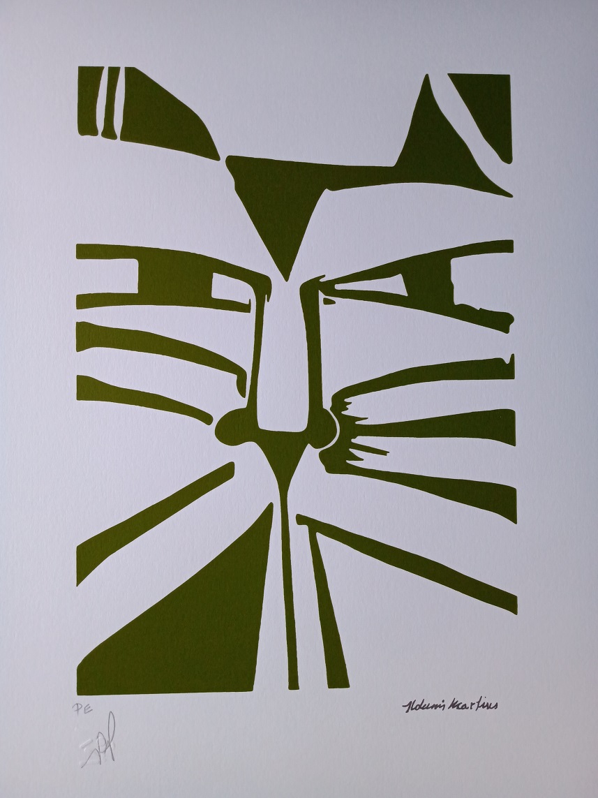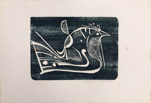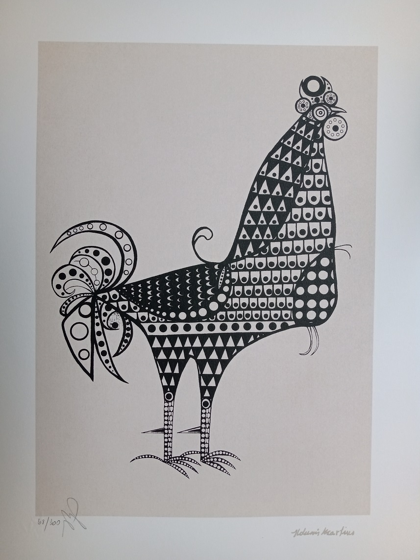 Aldemir Martins (Ingazeiras CE 1922 - São Paulo SP 2006). Pintor, gravador, desenhista, ilustrador. Em 1941, participa da criação do Centro Cultural de Belas Artes, em Fortaleza, com Antonio Bandeira (1922-1967), Raimundo Cela (1890-1954), Inimá de Paula (1918-1999) e Mario Baratta (1915-1983), um espaço para exposições permanentes e cursos de arte. Três anos depois, a instituição passa a chamar-se Sociedade Cearense de Artes Plásticas - SCAP. Aldemir Martins produz desenhos, xilogravuras, aquarelas e pinturas. Atua também como ilustrador na imprensa cearense. Em 1945, viaja para o Rio de Janeiro, e, menos de um ano depois, muda-se para São Paulo, onde realiza sua primeira individual e retoma a carreira de ilustrador. Entre 1949 e 1951, freqüenta os cursos do Museu de Arte de São Paulo Assis Chateaubriand - MASP e torna-se monitor da instituição. Estuda história da arte com Pietro Maria Bardi (1900-1999) e gravura com Poty Lazzarotto (1924-1998). Em 1959, recebe o prêmio de viagem ao exterior do Salão Nacional de Arte Moderna e permanece por dois anos na Itália. Desde o início da carreira sua produção é figurativa, e o artista emprega um repertório formal constantemente retomado: aves, sobretudo os galos; cangaceiros, inspirados nas figuras de cerâmica popular; gatos, realizados com linhas sinuosas; e ainda flores e frutas. Nas pinturas emprega cores intensas e contrastantes.
