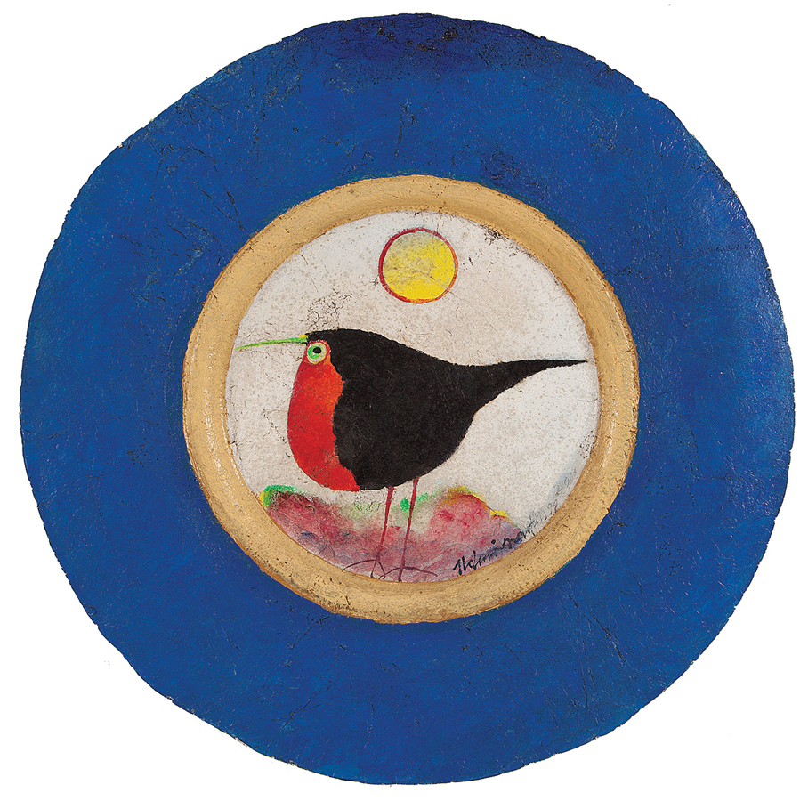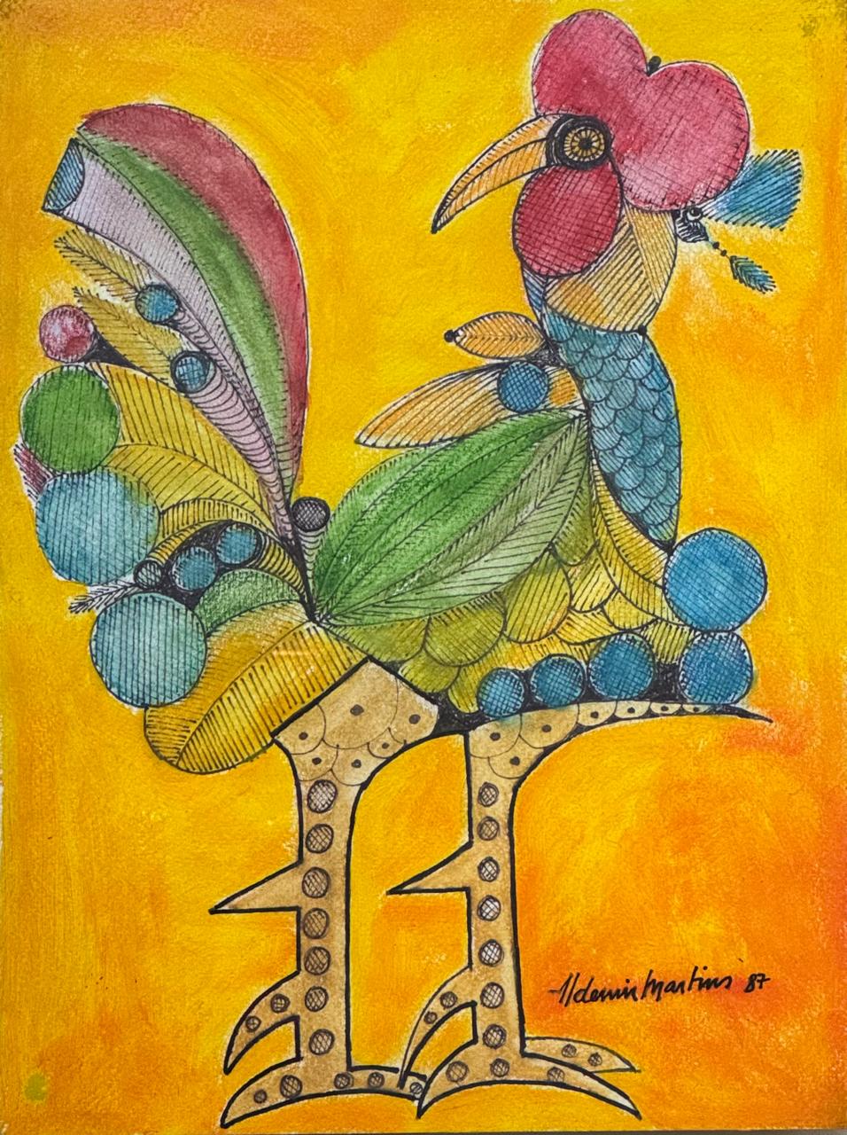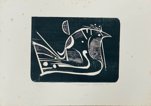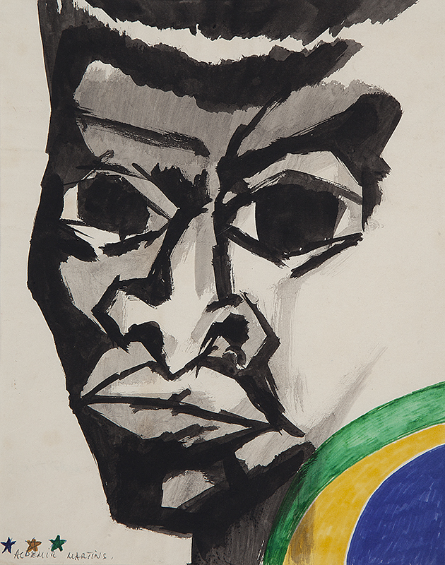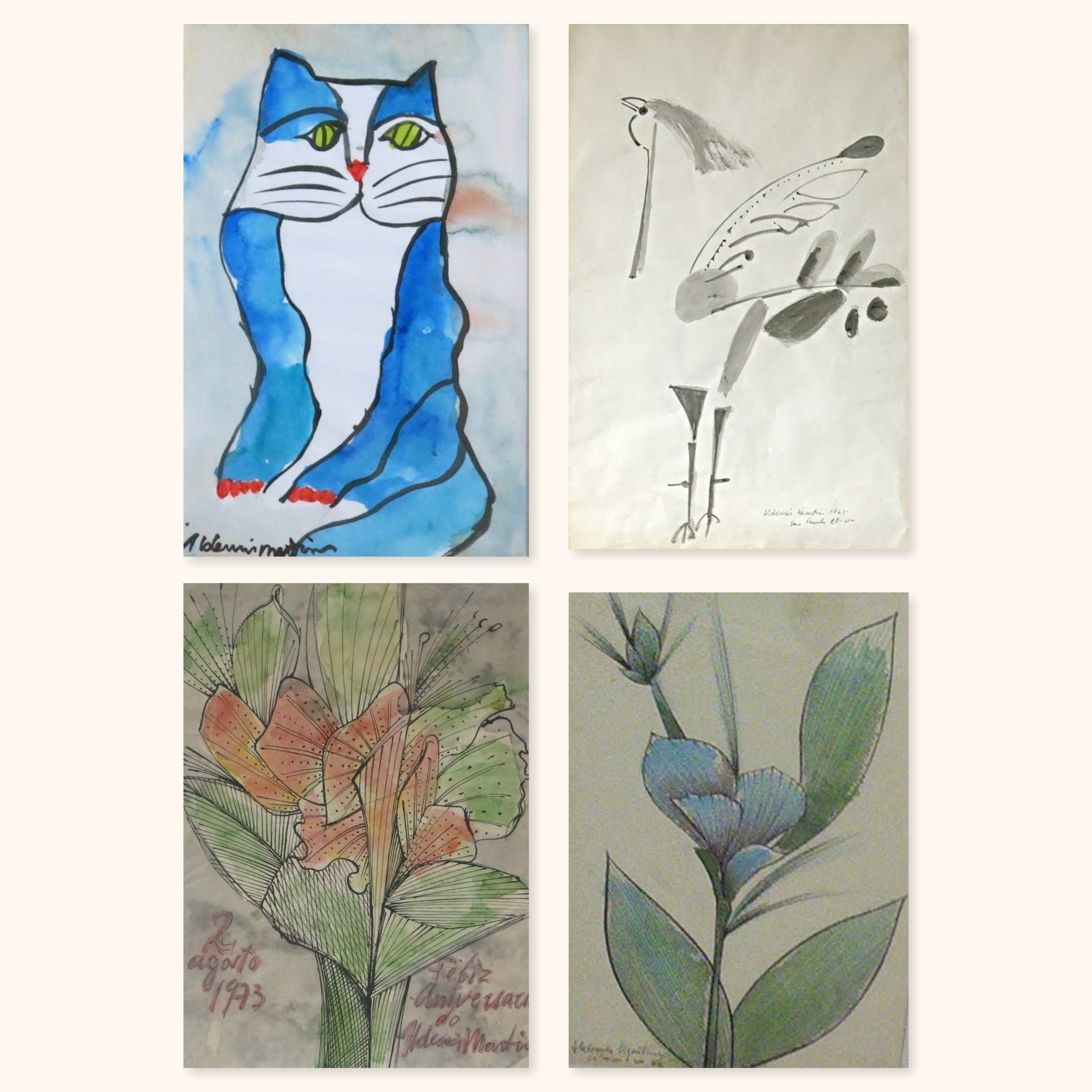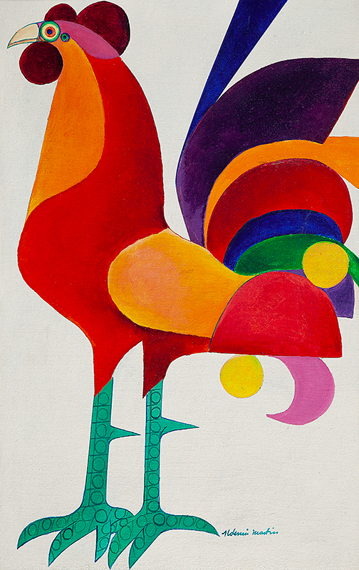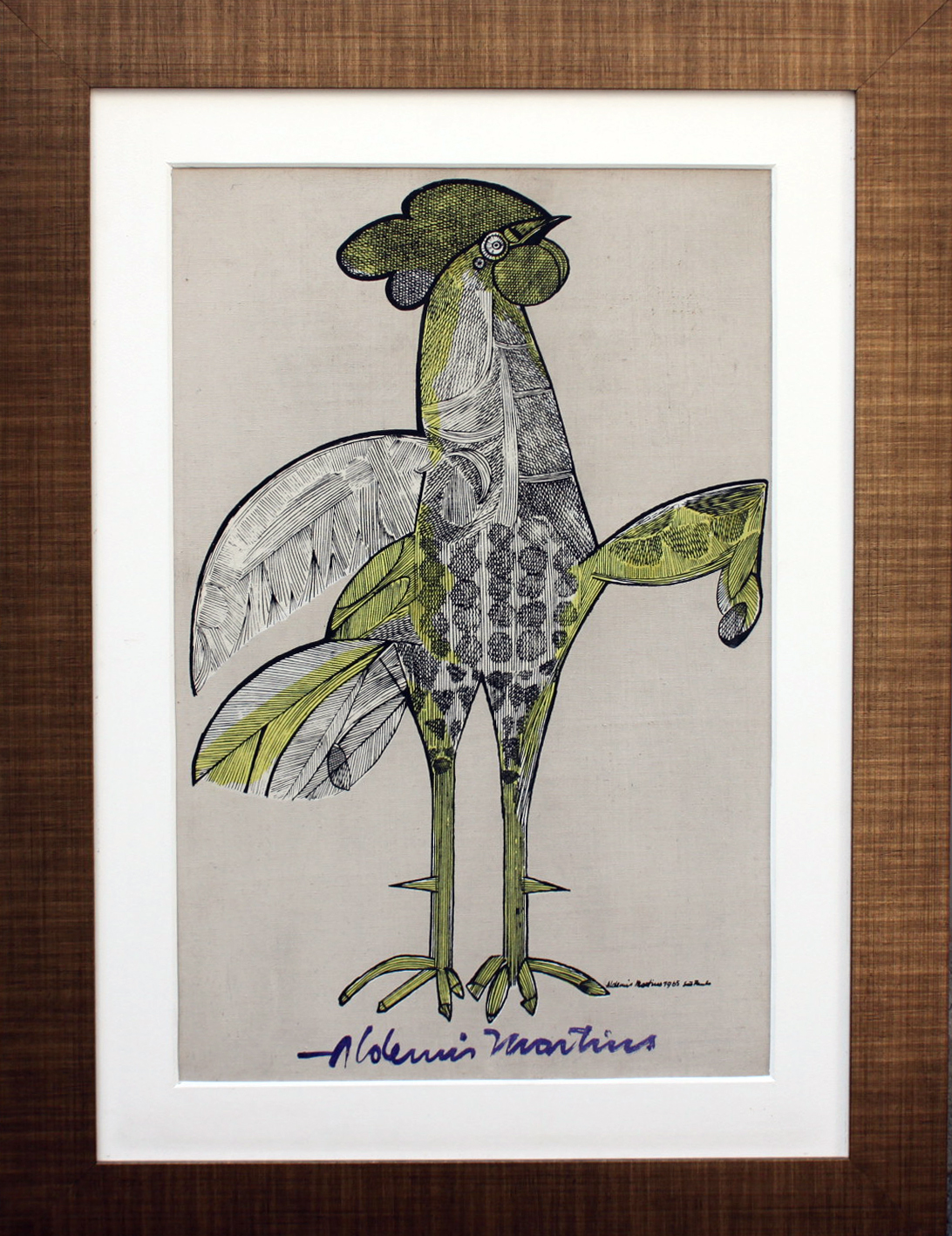 Aldemir Martins (Ingazeiras CE 1922 - São Paulo SP 2006). Pintor, gravador, desenhista, ilustrador. Em 1941, participa da criação do Centro Cultural de Belas Artes, em Fortaleza, com Antonio Bandeira (1922-1967), Raimundo Cela (1890-1954), Inimá de Paula (1918-1999) e Mario Baratta (1915-1983), um espaço para exposições permanentes e cursos de arte. Três anos depois, a instituição passa a chamar-se Sociedade Cearense de Artes Plásticas - SCAP. Aldemir Martins produz desenhos, xilogravuras, aquarelas e pinturas. Atua também como ilustrador na imprensa cearense. Em 1945, viaja para o Rio de Janeiro, e, menos de um ano depois, muda-se para São Paulo, onde realiza sua primeira individual e retoma a carreira de ilustrador. Entre 1949 e 1951, freqüenta os cursos do Museu de Arte de São Paulo Assis Chateaubriand - MASP e torna-se monitor da instituição. Estuda história da arte com Pietro Maria Bardi (1900-1999) e gravura com Poty Lazzarotto (1924-1998). Em 1959, recebe o prêmio de viagem ao exterior do Salão Nacional de Arte Moderna e permanece por dois anos na Itália. Desde o início da carreira sua produção é figurativa, e o artista emprega um repertório formal constantemente retomado: aves, sobretudo os galos; cangaceiros, inspirados nas figuras de cerâmica popular; gatos, realizados com linhas sinuosas; e ainda flores e frutas. Nas pinturas emprega cores intensas e contrastantes.