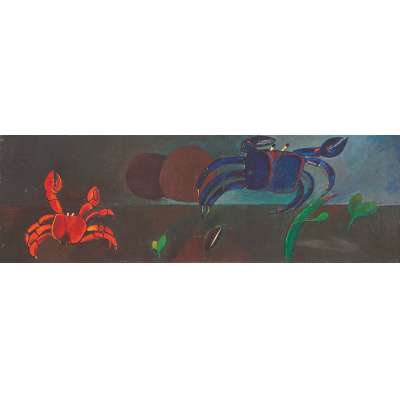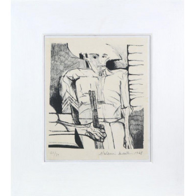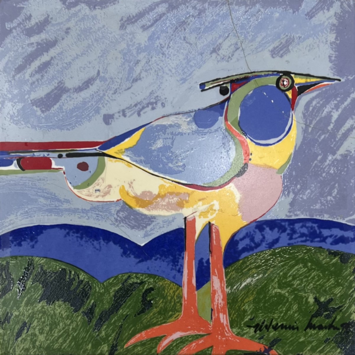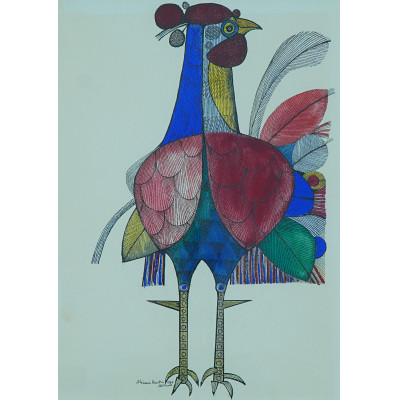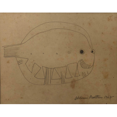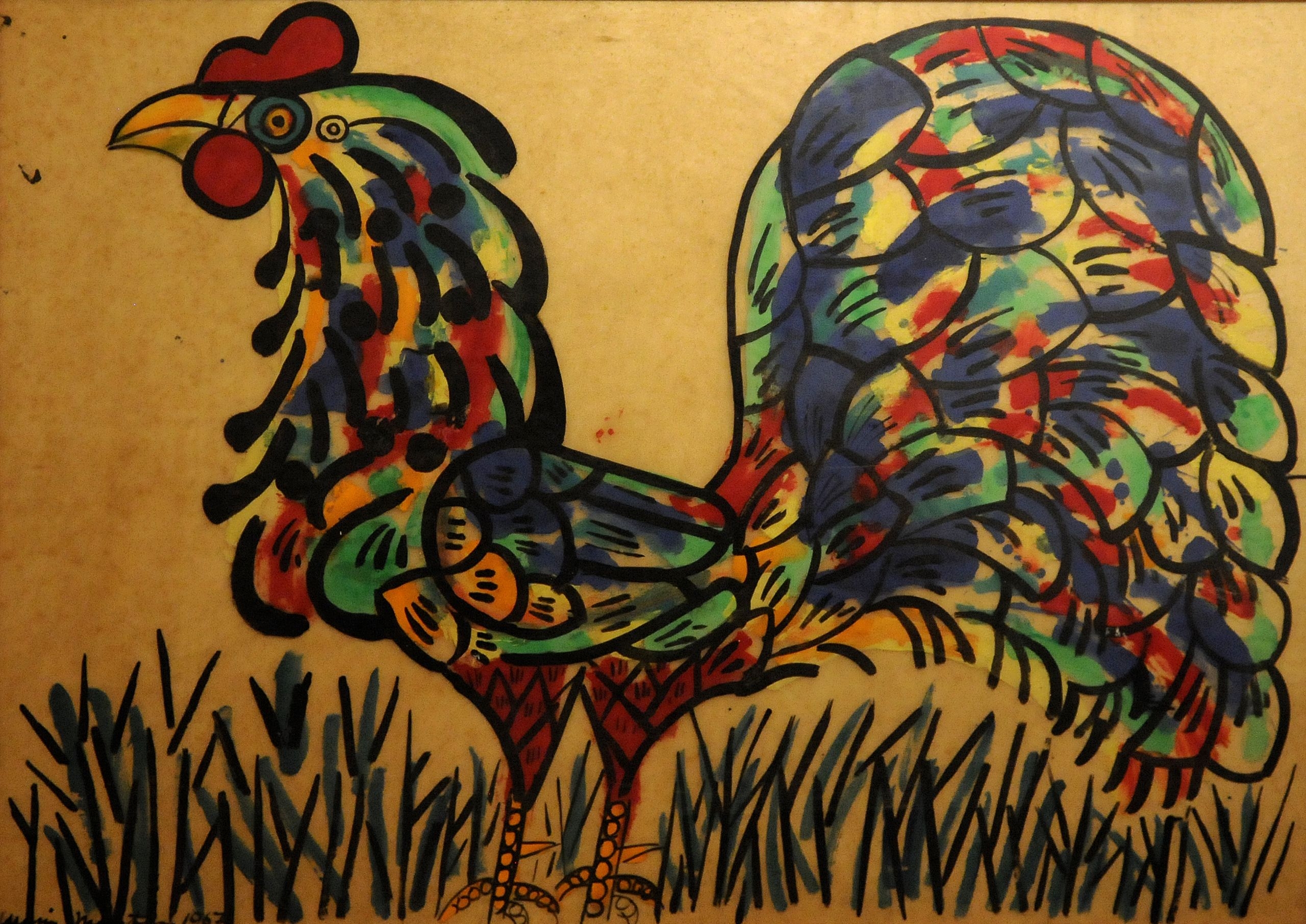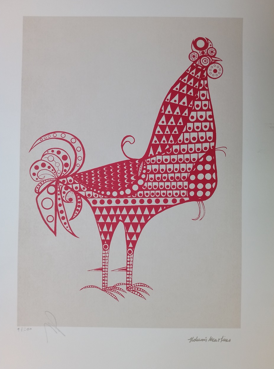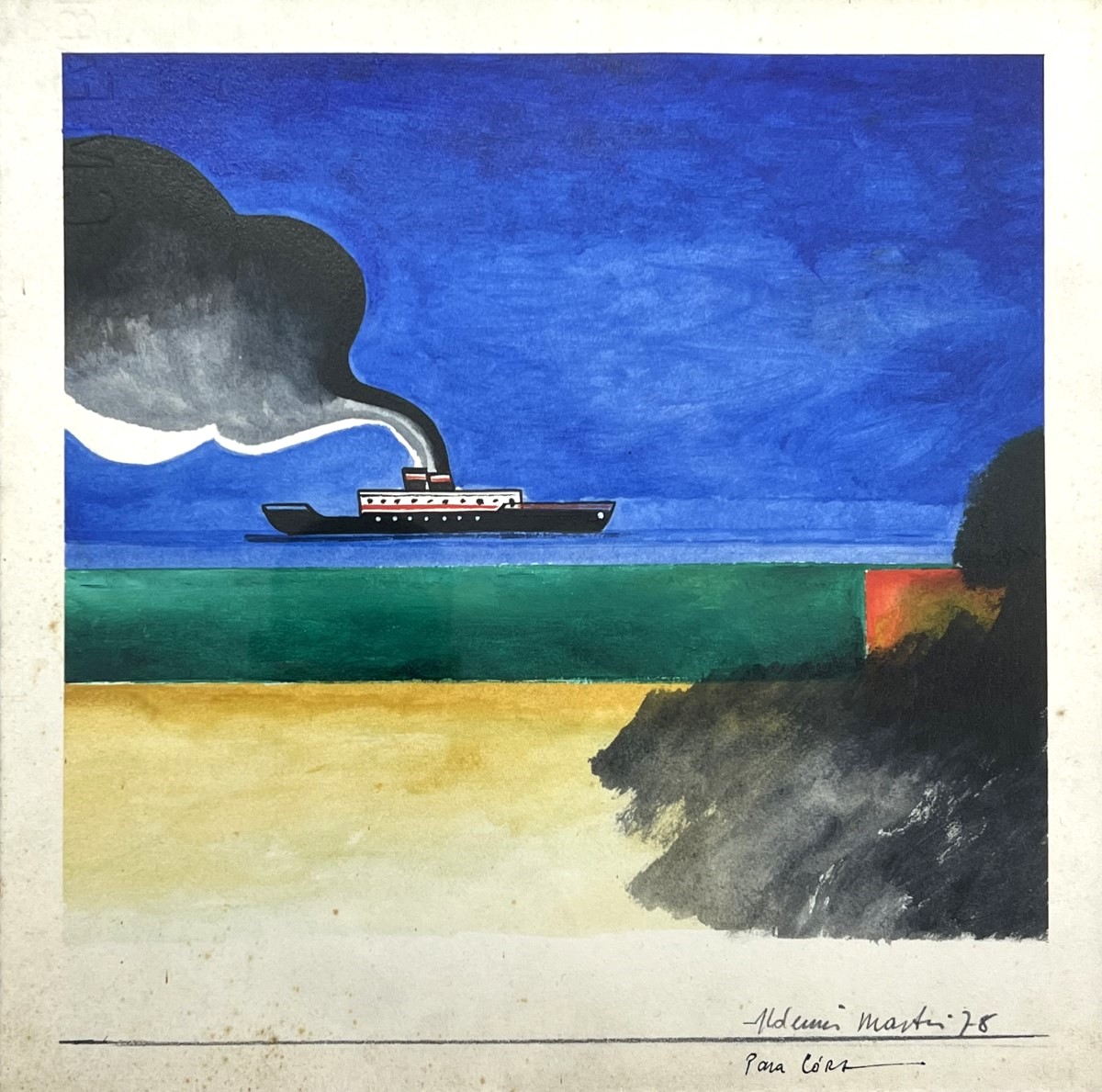 Aldemir Martins (Ingazeiras CE 1922 - São Paulo SP 2006). Pintor, gravador, desenhista, ilustrador. Em 1941, participa da criação do Centro Cultural de Belas Artes, em Fortaleza, com Antonio Bandeira (1922-1967), Raimundo Cela (1890-1954), Inimá de Paula (1918-1999) e Mario Baratta (1915-1983), um espaço para exposições permanentes e cursos de arte. Três anos depois, a instituição passa a chamar-se Sociedade Cearense de Artes Plásticas - SCAP. Aldemir Martins produz desenhos, xilogravuras, aquarelas e pinturas. Atua também como ilustrador na imprensa cearense. Em 1945, viaja para o Rio de Janeiro, e, menos de um ano depois, muda-se para São Paulo, onde realiza sua primeira individual e retoma a carreira de ilustrador. Entre 1949 e 1951, freqüenta os cursos do Museu de Arte de São Paulo Assis Chateaubriand - MASP e torna-se monitor da instituição. Estuda história da arte com Pietro Maria Bardi (1900-1999) e gravura com Poty Lazzarotto (1924-1998). Em 1959, recebe o prêmio de viagem ao exterior do Salão Nacional de Arte Moderna e permanece por dois anos na Itália. Desde o início da carreira sua produção é figurativa, e o artista emprega um repertório formal constantemente retomado: aves, sobretudo os galos; cangaceiros, inspirados nas figuras de cerâmica popular; gatos, realizados com linhas sinuosas; e ainda flores e frutas. Nas pinturas emprega cores intensas e contrastantes.