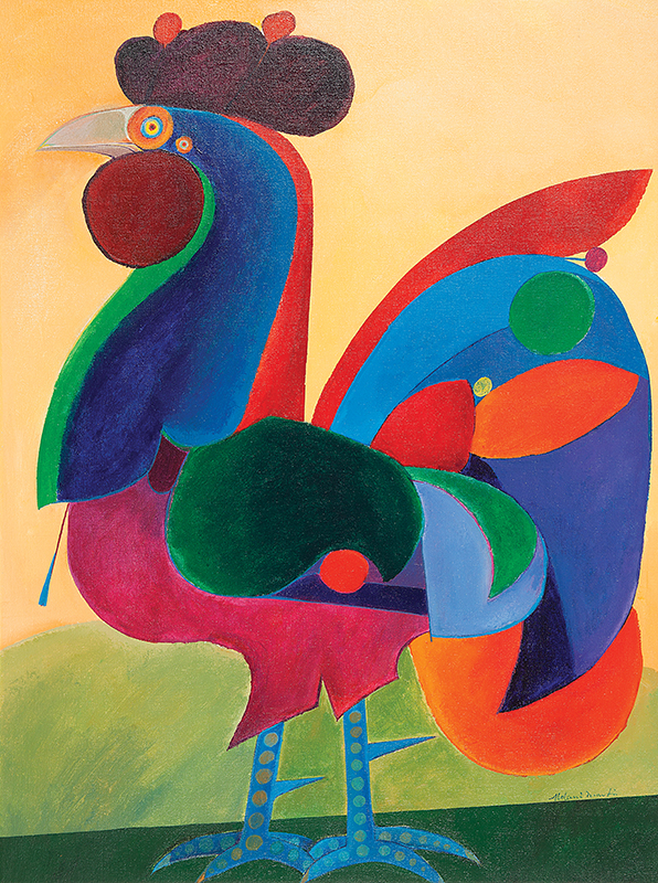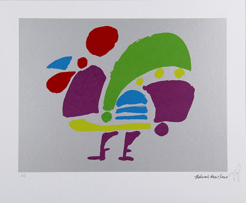 Aldemir Martins (Ingazeiras CE 1922 - São Paulo SP 2006). Pintor, gravador, desenhista, ilustrador. Em 1941, participa da criação do Centro Cultural de Belas Artes, em Fortaleza, com Antonio Bandeira (1922-1967), Raimundo Cela (1890-1954), Inimá de Paula (1918-1999) e Mario Baratta (1915-1983), um espaço para exposições permanentes e cursos de arte. Três anos depois, a instituição passa a chamar-se Sociedade Cearense de Artes Plásticas - SCAP. Aldemir Martins produz desenhos, xilogravuras, aquarelas e pinturas. Atua também como ilustrador na imprensa cearense. Em 1945, viaja para o Rio de Janeiro, e, menos de um ano depois, muda-se para São Paulo, onde realiza sua primeira individual e retoma a carreira de ilustrador. Entre 1949 e 1951, freqüenta os cursos do Museu de Arte de São Paulo Assis Chateaubriand - MASP e torna-se monitor da instituição. Estuda história da arte com Pietro Maria Bardi (1900-1999) e gravura com Poty Lazzarotto (1924-1998). Em 1959, recebe o prêmio de viagem ao exterior do Salão Nacional de Arte Moderna e permanece por dois anos na Itália. Desde o início da carreira sua produção é figurativa, e o artista emprega um repertório formal constantemente retomado: aves, sobretudo os galos; cangaceiros, inspirados nas figuras de cerâmica popular; gatos, realizados com linhas sinuosas; e ainda flores e frutas. Nas pinturas emprega cores intensas e contrastantes.