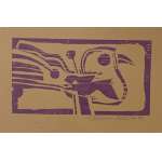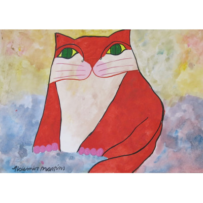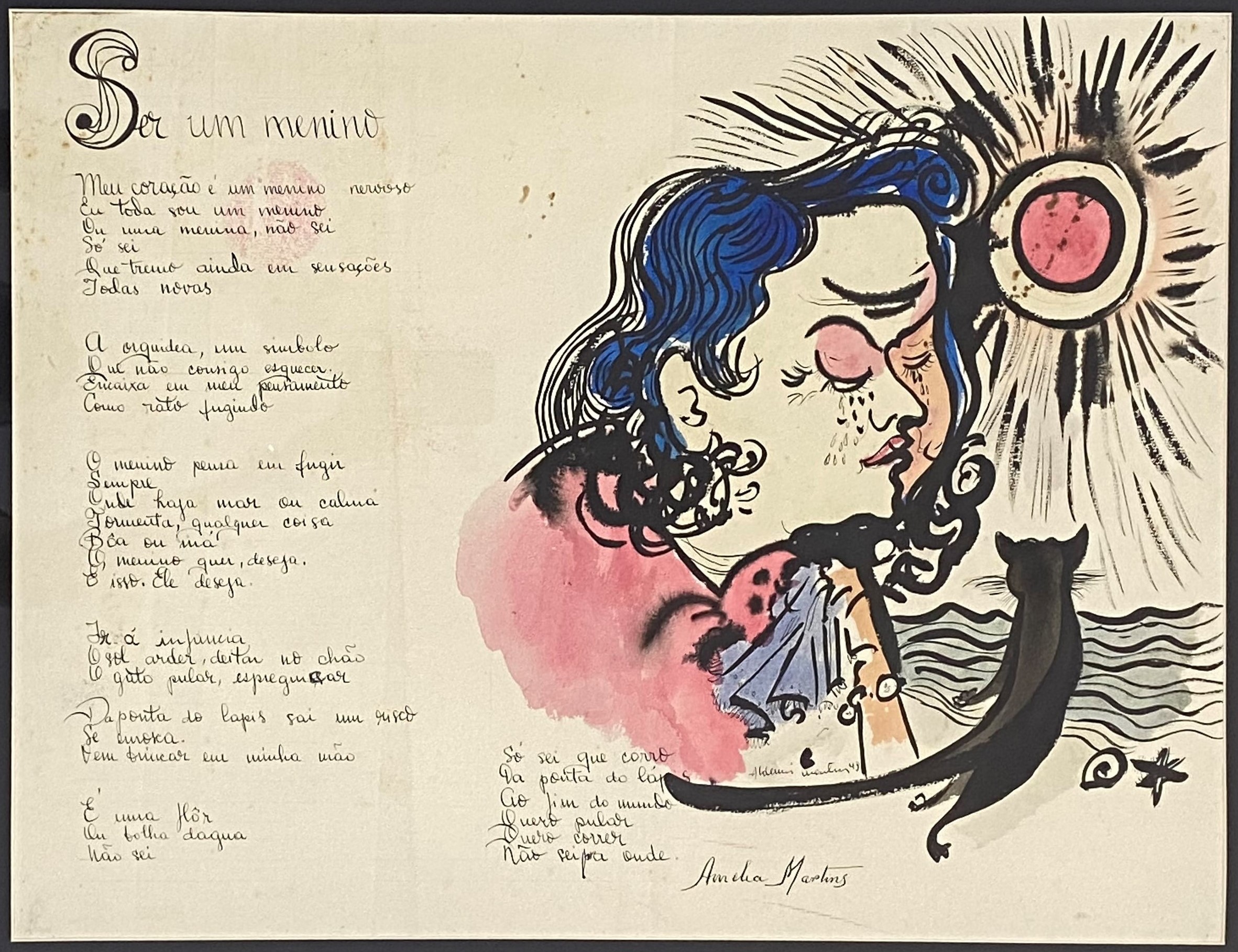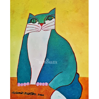 Aldemir Martins (Ingazeiras CE 1922 - São Paulo SP 2006). Pintor, gravador, desenhista, ilustrador. Em 1941, participa da criação do Centro Cultural de Belas Artes, em Fortaleza, com Antonio Bandeira (1922-1967), Raimundo Cela (1890-1954), Inimá de Paula (1918-1999) e Mario Baratta (1915-1983), um espaço para exposições permanentes e cursos de arte. Três anos depois, a instituição passa a chamar-se Sociedade Cearense de Artes Plásticas - SCAP. Aldemir Martins produz desenhos, xilogravuras, aquarelas e pinturas. Atua também como ilustrador na imprensa cearense. Em 1945, viaja para o Rio de Janeiro, e, menos de um ano depois, muda-se para São Paulo, onde realiza sua primeira individual e retoma a carreira de ilustrador. Entre 1949 e 1951, freqüenta os cursos do Museu de Arte de São Paulo Assis Chateaubriand - MASP e torna-se monitor da instituição. Estuda história da arte com Pietro Maria Bardi (1900-1999) e gravura com Poty Lazzarotto (1924-1998). Em 1959, recebe o prêmio de viagem ao exterior do Salão Nacional de Arte Moderna e permanece por dois anos na Itália. Desde o início da carreira sua produção é figurativa, e o artista emprega um repertório formal constantemente retomado: aves, sobretudo os galos; cangaceiros, inspirados nas figuras de cerâmica popular; gatos, realizados com linhas sinuosas; e ainda flores e frutas. Nas pinturas emprega cores intensas e contrastantes.