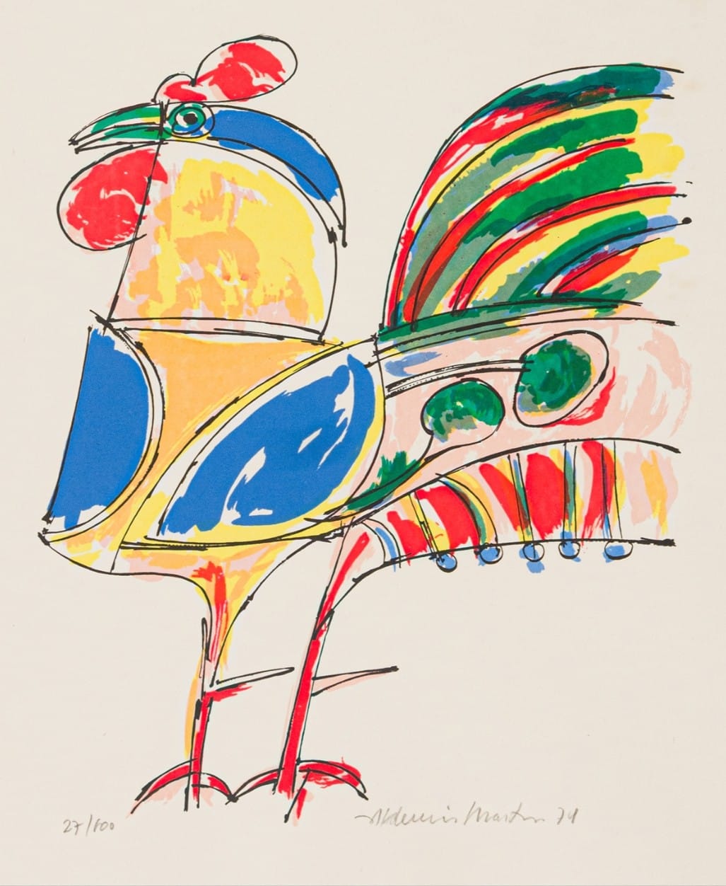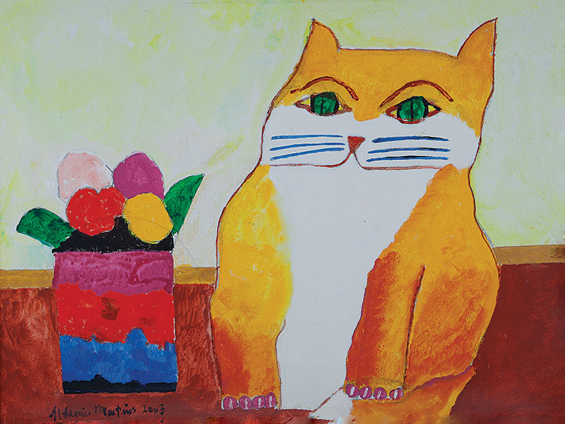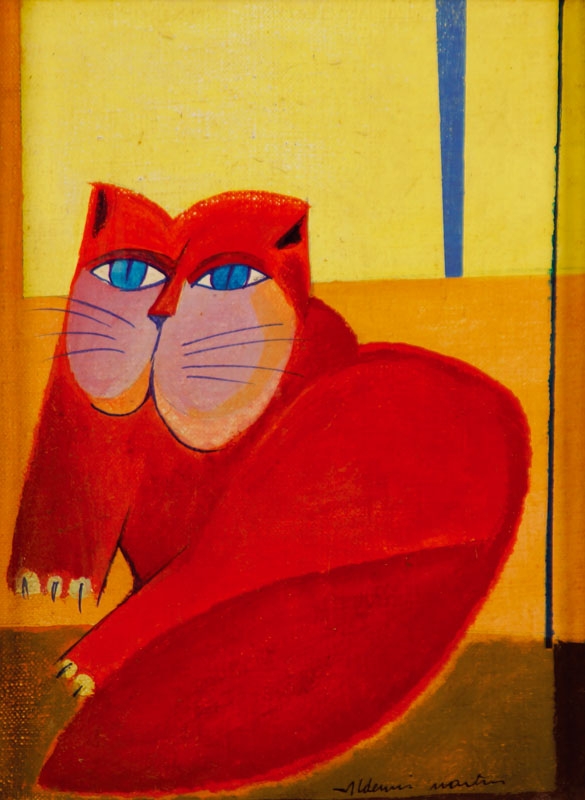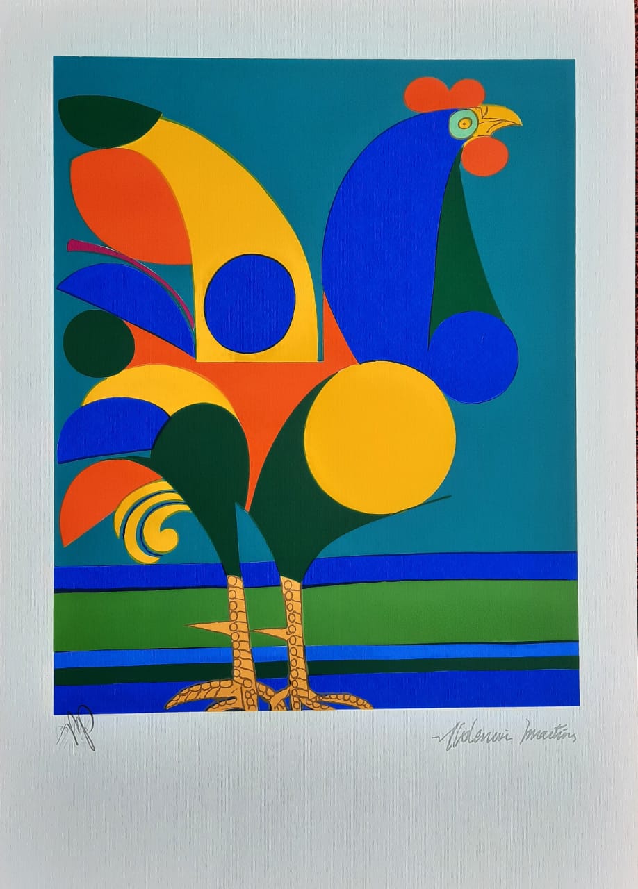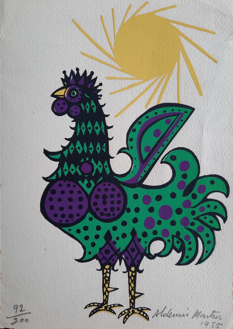Aldemir Martins (Ingazeiras CE 1922 - São Paulo SP 2006). Pintor, gravador, desenhista, ilustrador. Em 1941, participa da criação do Centro Cultural de Belas Artes, em Fortaleza, com Antonio Bandeira (1922-1967), Raimundo Cela (1890-1954), Inimá de Paula (1918-1999) e Mario Baratta (1915-1983), um espaço para exposições permanentes e cursos de arte. Três anos depois, a instituição passa a chamar-se Sociedade Cearense de Artes Plásticas - SCAP. Aldemir Martins produz desenhos, xilogravuras, aquarelas e pinturas. Atua também como ilustrador na imprensa cearense. Em 1945, viaja para o Rio de Janeiro, e, menos de um ano depois, muda-se para São Paulo, onde realiza sua primeira individual e retoma a carreira de ilustrador. Entre 1949 e 1951, freqüenta os cursos do Museu de Arte de São Paulo Assis Chateaubriand - MASP e torna-se monitor da instituição. Estuda história da arte com Pietro Maria Bardi (1900-1999) e gravura com Poty Lazzarotto (1924-1998). Em 1959, recebe o prêmio de viagem ao exterior do Salão Nacional de Arte Moderna e permanece por dois anos na Itália. Desde o início da carreira sua produção é figurativa, e o artista emprega um repertório formal constantemente retomado: aves, sobretudo os galos; cangaceiros, inspirados nas figuras de cerâmica popular; gatos, realizados com linhas sinuosas; e ainda flores e frutas. Nas pinturas emprega cores intensas e contrastantes.