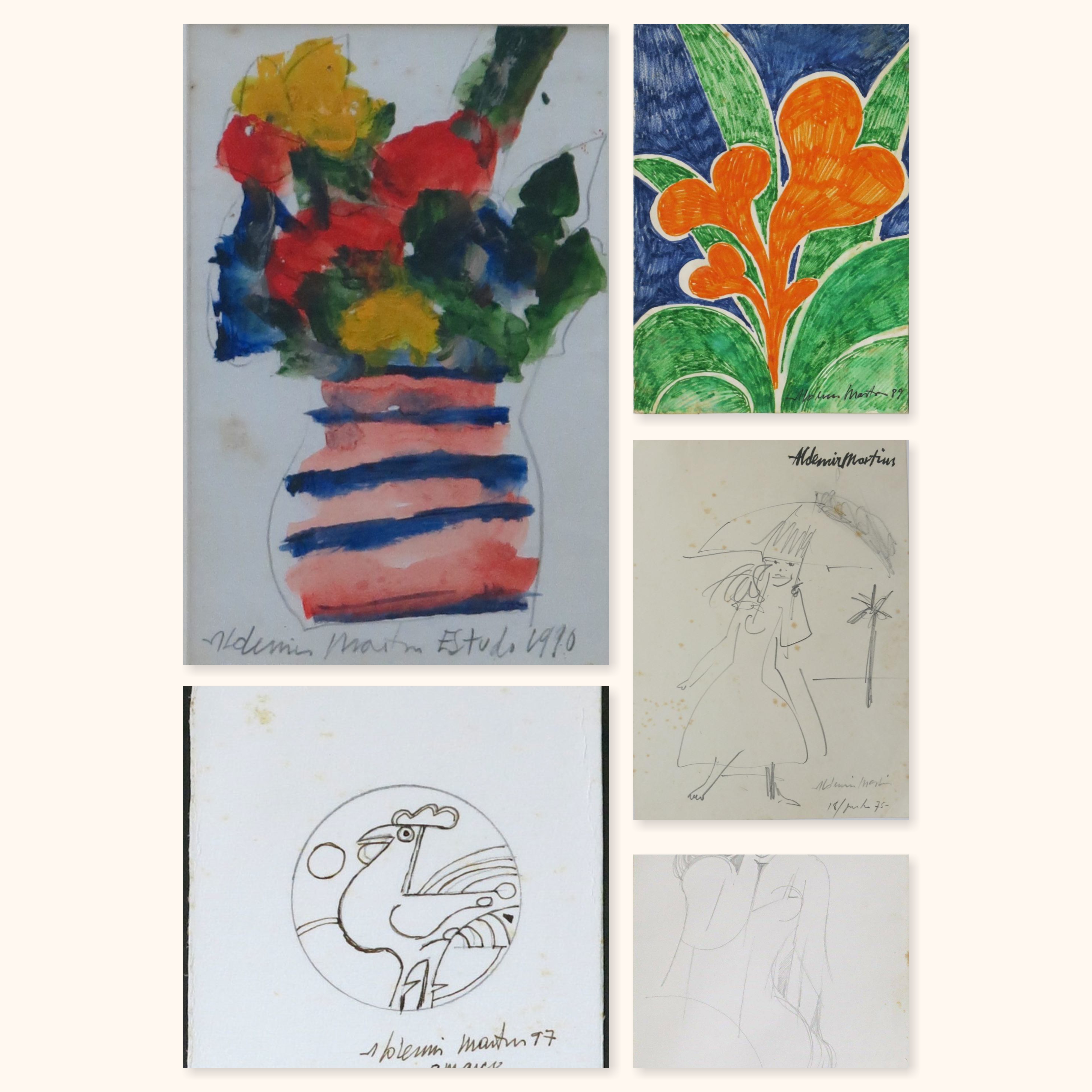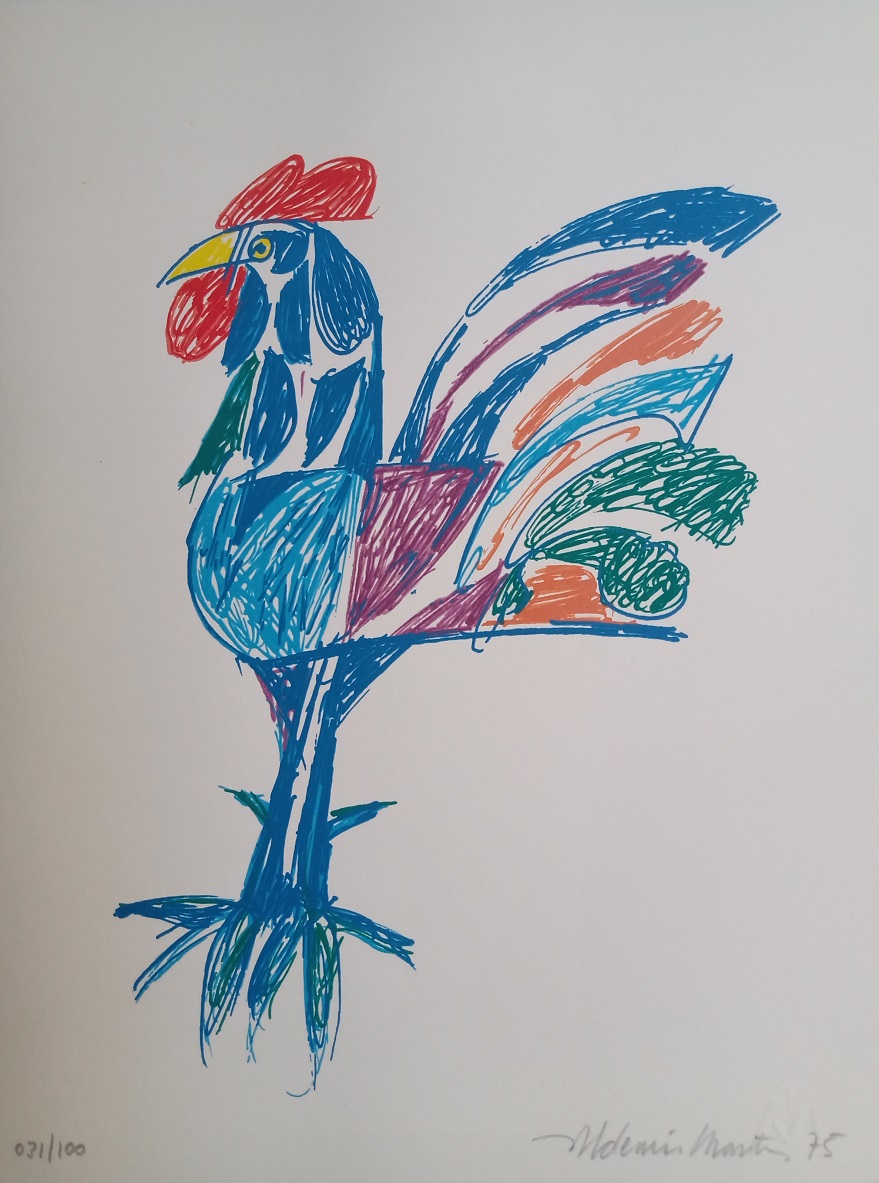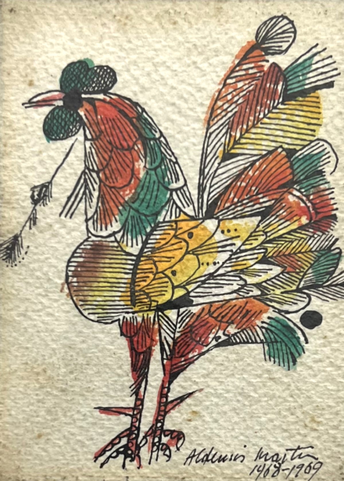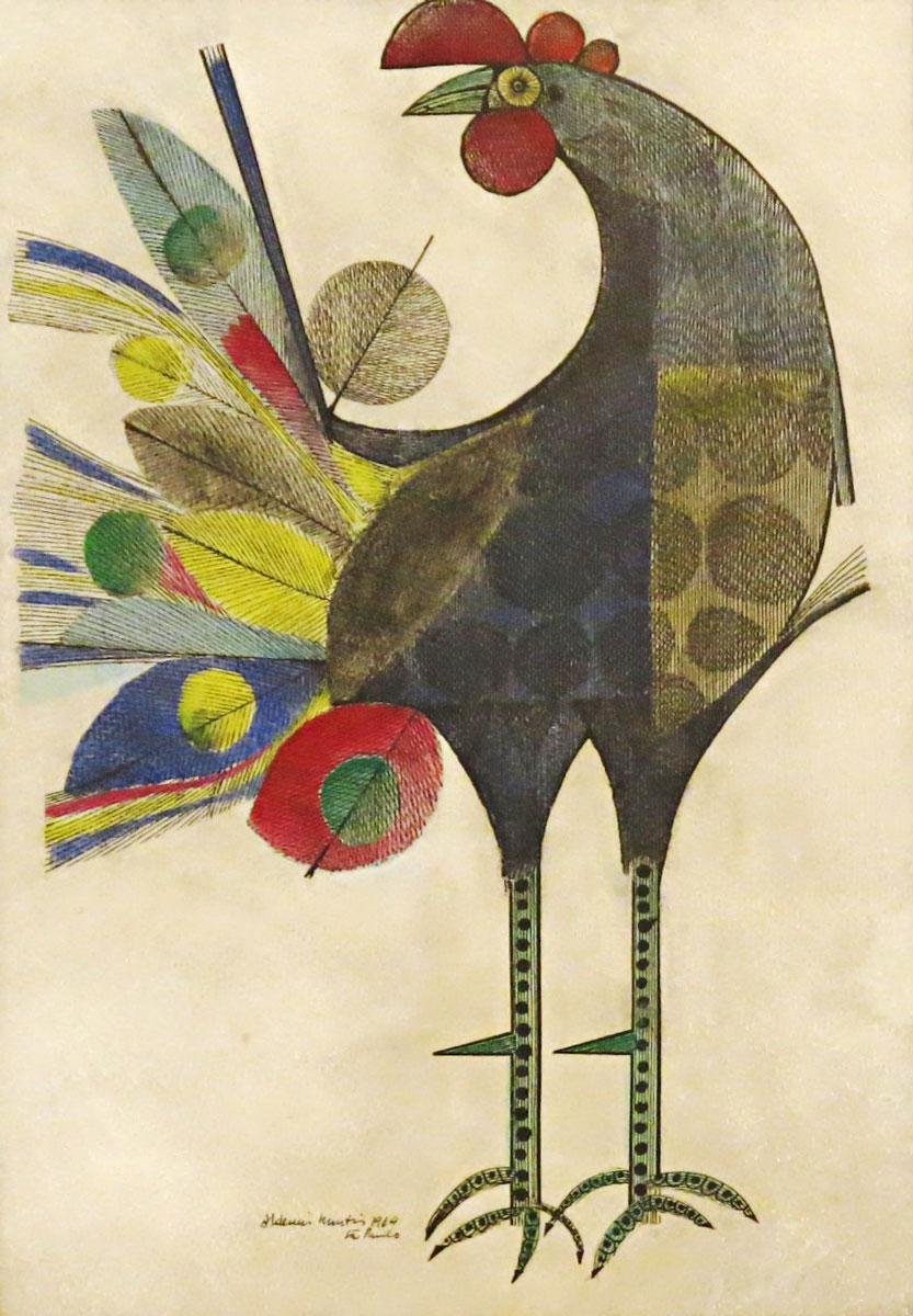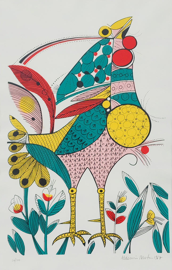 Aldemir Martins (Ingazeiras CE 1922 - São Paulo SP 2006). Pintor, gravador, desenhista, ilustrador. Em 1941, participa da criação do Centro Cultural de Belas Artes, em Fortaleza, com Antonio Bandeira (1922-1967), Raimundo Cela (1890-1954), Inimá de Paula (1918-1999) e Mario Baratta (1915-1983), um espaço para exposições permanentes e cursos de arte. Três anos depois, a instituição passa a chamar-se Sociedade Cearense de Artes Plásticas - SCAP. Aldemir Martins produz desenhos, xilogravuras, aquarelas e pinturas. Atua também como ilustrador na imprensa cearense. Em 1945, viaja para o Rio de Janeiro, e, menos de um ano depois, muda-se para São Paulo, onde realiza sua primeira individual e retoma a carreira de ilustrador. Entre 1949 e 1951, freqüenta os cursos do Museu de Arte de São Paulo Assis Chateaubriand - MASP e torna-se monitor da instituição. Estuda história da arte com Pietro Maria Bardi (1900-1999) e gravura com Poty Lazzarotto (1924-1998). Em 1959, recebe o prêmio de viagem ao exterior do Salão Nacional de Arte Moderna e permanece por dois anos na Itália. Desde o início da carreira sua produção é figurativa, e o artista emprega um repertório formal constantemente retomado: aves, sobretudo os galos; cangaceiros, inspirados nas figuras de cerâmica popular; gatos, realizados com linhas sinuosas; e ainda flores e frutas. Nas pinturas emprega cores intensas e contrastantes.