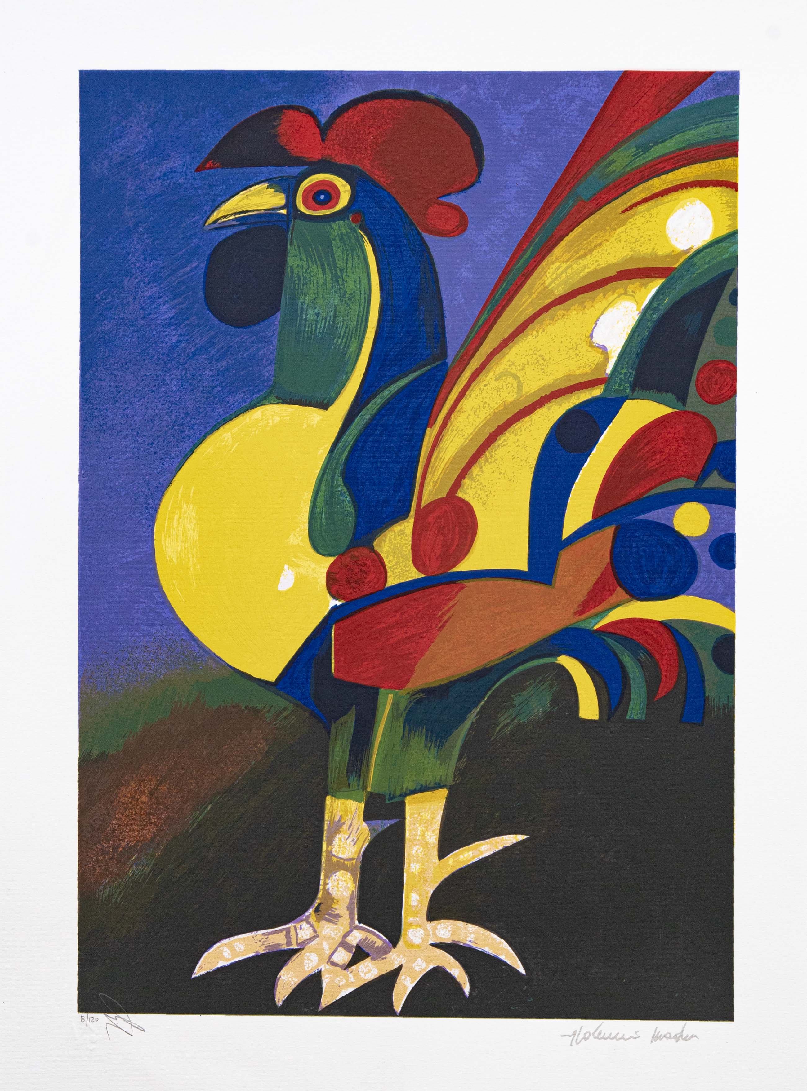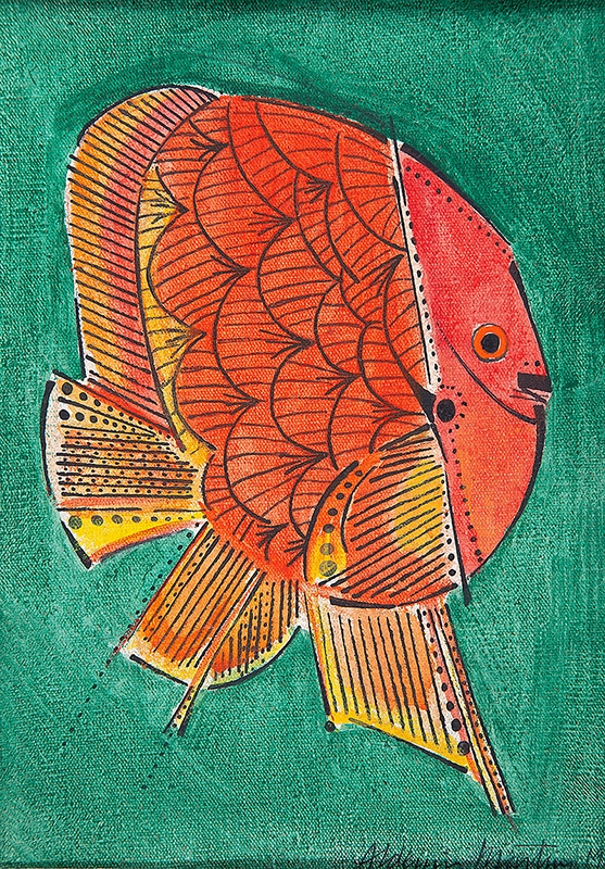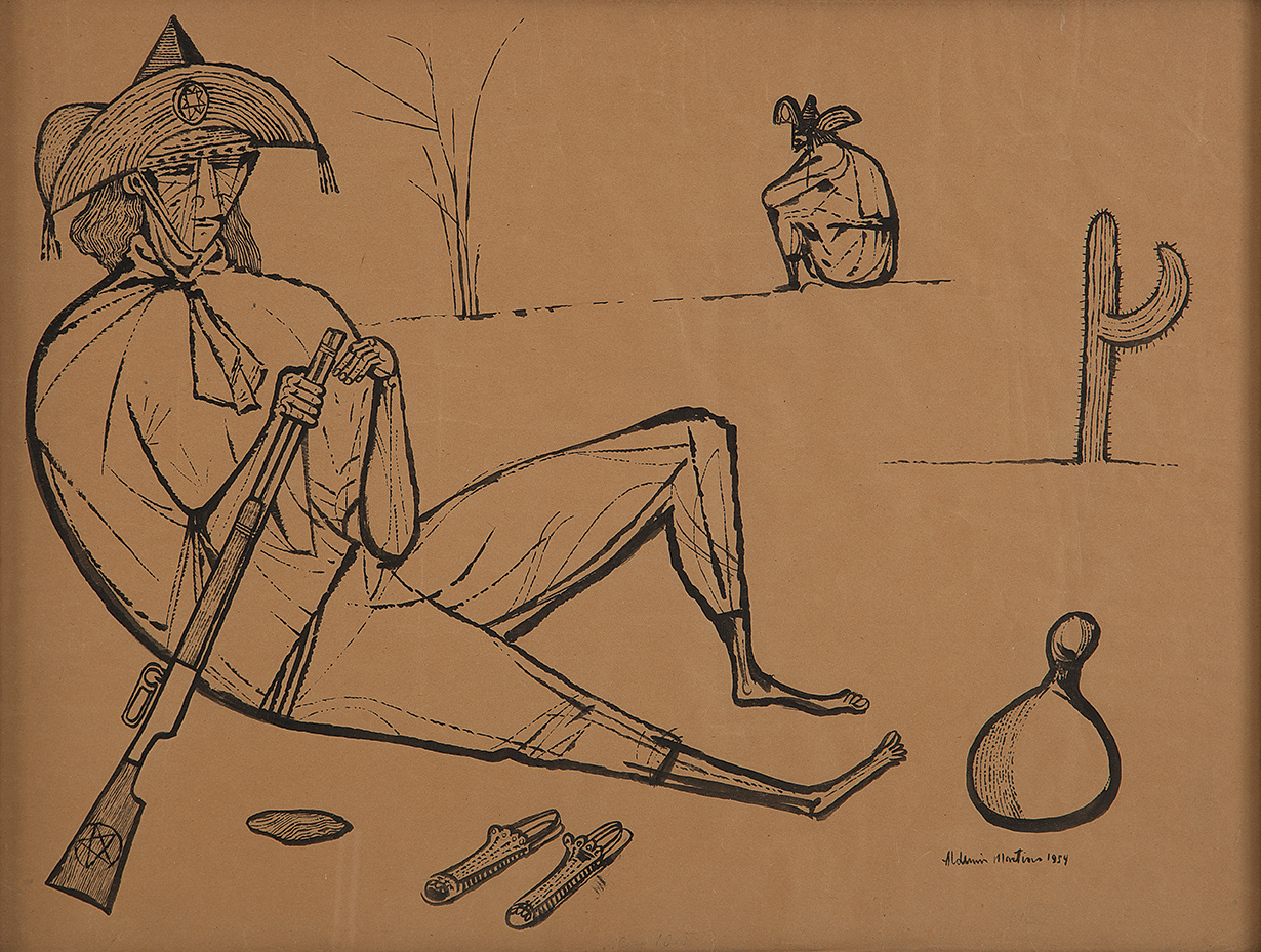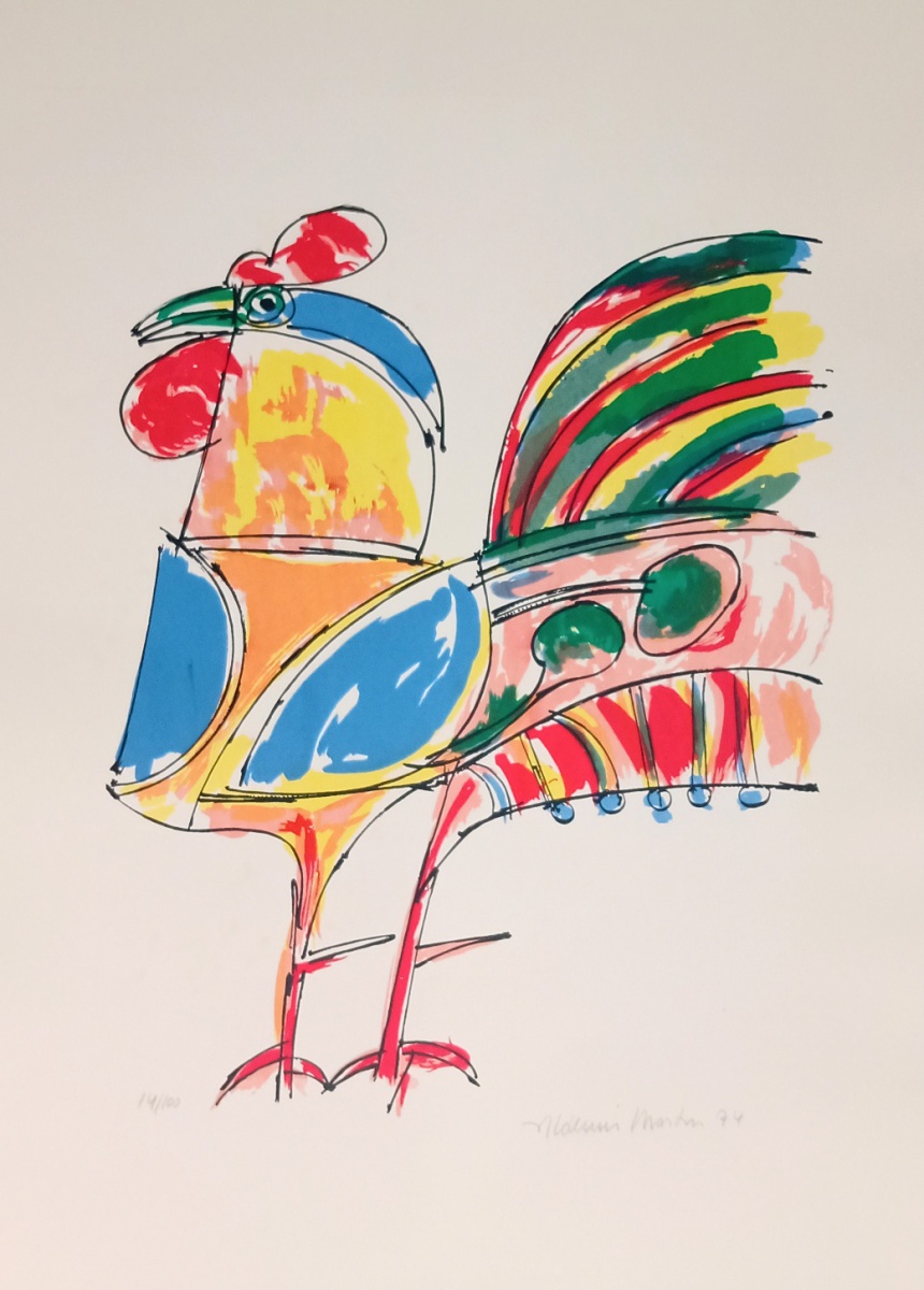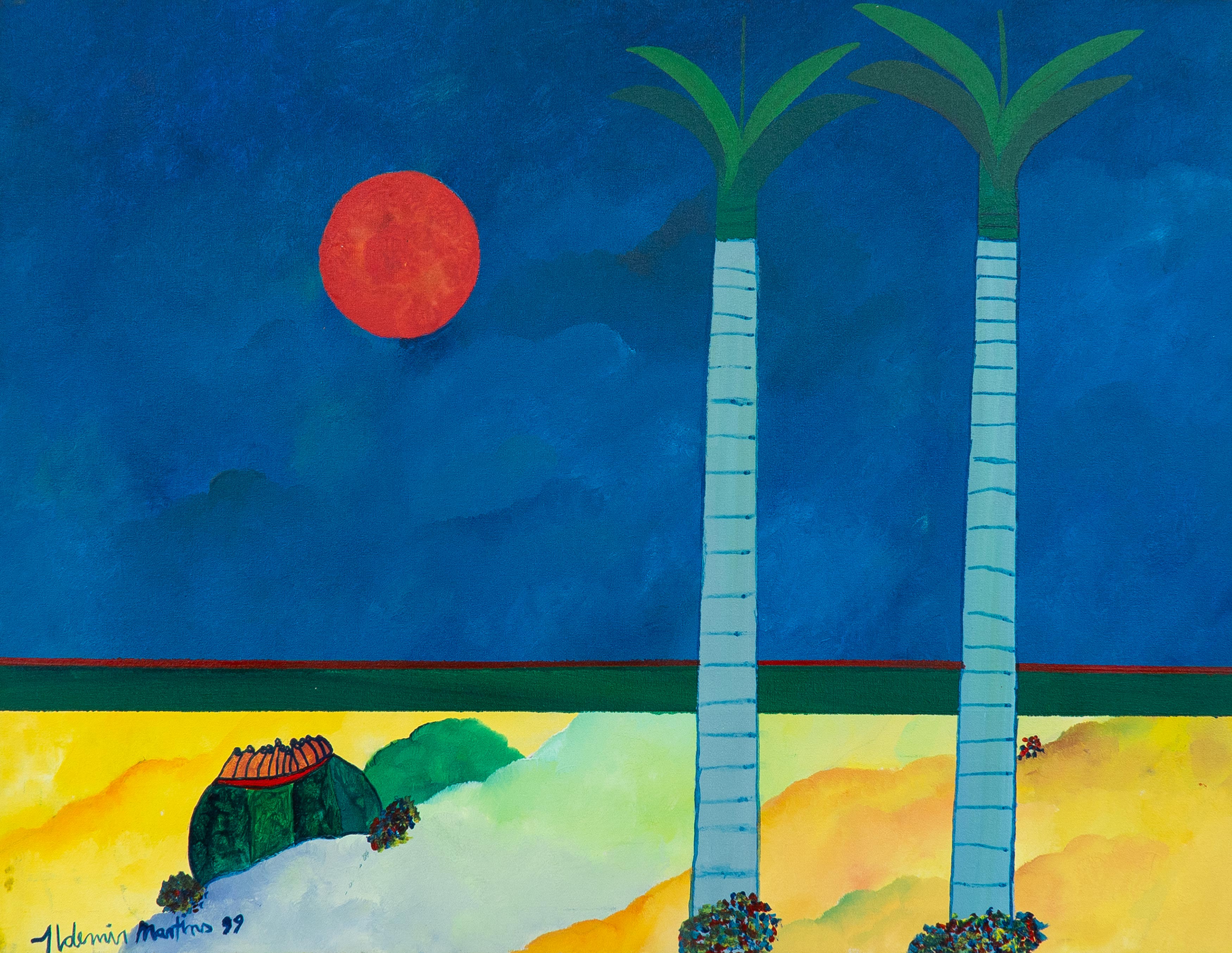 Aldemir Martins (Ingazeiras CE 1922 - São Paulo SP 2006). Pintor, gravador, desenhista, ilustrador. Em 1941, participa da criação do Centro Cultural de Belas Artes, em Fortaleza, com Antonio Bandeira (1922-1967), Raimundo Cela (1890-1954), Inimá de Paula (1918-1999) e Mario Baratta (1915-1983), um espaço para exposições permanentes e cursos de arte. Três anos depois, a instituição passa a chamar-se Sociedade Cearense de Artes Plásticas - SCAP. Aldemir Martins produz desenhos, xilogravuras, aquarelas e pinturas. Atua também como ilustrador na imprensa cearense. Em 1945, viaja para o Rio de Janeiro, e, menos de um ano depois, muda-se para São Paulo, onde realiza sua primeira individual e retoma a carreira de ilustrador. Entre 1949 e 1951, freqüenta os cursos do Museu de Arte de São Paulo Assis Chateaubriand - MASP e torna-se monitor da instituição. Estuda história da arte com Pietro Maria Bardi (1900-1999) e gravura com Poty Lazzarotto (1924-1998). Em 1959, recebe o prêmio de viagem ao exterior do Salão Nacional de Arte Moderna e permanece por dois anos na Itália. Desde o início da carreira sua produção é figurativa, e o artista emprega um repertório formal constantemente retomado: aves, sobretudo os galos; cangaceiros, inspirados nas figuras de cerâmica popular; gatos, realizados com linhas sinuosas; e ainda flores e frutas. Nas pinturas emprega cores intensas e contrastantes.
