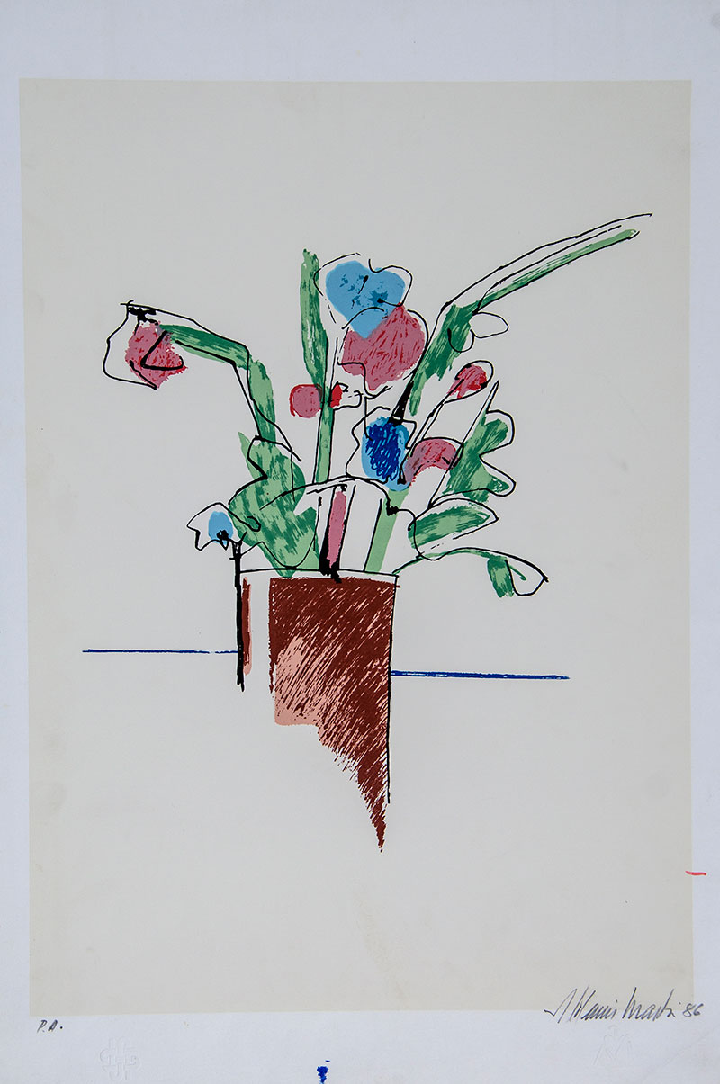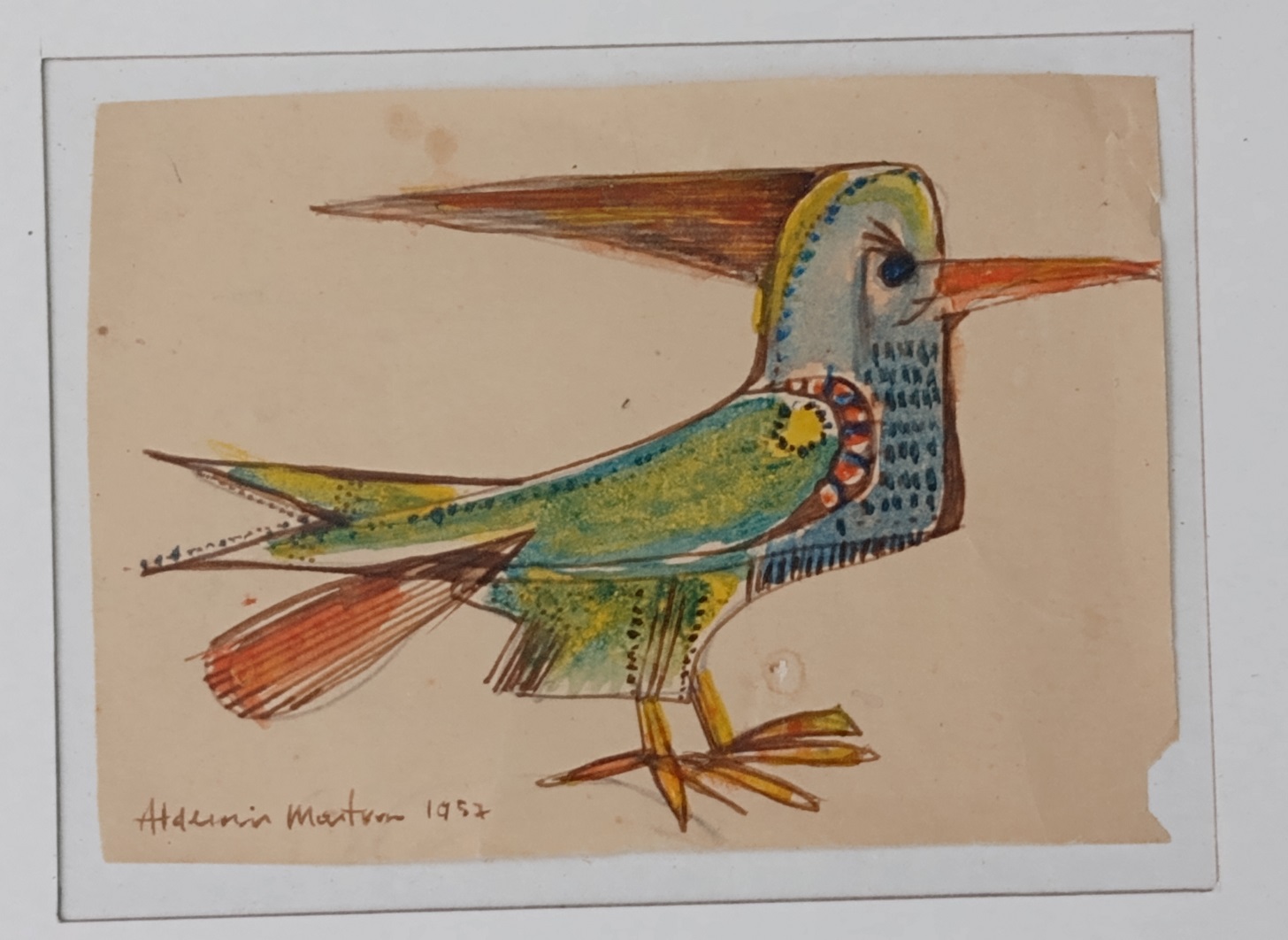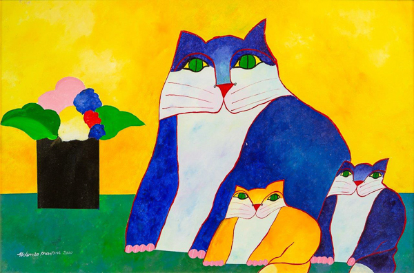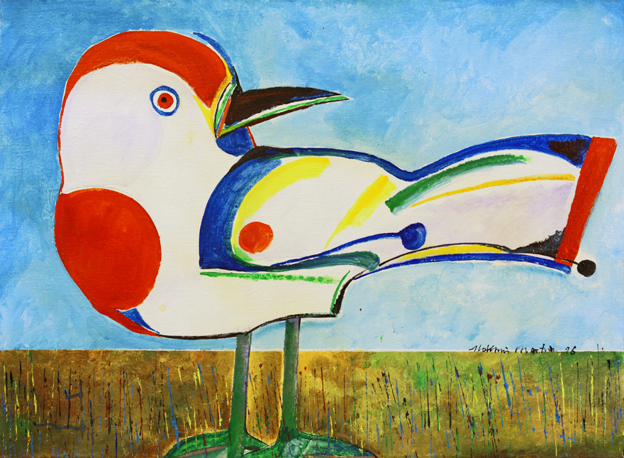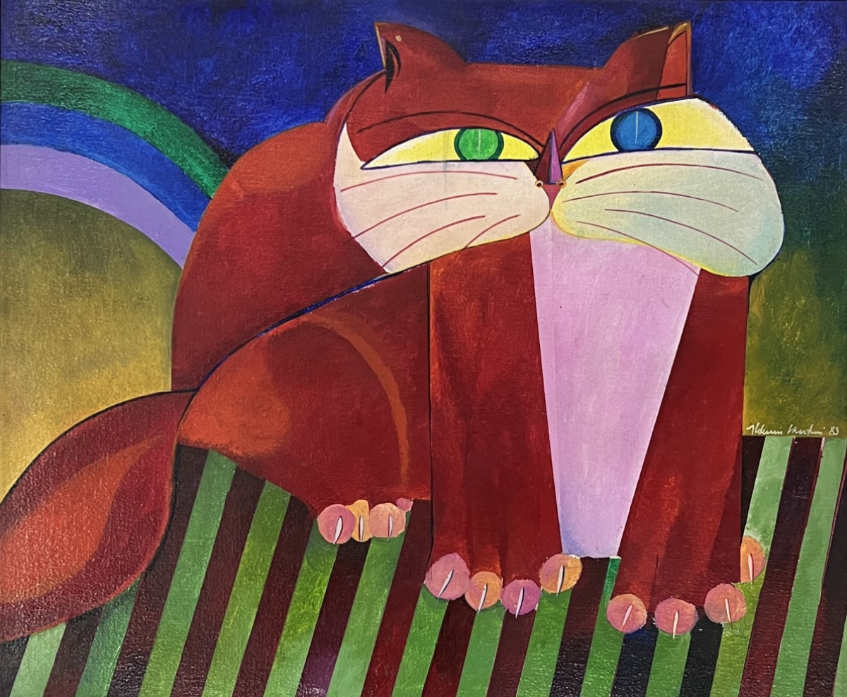 Aldemir Martins (Ingazeiras CE 1922 - São Paulo SP 2006). Pintor, gravador, desenhista, ilustrador. Em 1941, participa da criação do Centro Cultural de Belas Artes, em Fortaleza, com Antonio Bandeira (1922-1967), Raimundo Cela (1890-1954), Inimá de Paula (1918-1999) e Mario Baratta (1915-1983), um espaço para exposições permanentes e cursos de arte. Três anos depois, a instituição passa a chamar-se Sociedade Cearense de Artes Plásticas - SCAP. Aldemir Martins produz desenhos, xilogravuras, aquarelas e pinturas. Atua também como ilustrador na imprensa cearense. Em 1945, viaja para o Rio de Janeiro, e, menos de um ano depois, muda-se para São Paulo, onde realiza sua primeira individual e retoma a carreira de ilustrador. Entre 1949 e 1951, freqüenta os cursos do Museu de Arte de São Paulo Assis Chateaubriand - MASP e torna-se monitor da instituição. Estuda história da arte com Pietro Maria Bardi (1900-1999) e gravura com Poty Lazzarotto (1924-1998). Em 1959, recebe o prêmio de viagem ao exterior do Salão Nacional de Arte Moderna e permanece por dois anos na Itália. Desde o início da carreira sua produção é figurativa, e o artista emprega um repertório formal constantemente retomado: aves, sobretudo os galos; cangaceiros, inspirados nas figuras de cerâmica popular; gatos, realizados com linhas sinuosas; e ainda flores e frutas. Nas pinturas emprega cores intensas e contrastantes.