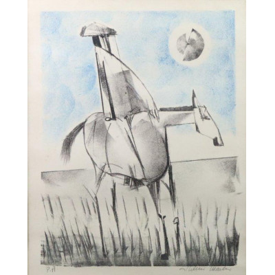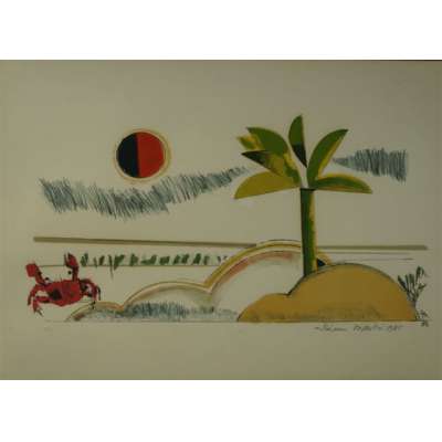 Aldemir Martins (Ingazeiras CE 1922 - São Paulo SP 2006). Pintor, gravador, desenhista, ilustrador. Em 1941, participa da criação do Centro Cultural de Belas Artes, em Fortaleza, com Antonio Bandeira (1922-1967), Raimundo Cela (1890-1954), Inimá de Paula (1918-1999) e Mario Baratta (1915-1983), um espaço para exposições permanentes e cursos de arte. Três anos depois, a instituição passa a chamar-se Sociedade Cearense de Artes Plásticas - SCAP. Aldemir Martins produz desenhos, xilogravuras, aquarelas e pinturas. Atua também como ilustrador na imprensa cearense. Em 1945, viaja para o Rio de Janeiro, e, menos de um ano depois, muda-se para São Paulo, onde realiza sua primeira individual e retoma a carreira de ilustrador. Entre 1949 e 1951, freqüenta os cursos do Museu de Arte de São Paulo Assis Chateaubriand - MASP e torna-se monitor da instituição. Estuda história da arte com Pietro Maria Bardi (1900-1999) e gravura com Poty Lazzarotto (1924-1998). Em 1959, recebe o prêmio de viagem ao exterior do Salão Nacional de Arte Moderna e permanece por dois anos na Itália. Desde o início da carreira sua produção é figurativa, e o artista emprega um repertório formal constantemente retomado: aves, sobretudo os galos; cangaceiros, inspirados nas figuras de cerâmica popular; gatos, realizados com linhas sinuosas; e ainda flores e frutas. Nas pinturas emprega cores intensas e contrastantes.