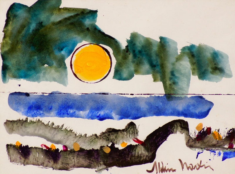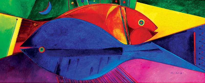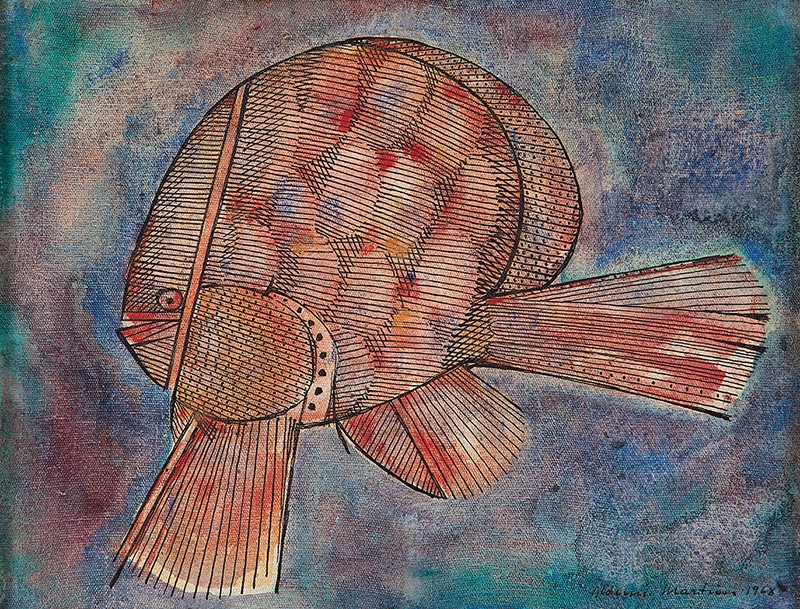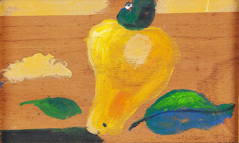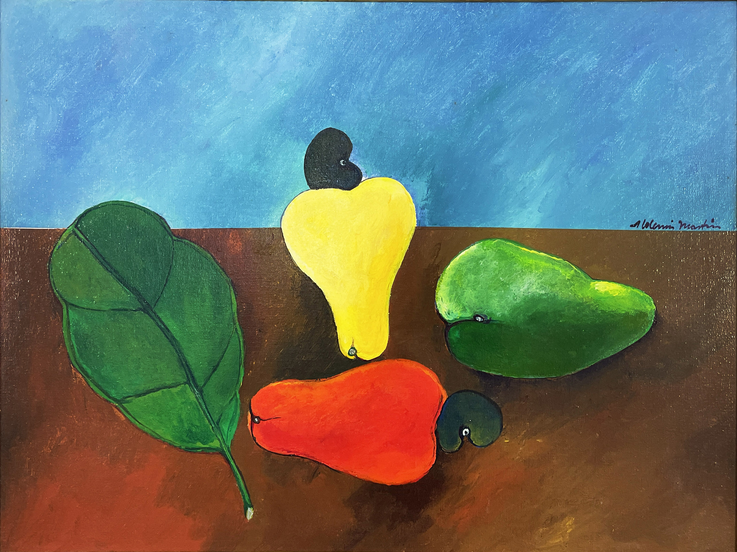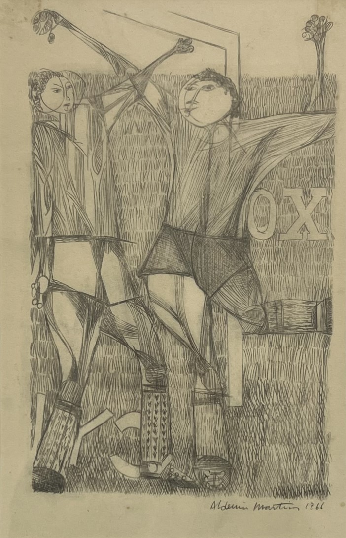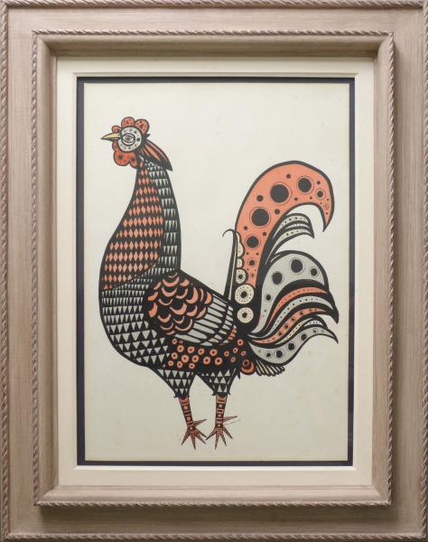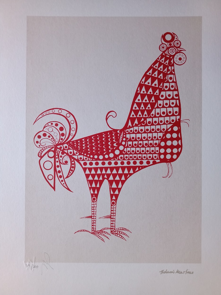Aldemir Martins (Ingazeiras CE 1922 - São Paulo SP 2006). Pintor, gravador, desenhista, ilustrador. Em 1941, participa da criação do Centro Cultural de Belas Artes, em Fortaleza, com Antonio Bandeira (1922-1967), Raimundo Cela (1890-1954), Inimá de Paula (1918-1999) e Mario Baratta (1915-1983), um espaço para exposições permanentes e cursos de arte. Três anos depois, a instituição passa a chamar-se Sociedade Cearense de Artes Plásticas - SCAP. Aldemir Martins produz desenhos, xilogravuras, aquarelas e pinturas. Atua também como ilustrador na imprensa cearense. Em 1945, viaja para o Rio de Janeiro, e, menos de um ano depois, muda-se para São Paulo, onde realiza sua primeira individual e retoma a carreira de ilustrador. Entre 1949 e 1951, freqüenta os cursos do Museu de Arte de São Paulo Assis Chateaubriand - MASP e torna-se monitor da instituição. Estuda história da arte com Pietro Maria Bardi (1900-1999) e gravura com Poty Lazzarotto (1924-1998). Em 1959, recebe o prêmio de viagem ao exterior do Salão Nacional de Arte Moderna e permanece por dois anos na Itália. Desde o início da carreira sua produção é figurativa, e o artista emprega um repertório formal constantemente retomado: aves, sobretudo os galos; cangaceiros, inspirados nas figuras de cerâmica popular; gatos, realizados com linhas sinuosas; e ainda flores e frutas. Nas pinturas emprega cores intensas e contrastantes.