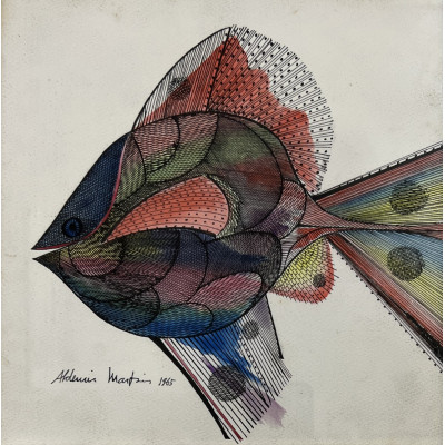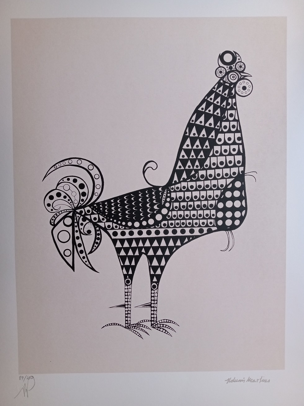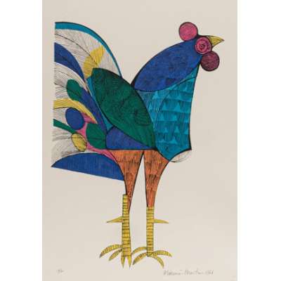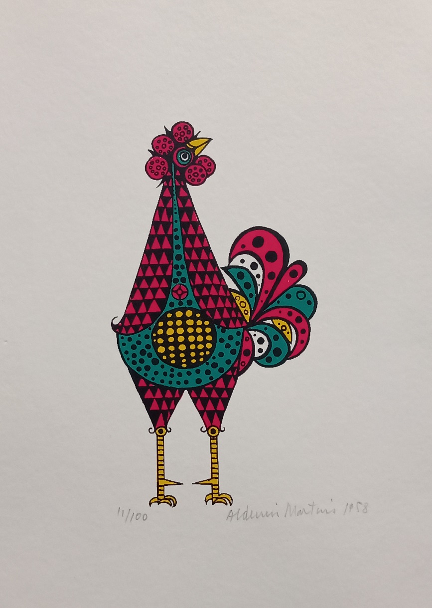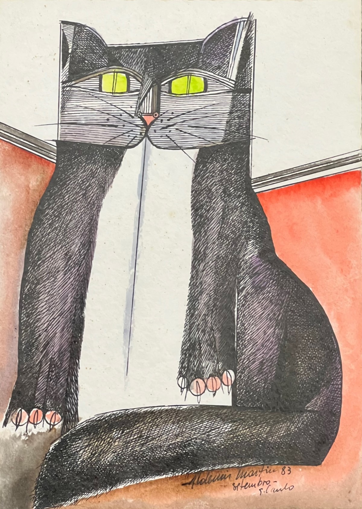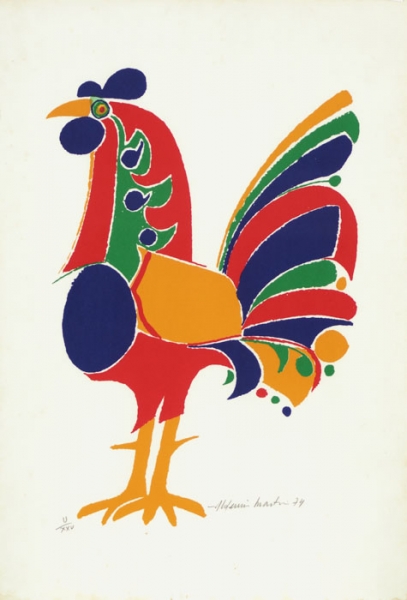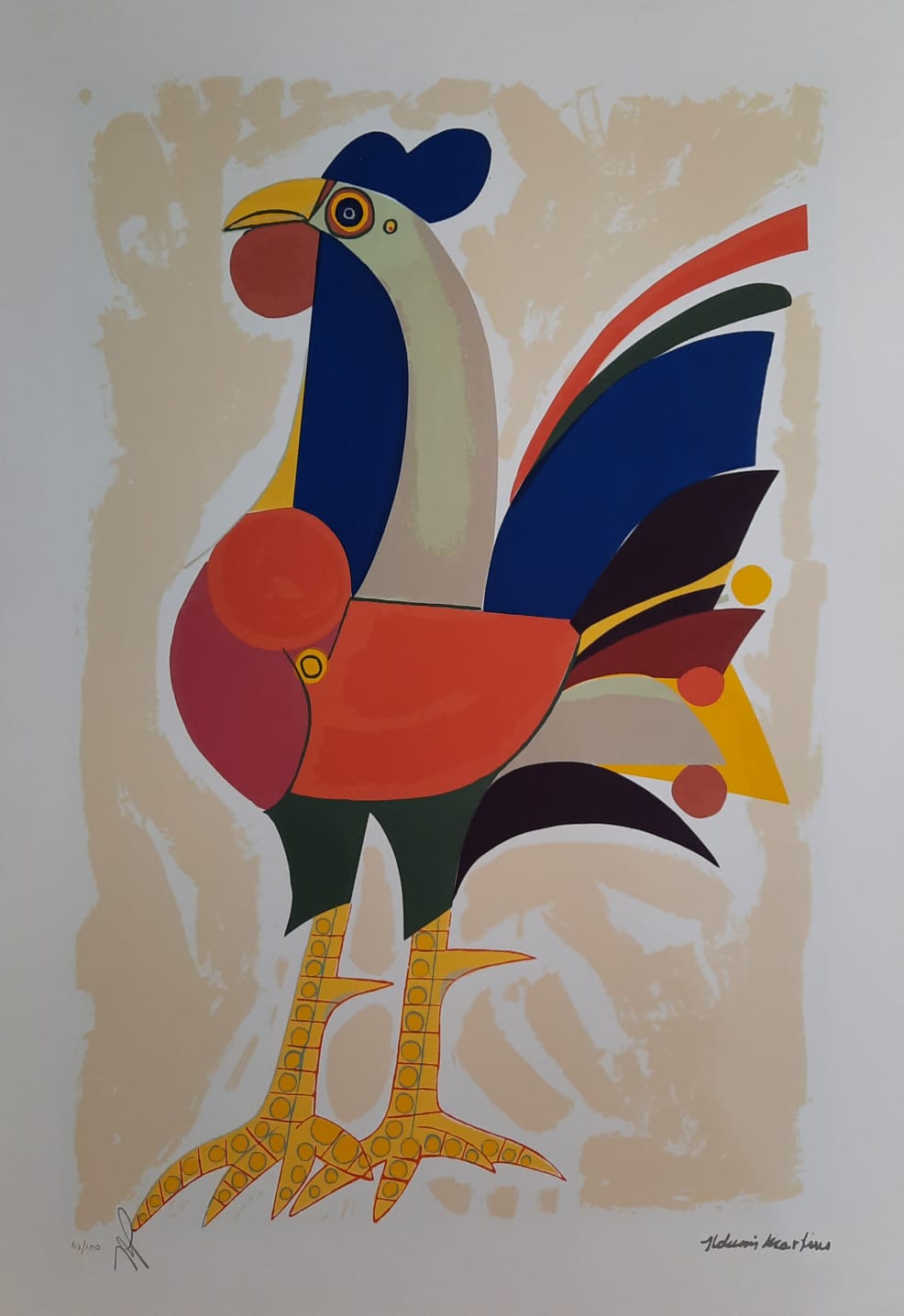 Aldemir Martins (Ingazeiras CE 1922 - São Paulo SP 2006). Pintor, gravador, desenhista, ilustrador. Em 1941, participa da criação do Centro Cultural de Belas Artes, em Fortaleza, com Antonio Bandeira (1922-1967), Raimundo Cela (1890-1954), Inimá de Paula (1918-1999) e Mario Baratta (1915-1983), um espaço para exposições permanentes e cursos de arte. Três anos depois, a instituição passa a chamar-se Sociedade Cearense de Artes Plásticas - SCAP. Aldemir Martins produz desenhos, xilogravuras, aquarelas e pinturas. Atua também como ilustrador na imprensa cearense. Em 1945, viaja para o Rio de Janeiro, e, menos de um ano depois, muda-se para São Paulo, onde realiza sua primeira individual e retoma a carreira de ilustrador. Entre 1949 e 1951, freqüenta os cursos do Museu de Arte de São Paulo Assis Chateaubriand - MASP e torna-se monitor da instituição. Estuda história da arte com Pietro Maria Bardi (1900-1999) e gravura com Poty Lazzarotto (1924-1998). Em 1959, recebe o prêmio de viagem ao exterior do Salão Nacional de Arte Moderna e permanece por dois anos na Itália. Desde o início da carreira sua produção é figurativa, e o artista emprega um repertório formal constantemente retomado: aves, sobretudo os galos; cangaceiros, inspirados nas figuras de cerâmica popular; gatos, realizados com linhas sinuosas; e ainda flores e frutas. Nas pinturas emprega cores intensas e contrastantes.