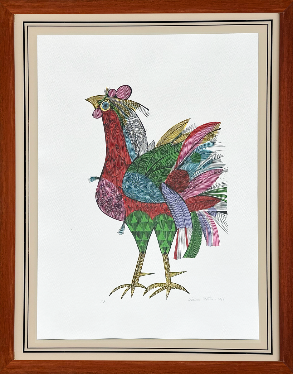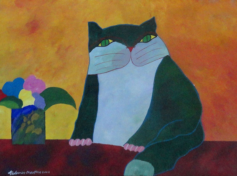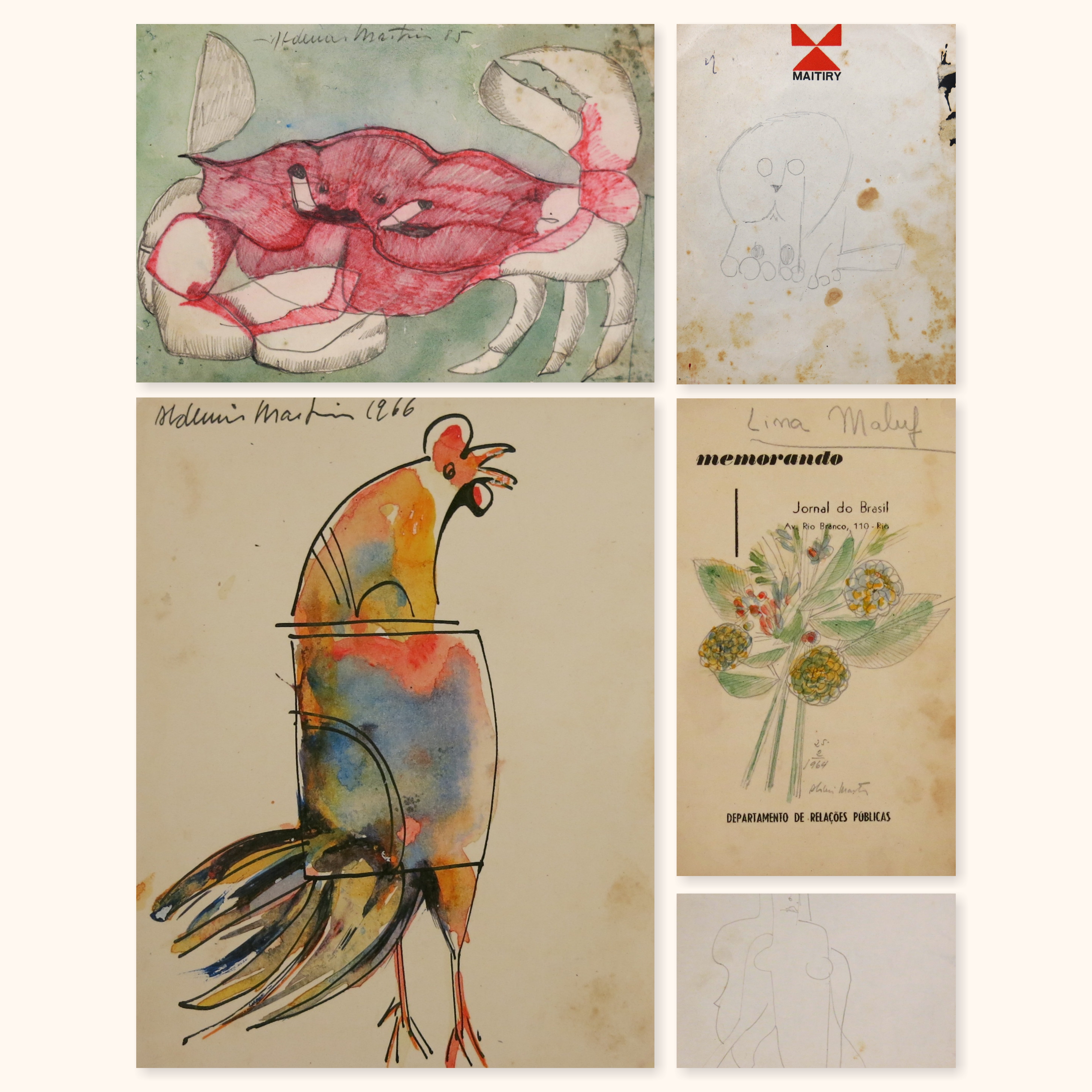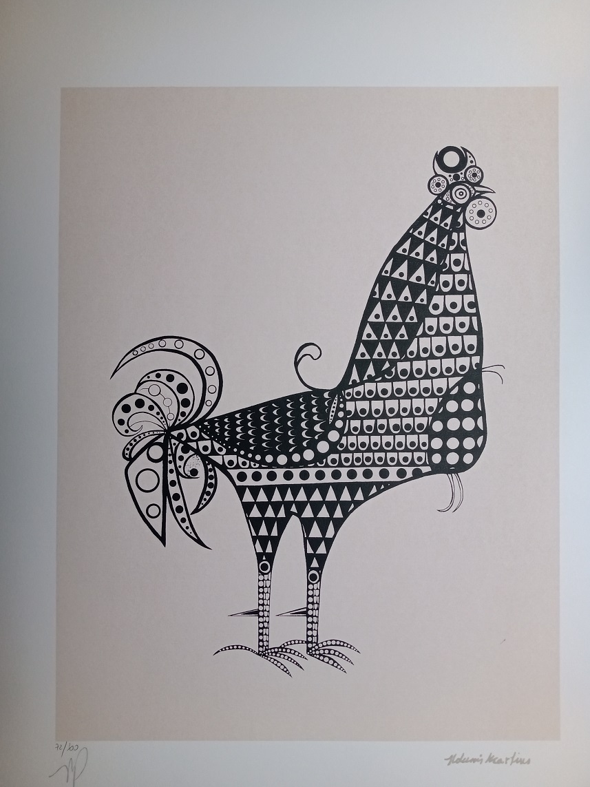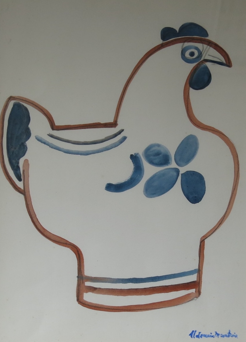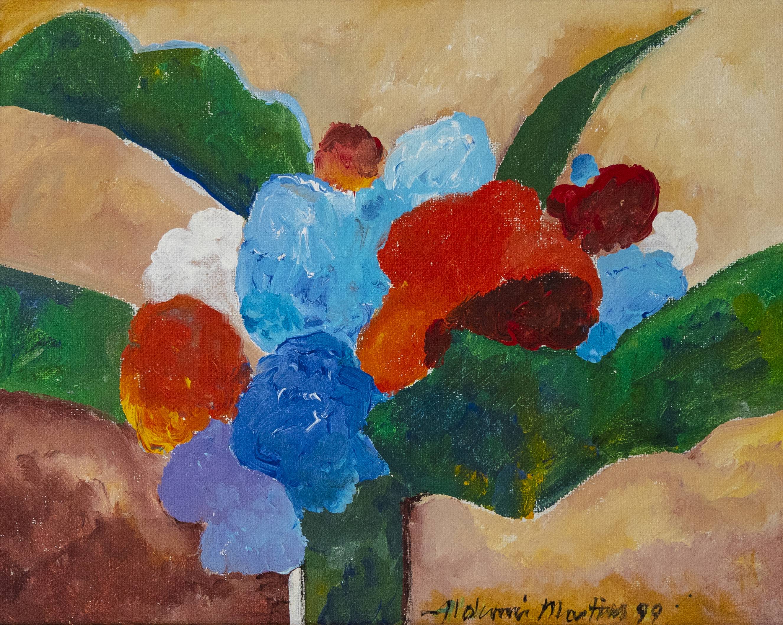 Aldemir Martins (Ingazeiras CE 1922 - São Paulo SP 2006). Pintor, gravador, desenhista, ilustrador. Em 1941, participa da criação do Centro Cultural de Belas Artes, em Fortaleza, com Antonio Bandeira (1922-1967), Raimundo Cela (1890-1954), Inimá de Paula (1918-1999) e Mario Baratta (1915-1983), um espaço para exposições permanentes e cursos de arte. Três anos depois, a instituição passa a chamar-se Sociedade Cearense de Artes Plásticas - SCAP. Aldemir Martins produz desenhos, xilogravuras, aquarelas e pinturas. Atua também como ilustrador na imprensa cearense. Em 1945, viaja para o Rio de Janeiro, e, menos de um ano depois, muda-se para São Paulo, onde realiza sua primeira individual e retoma a carreira de ilustrador. Entre 1949 e 1951, freqüenta os cursos do Museu de Arte de São Paulo Assis Chateaubriand - MASP e torna-se monitor da instituição. Estuda história da arte com Pietro Maria Bardi (1900-1999) e gravura com Poty Lazzarotto (1924-1998). Em 1959, recebe o prêmio de viagem ao exterior do Salão Nacional de Arte Moderna e permanece por dois anos na Itália. Desde o início da carreira sua produção é figurativa, e o artista emprega um repertório formal constantemente retomado: aves, sobretudo os galos; cangaceiros, inspirados nas figuras de cerâmica popular; gatos, realizados com linhas sinuosas; e ainda flores e frutas. Nas pinturas emprega cores intensas e contrastantes.