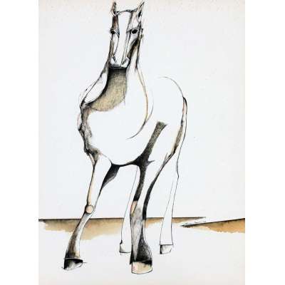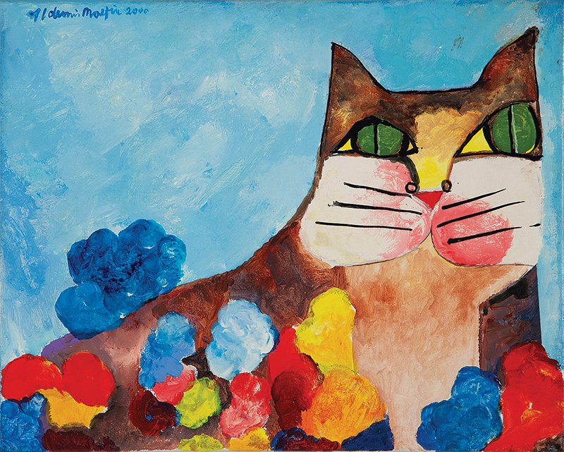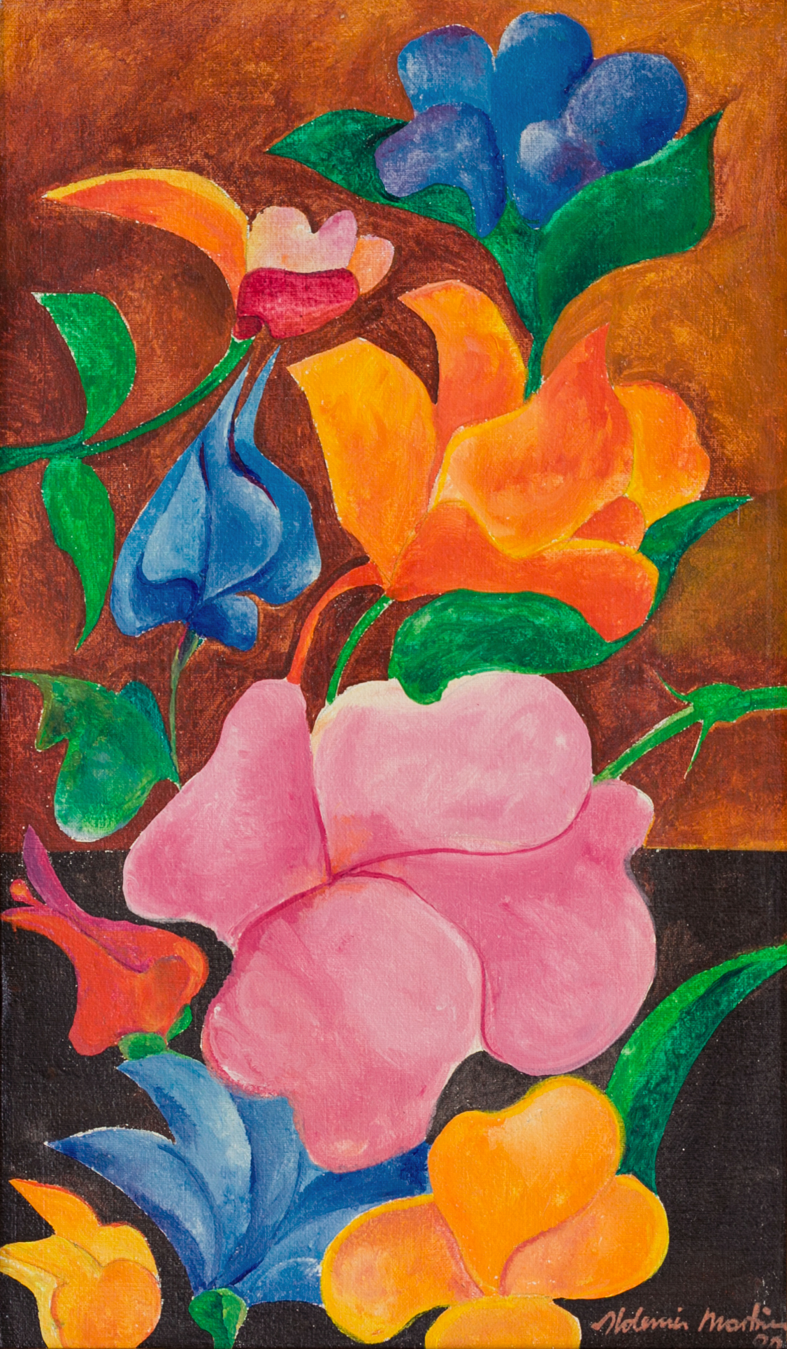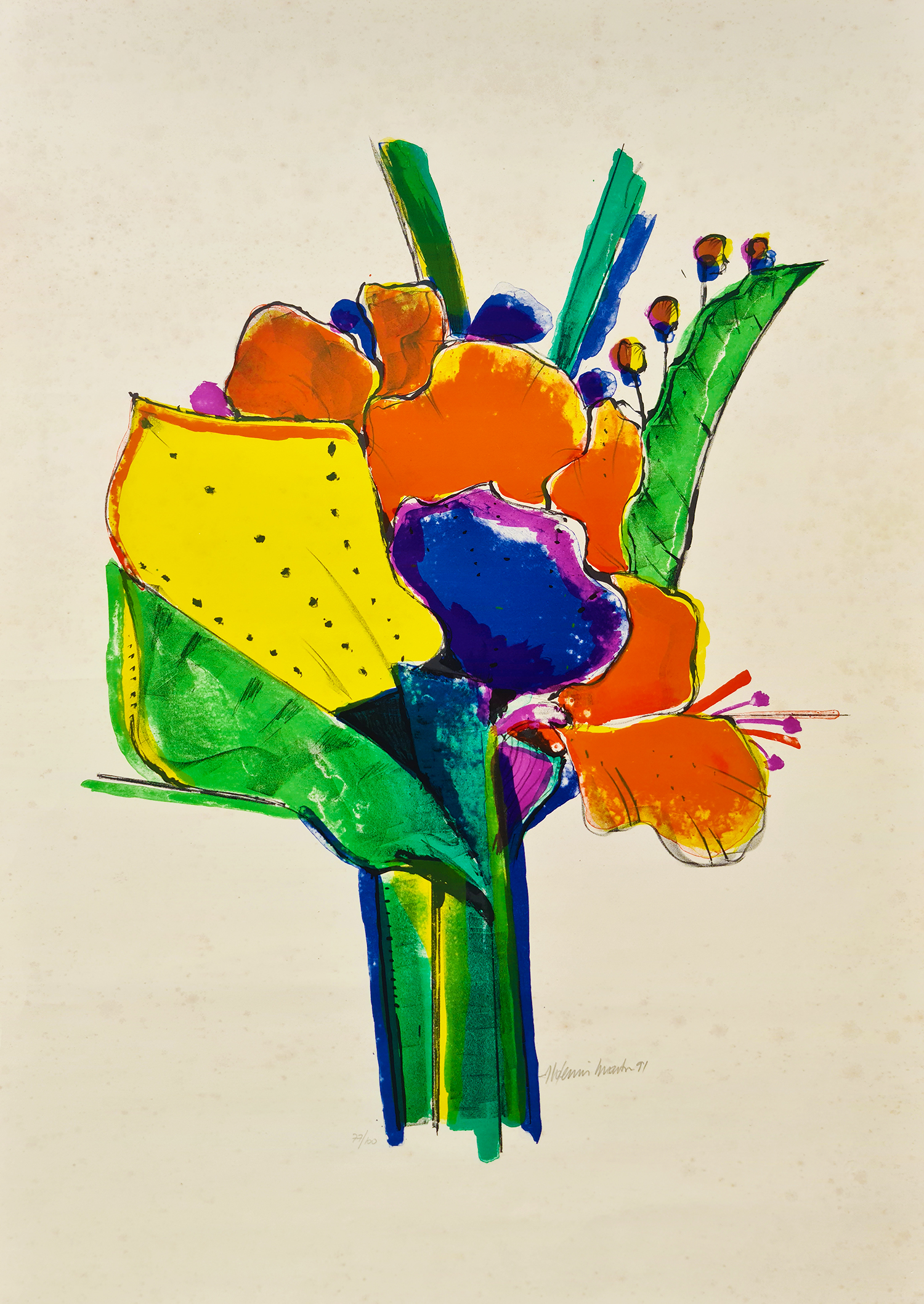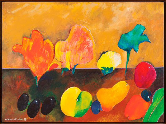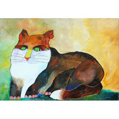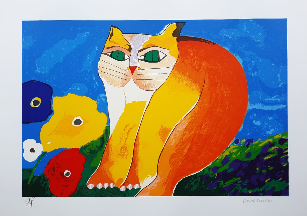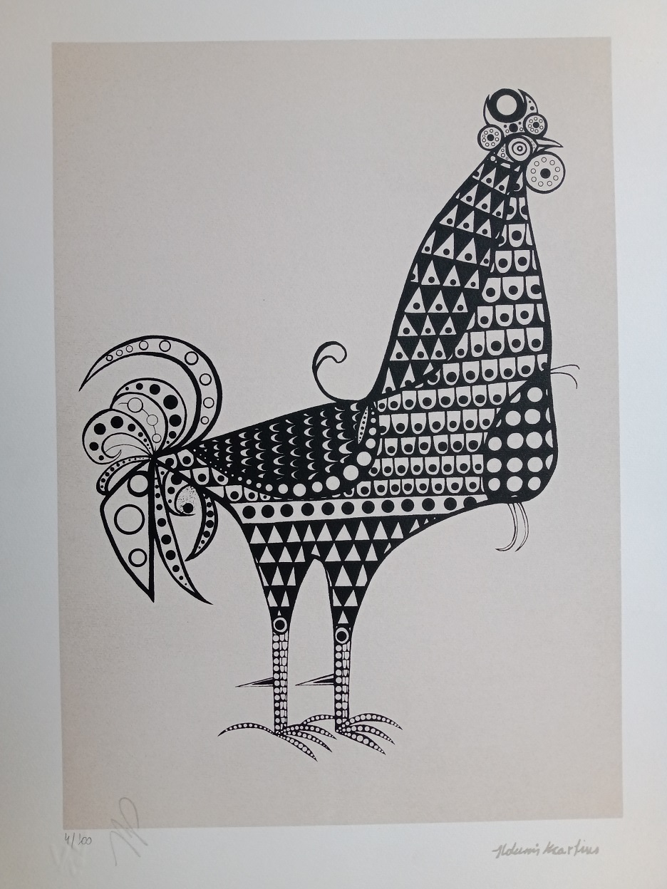 Aldemir Martins (Ingazeiras CE 1922 - São Paulo SP 2006). Pintor, gravador, desenhista, ilustrador. Em 1941, participa da criação do Centro Cultural de Belas Artes, em Fortaleza, com Antonio Bandeira (1922-1967), Raimundo Cela (1890-1954), Inimá de Paula (1918-1999) e Mario Baratta (1915-1983), um espaço para exposições permanentes e cursos de arte. Três anos depois, a instituição passa a chamar-se Sociedade Cearense de Artes Plásticas - SCAP. Aldemir Martins produz desenhos, xilogravuras, aquarelas e pinturas. Atua também como ilustrador na imprensa cearense. Em 1945, viaja para o Rio de Janeiro, e, menos de um ano depois, muda-se para São Paulo, onde realiza sua primeira individual e retoma a carreira de ilustrador. Entre 1949 e 1951, freqüenta os cursos do Museu de Arte de São Paulo Assis Chateaubriand - MASP e torna-se monitor da instituição. Estuda história da arte com Pietro Maria Bardi (1900-1999) e gravura com Poty Lazzarotto (1924-1998). Em 1959, recebe o prêmio de viagem ao exterior do Salão Nacional de Arte Moderna e permanece por dois anos na Itália. Desde o início da carreira sua produção é figurativa, e o artista emprega um repertório formal constantemente retomado: aves, sobretudo os galos; cangaceiros, inspirados nas figuras de cerâmica popular; gatos, realizados com linhas sinuosas; e ainda flores e frutas. Nas pinturas emprega cores intensas e contrastantes.