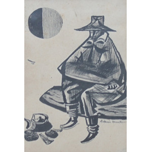 ALDEMIR MARTINS - Mulher rendeira - mista sobre papel - CID - Dat. 1987 - 59 x 41 cm. (Papel manchado)