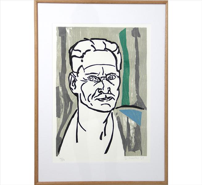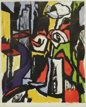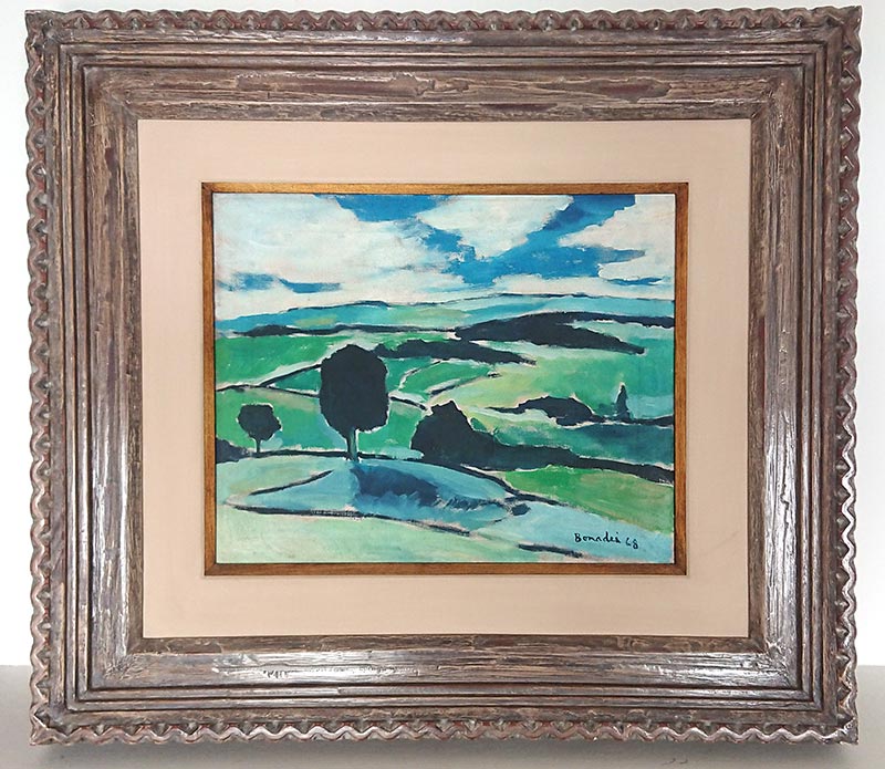 Aldo Bonadei - Paisagem com vaso de flores - 58-100. Xilogravura, 45x35 cm, 1971, A.C.I.D. a lápis. Com moldura