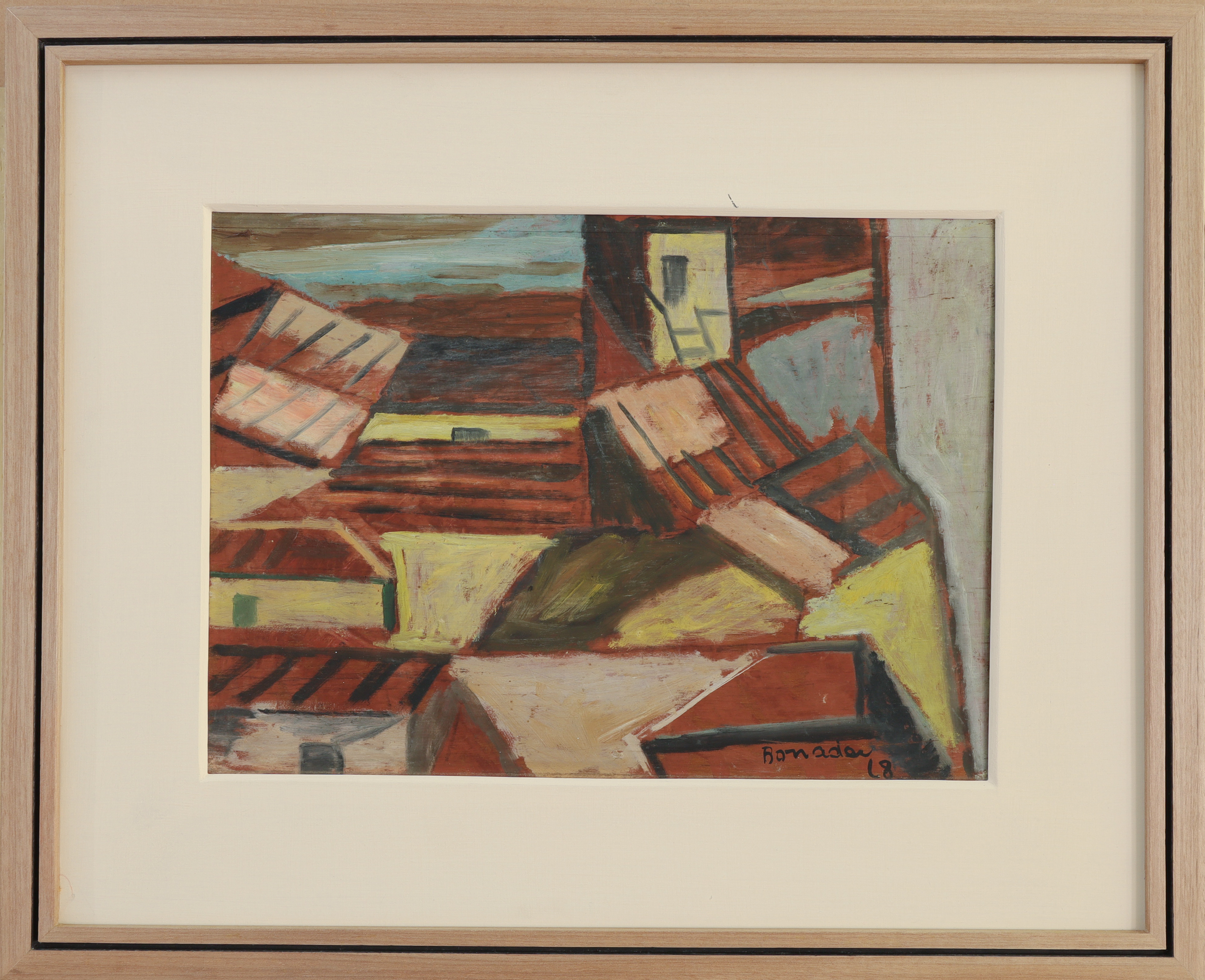 Aldo Bonadei - Paisagem com vaso de flores - 58-100. Xilogravura, 45x35 cm, 1971, A.C.I.D. a lápis. Com moldura