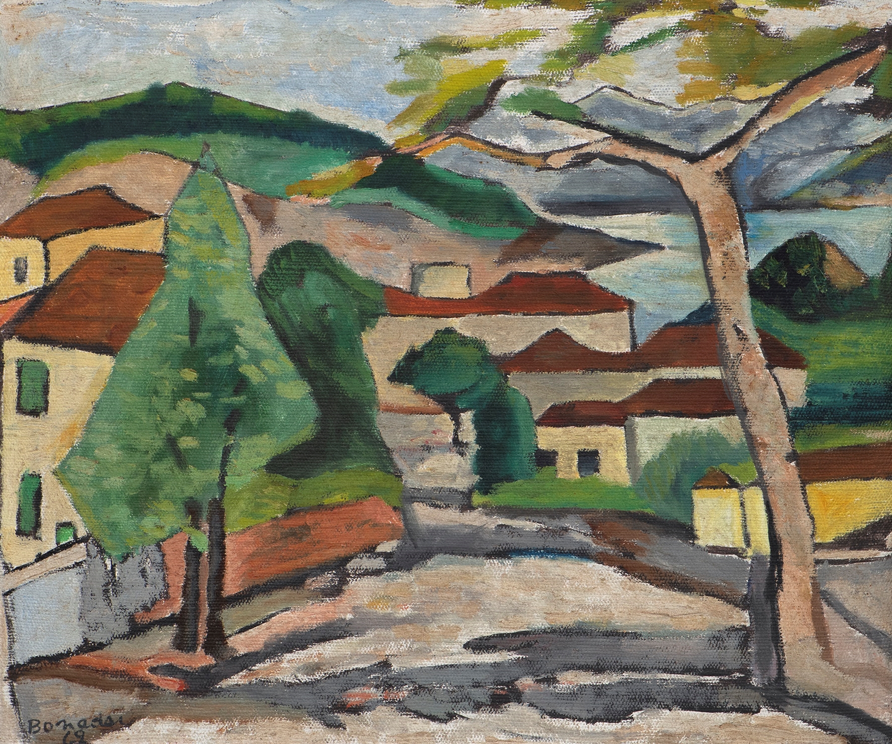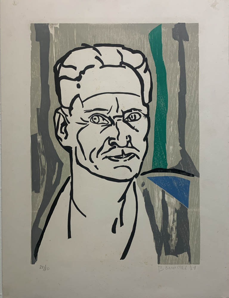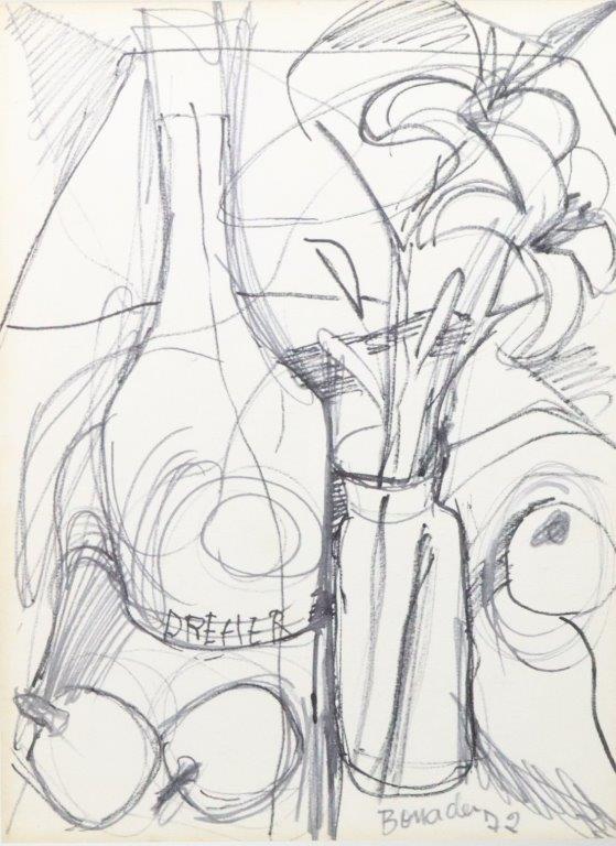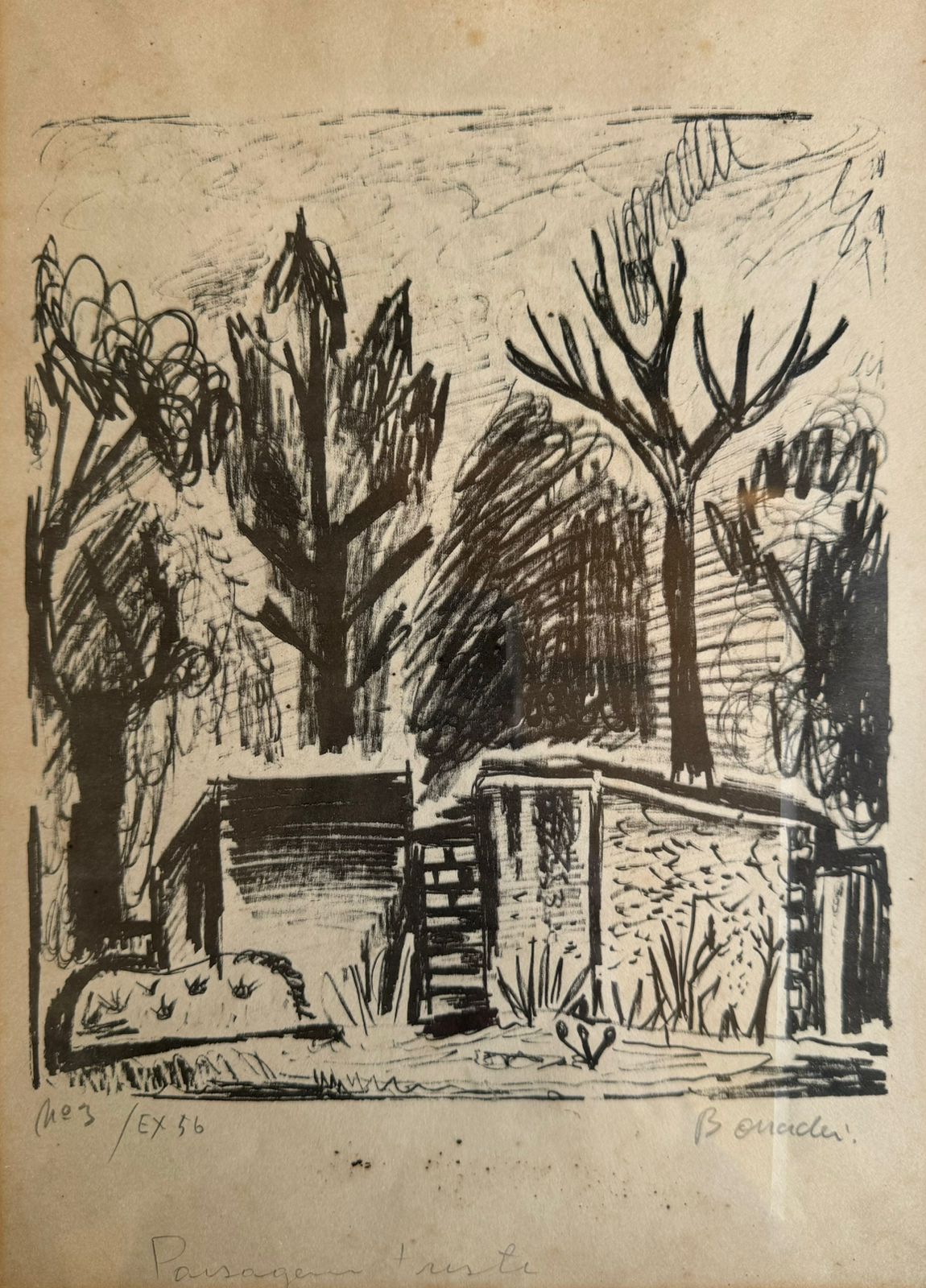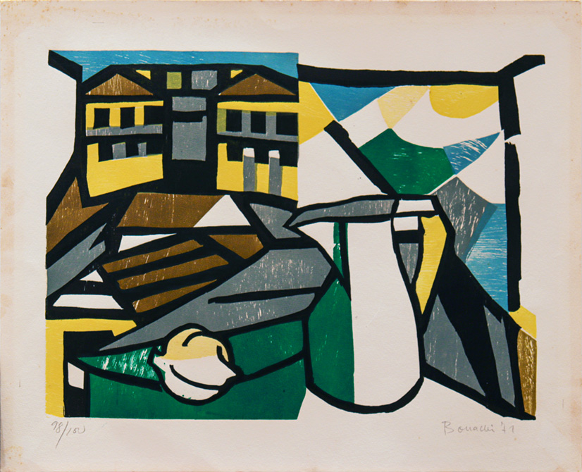 Aldo Bonadei - Paisagem com vaso de flores - 58-100. Xilogravura, 45x35 cm, 1971, A.C.I.D. a lápis. Com moldura