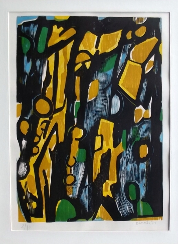Aldo Bonadei - Paisagem com vaso de flores - 58-100. Xilogravura, 45x35 cm, 1971, A.C.I.D. a lápis. Com moldura