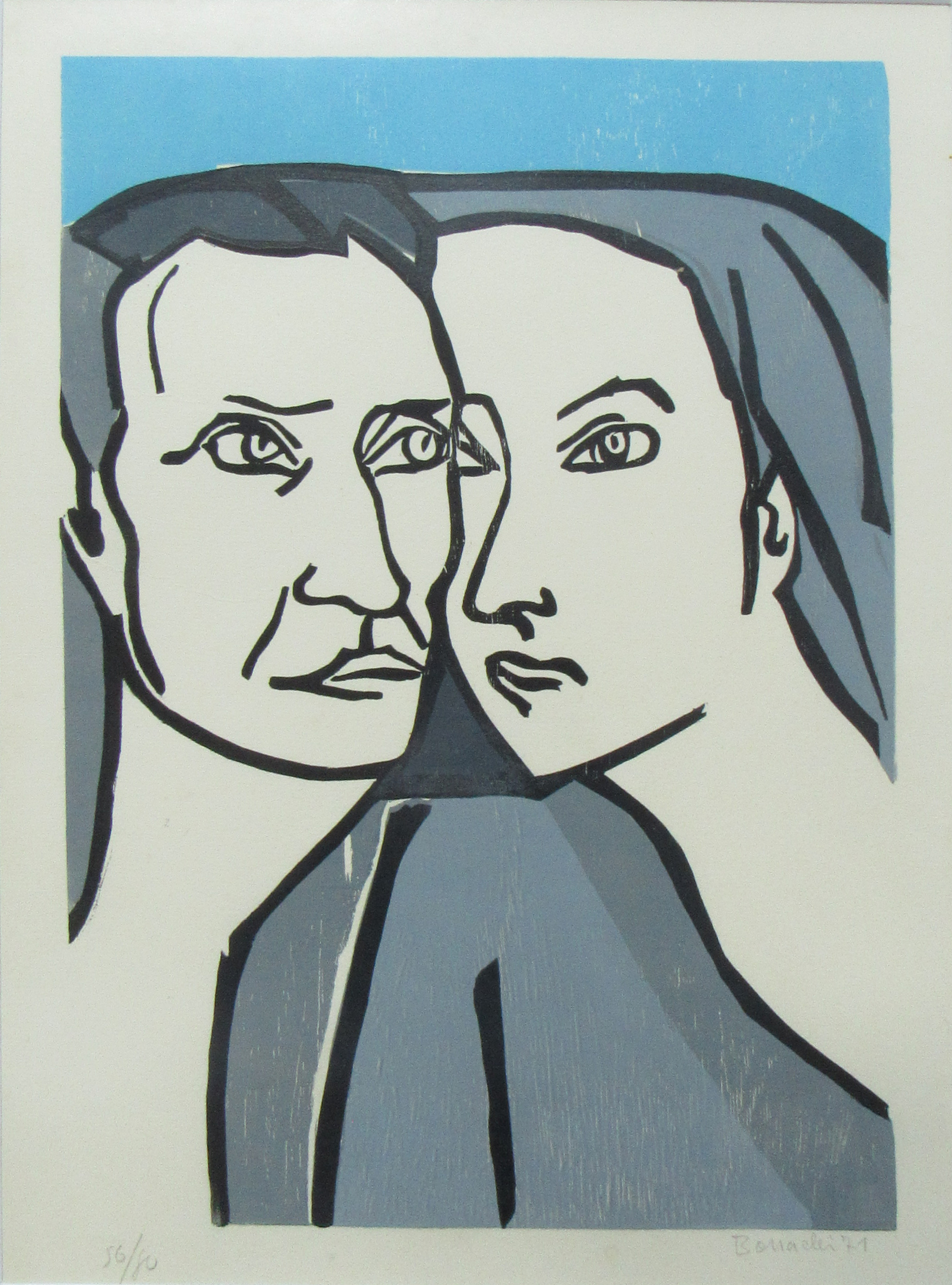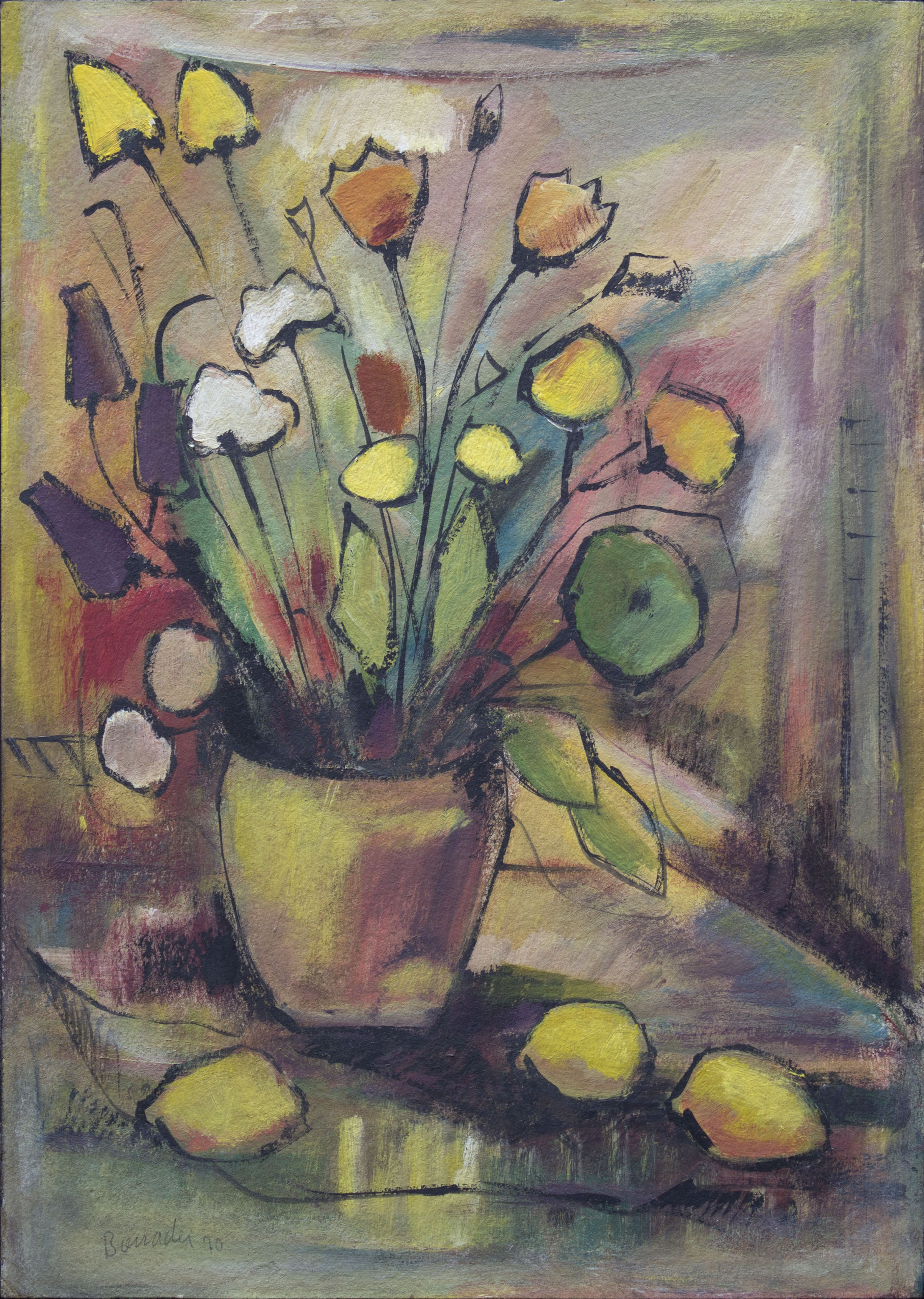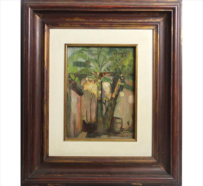 Aldo Bonadei - Paisagem com vaso de flores - 58-100. Xilogravura, 45x35 cm, 1971, A.C.I.D. a lápis. Com moldura
