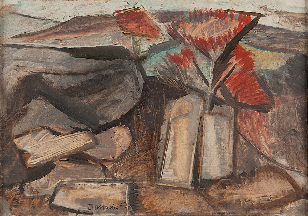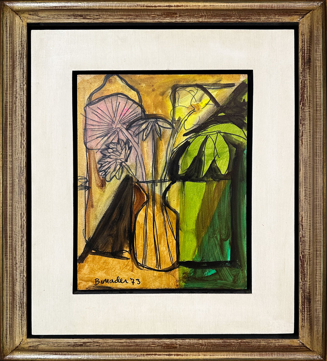 Aldo Bonadei - Paisagem com vaso de flores - 58-100. Xilogravura, 45x35 cm, 1971, A.C.I.D. a lápis. Com moldura