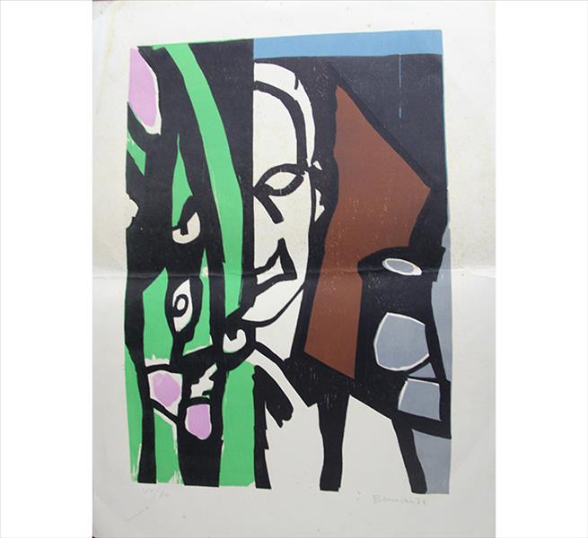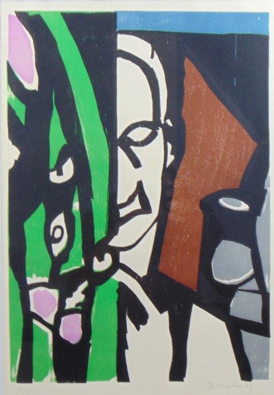 Aldo Bonadei - Paisagem com vaso de flores - 58-100. Xilogravura, 45x35 cm, 1971, A.C.I.D. a lápis. Com moldura