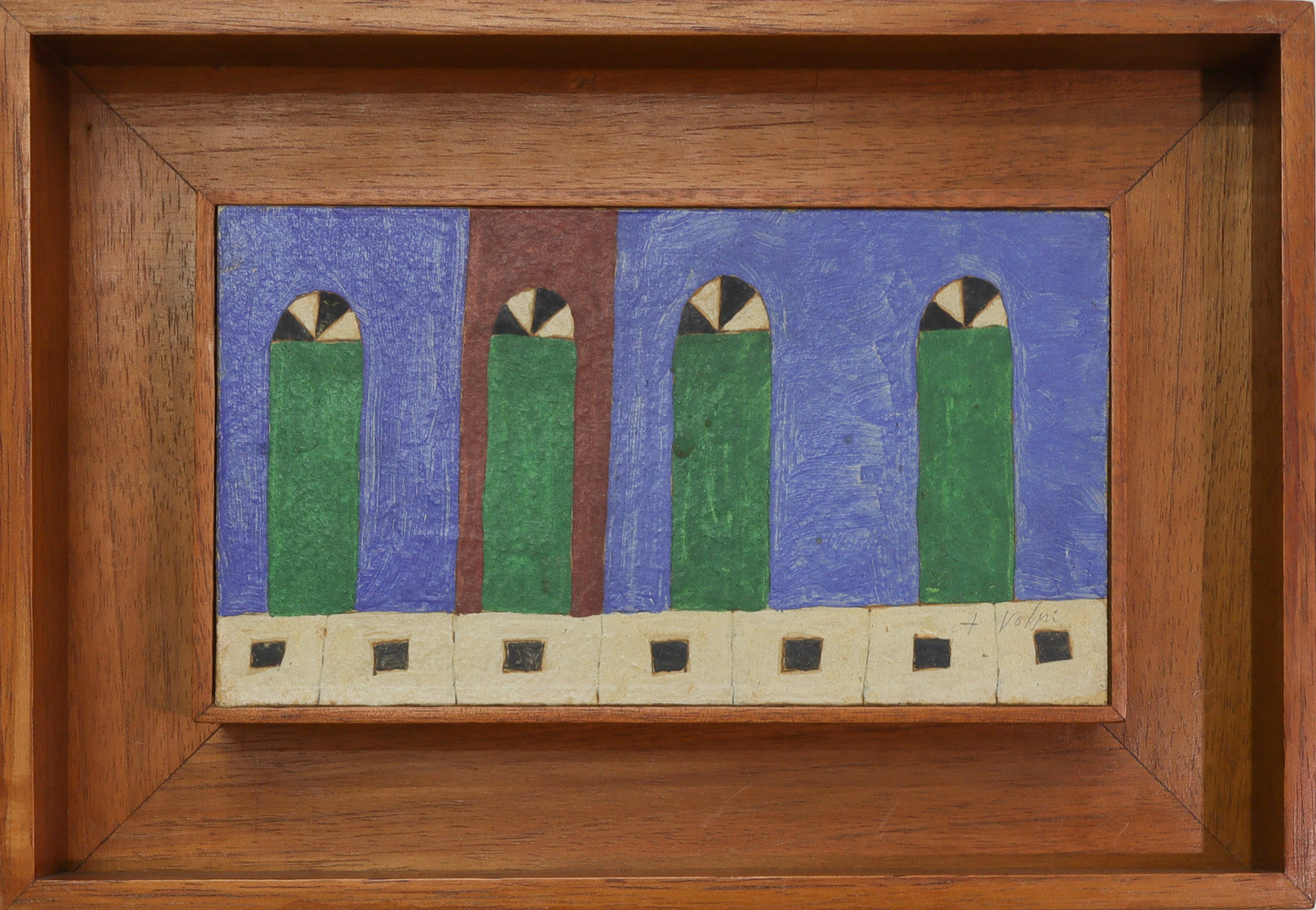 Alfredo Volpi (Lucca Itália 1896 - São Paulo SP 1988). Pintor. Muda-se com os pais para São Paulo em 1897 e, ainda criança, estuda na Escola Profissional Masculina do Brás. Mais tarde trabalha como marceneiro, entalhador e encadernador. Em 1911, torna-se pintor decorador e começa a pintar sobre madeiras e telas. Na década de 1930 passa a fazer parte do Grupo Santa Helena com vários artistas, como Mário Zanini e Francisco Rebolo, entre outros. Em 1936, participa da formação do Sindicato dos Artistas Plásticos de São Paulo e integra, em 1937, a Família Artística Paulista - FAP. Sua produção inicial é figurativa, destacando-se marinhas executadas em Itanhaém, São Paulo. No fim dos anos de 1930, mantém contato com o pintor Emídio de Souza. Em 1940, ganha o concurso promovido pelo Instituto do Patrimônio Histórico e Artístico Nacional - IPHAN, com trabalhos realizados com base nos monumentos das cidades de São Miguel e Embu e encanta-se com a arte colonial, voltando-se para temas populares e religiosos. Realiza trabalhos para a Osirarte, empresa de azulejaria criada em 1940, por Rossi Osir. Sua primeira exposição individual ocorre em São Paulo, na Galeria Itá, em 1944. Em 1950, viaja para a Europa acompanhado de Rossi Osir e Mario Zanini, quando impressiona-se com obras pré-renascentistas. Passa a executar, a partir da década de 1950, composições que gradativamente caminham para a abstração. É convidado a participar, em 1956 e 1957, dasExposições Nacionais de Arte Concreta e mantém contato com artistas e poetas do grupo concreto. Recebe, em 1953, o prêmio de Melhor Pintor Nacional da Bienal Internacional de São Paulo, dividido com Di Cavalcanti; em 1958, o Prêmio Guggenheim; em 1962 e 1966, o de melhor pintor brasileiro pela crítica de arte do Rio de Janeiro, entre outros.